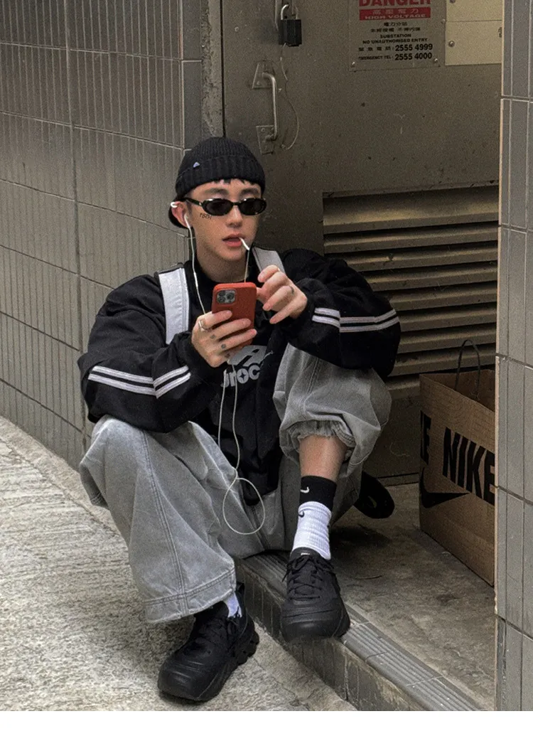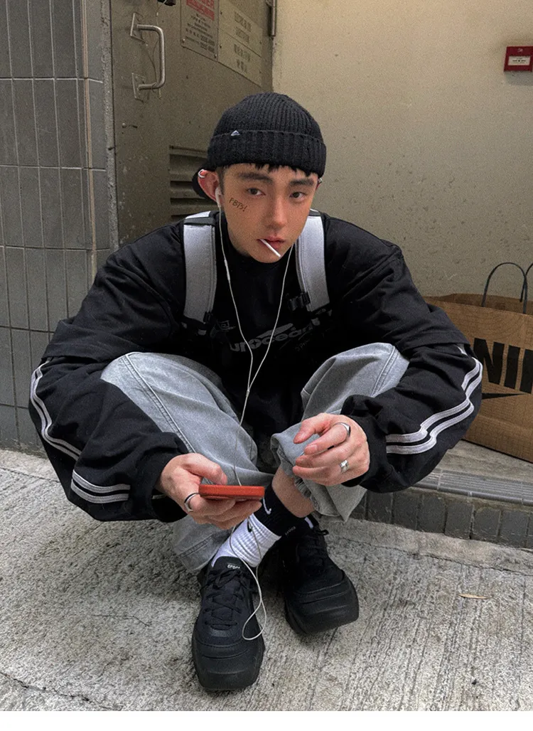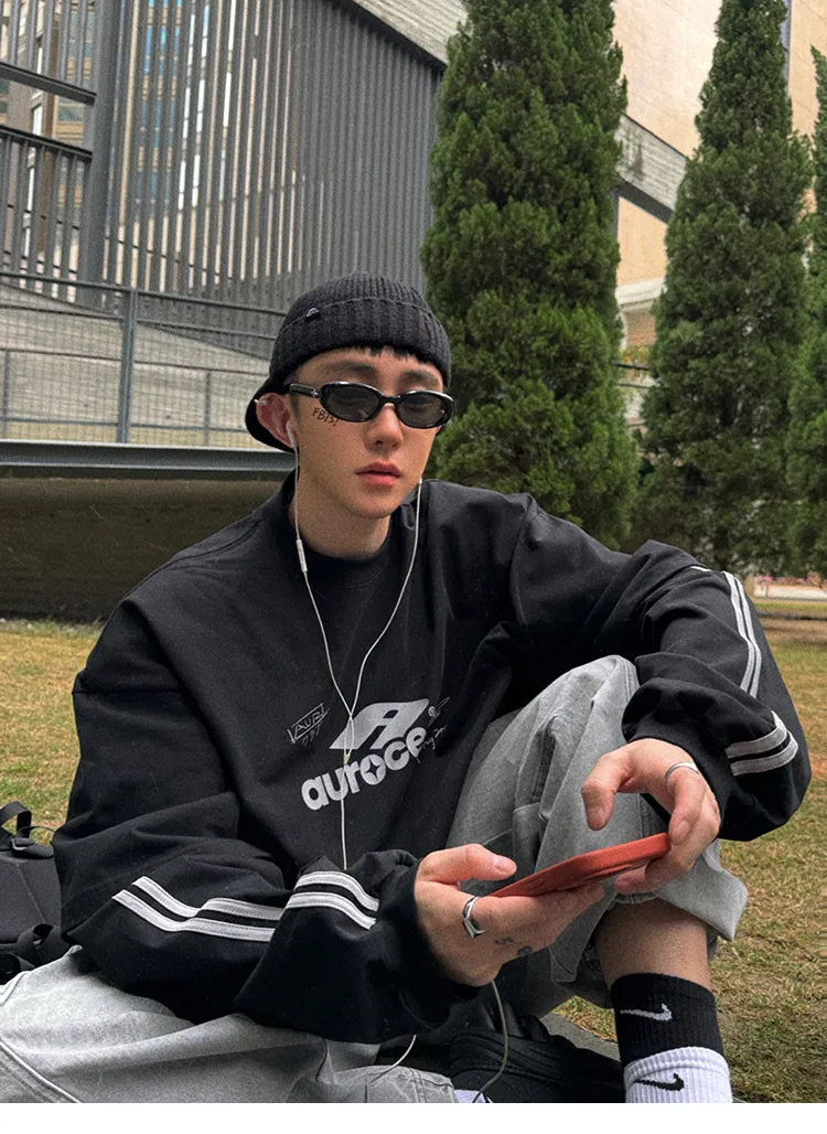AUROCEAN 奶藍條紋 日系少年 OS 長袖(黑色)