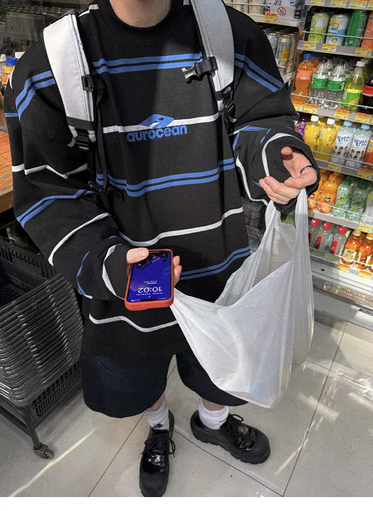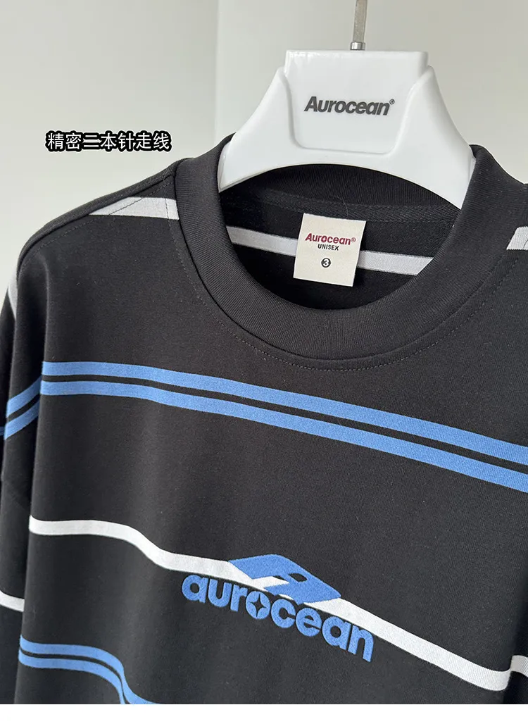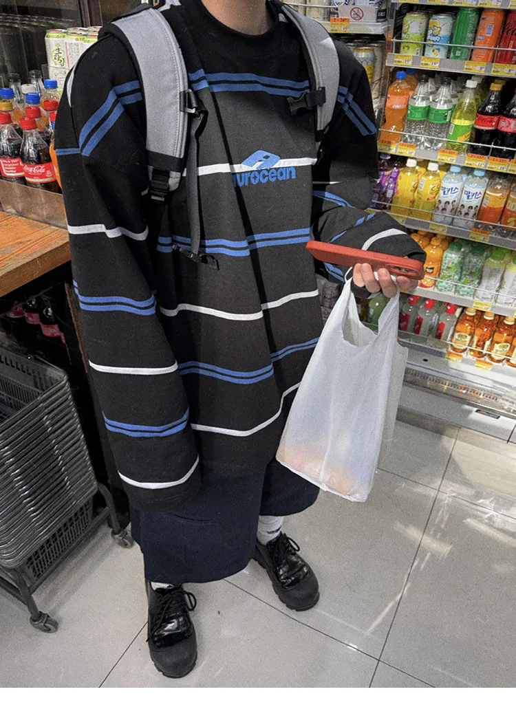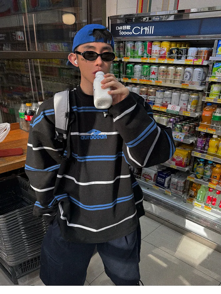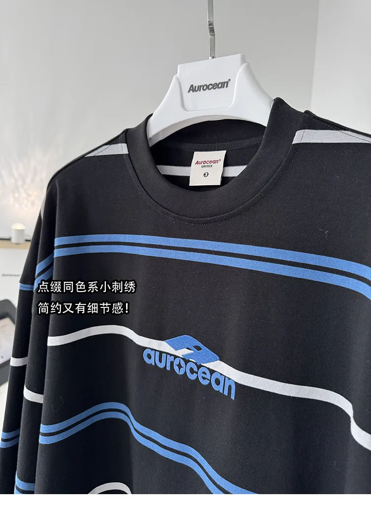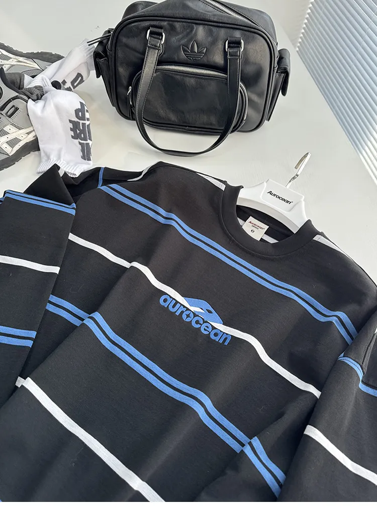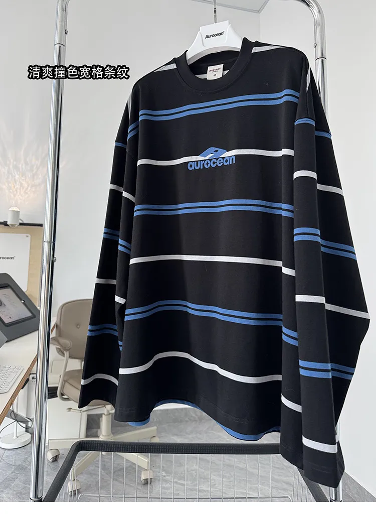 AUROCEAN 奶藍條紋 日系少年 OS 長袖(黑色)