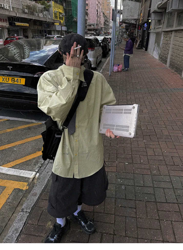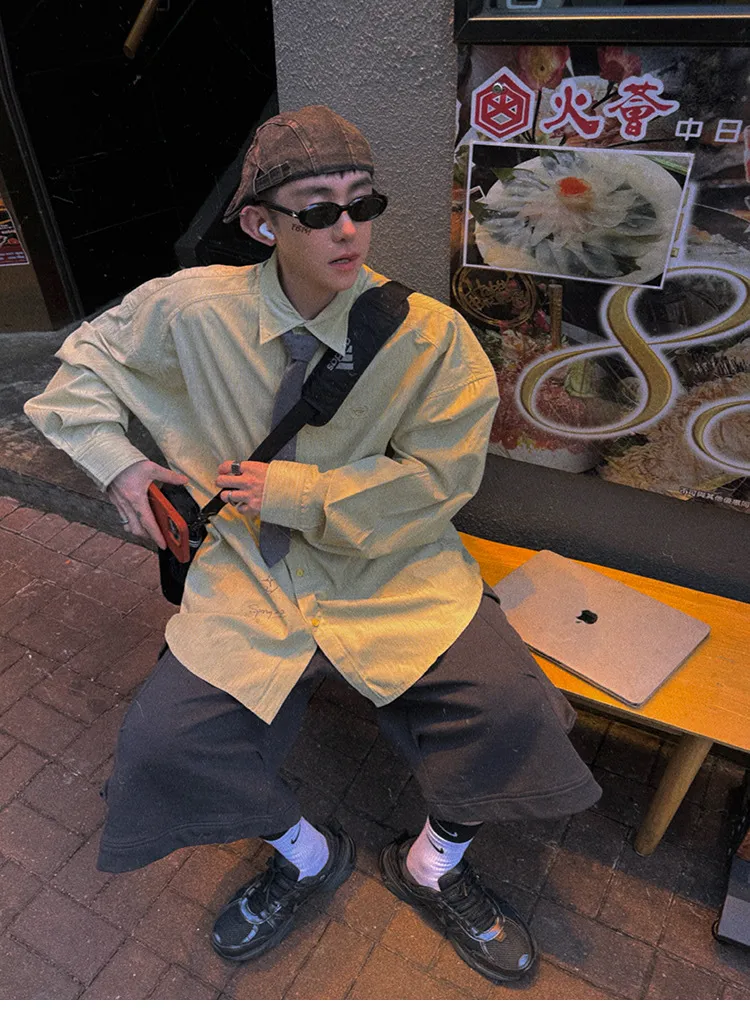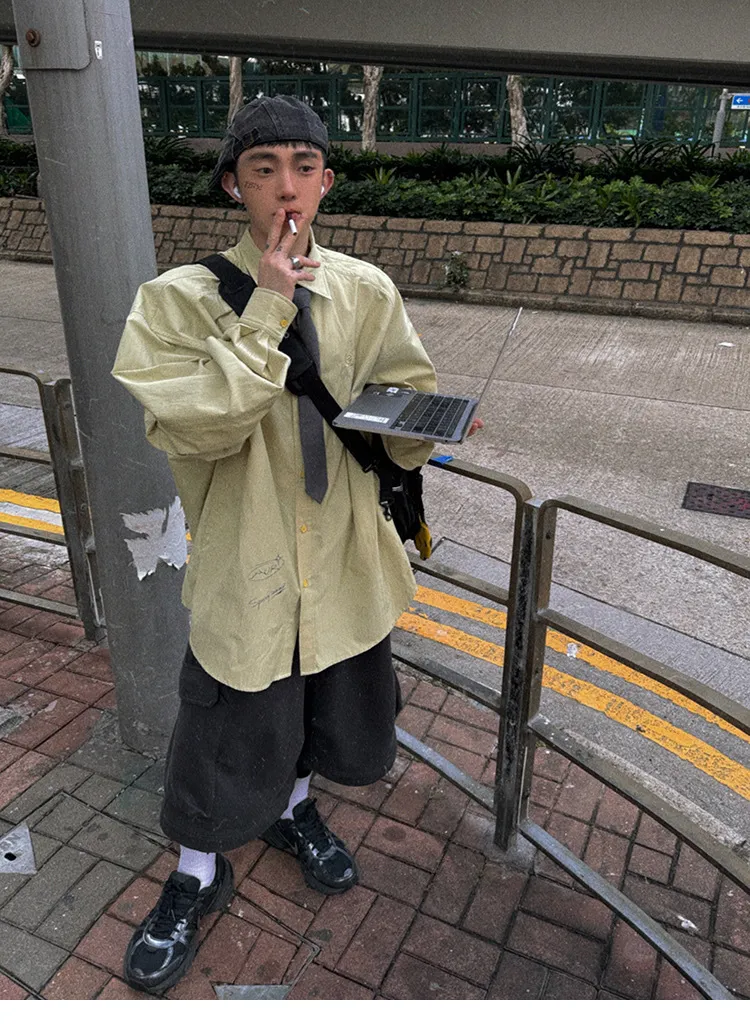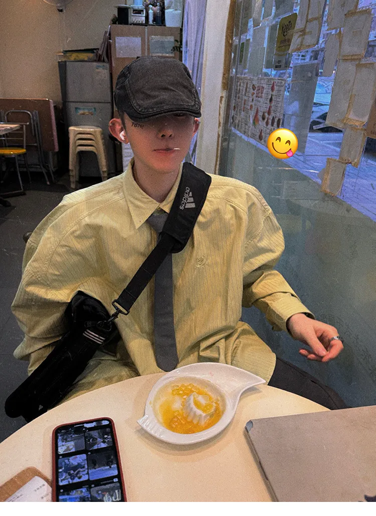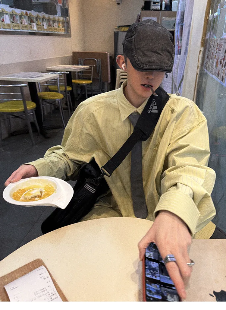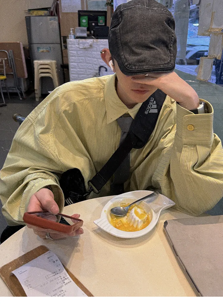 AUROCEAN 學院條紋 手繪塗鴉 OS 襯衫(淺黃色)