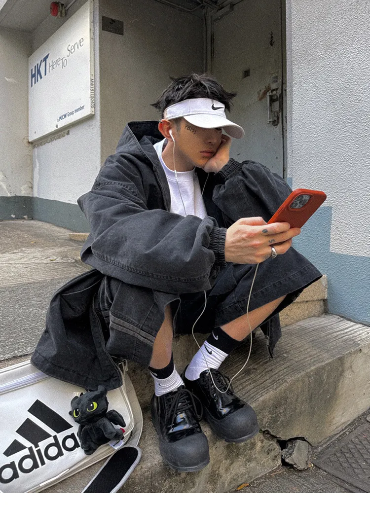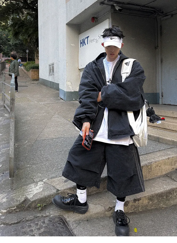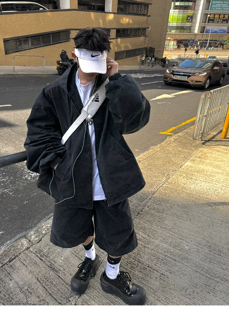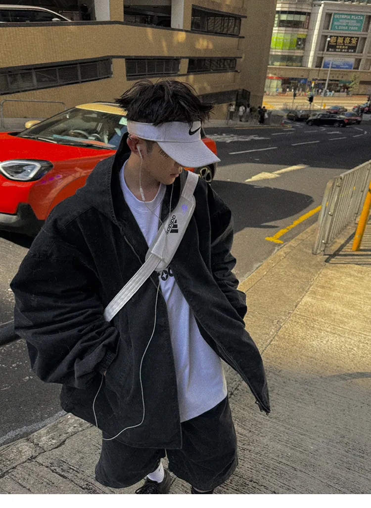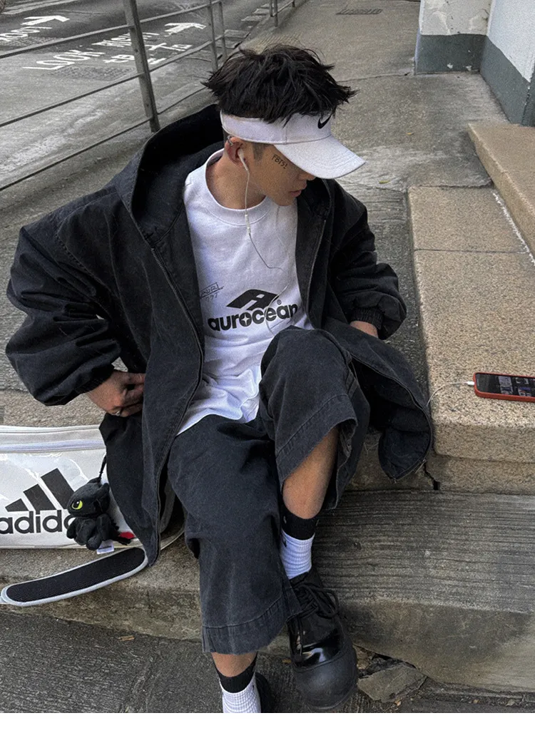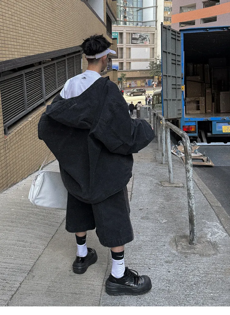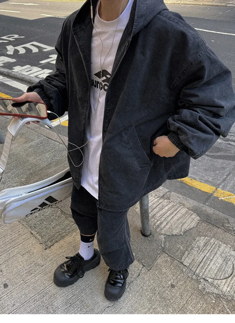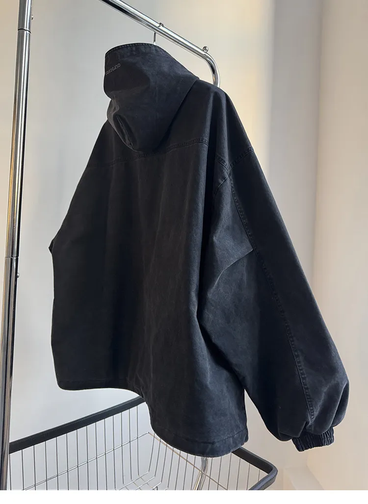 AUROCEAN 寬短 連帽 重磅 外套(水洗黑)