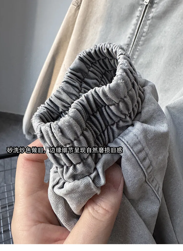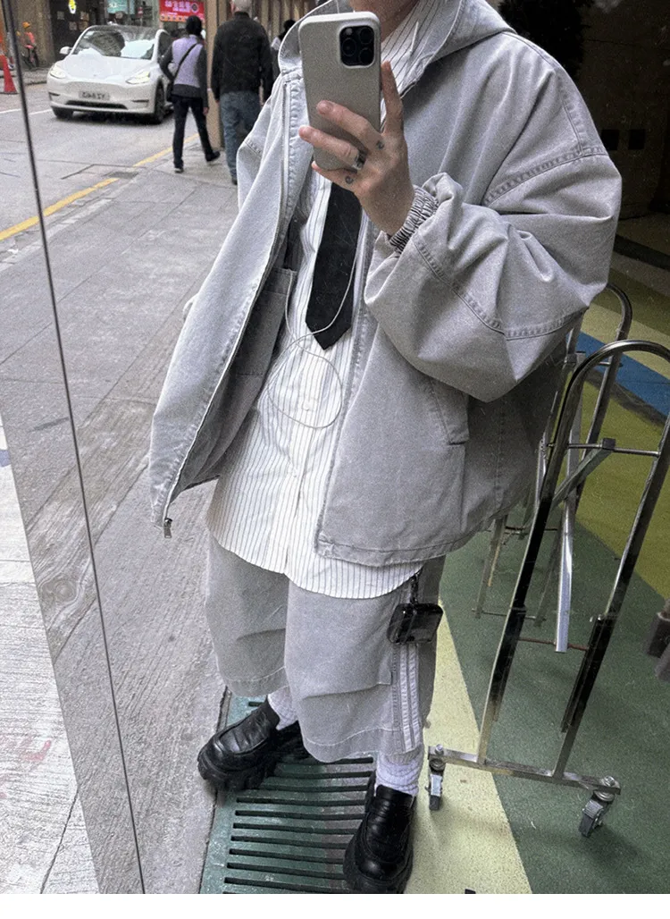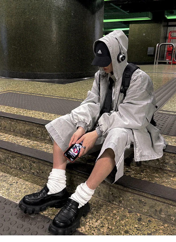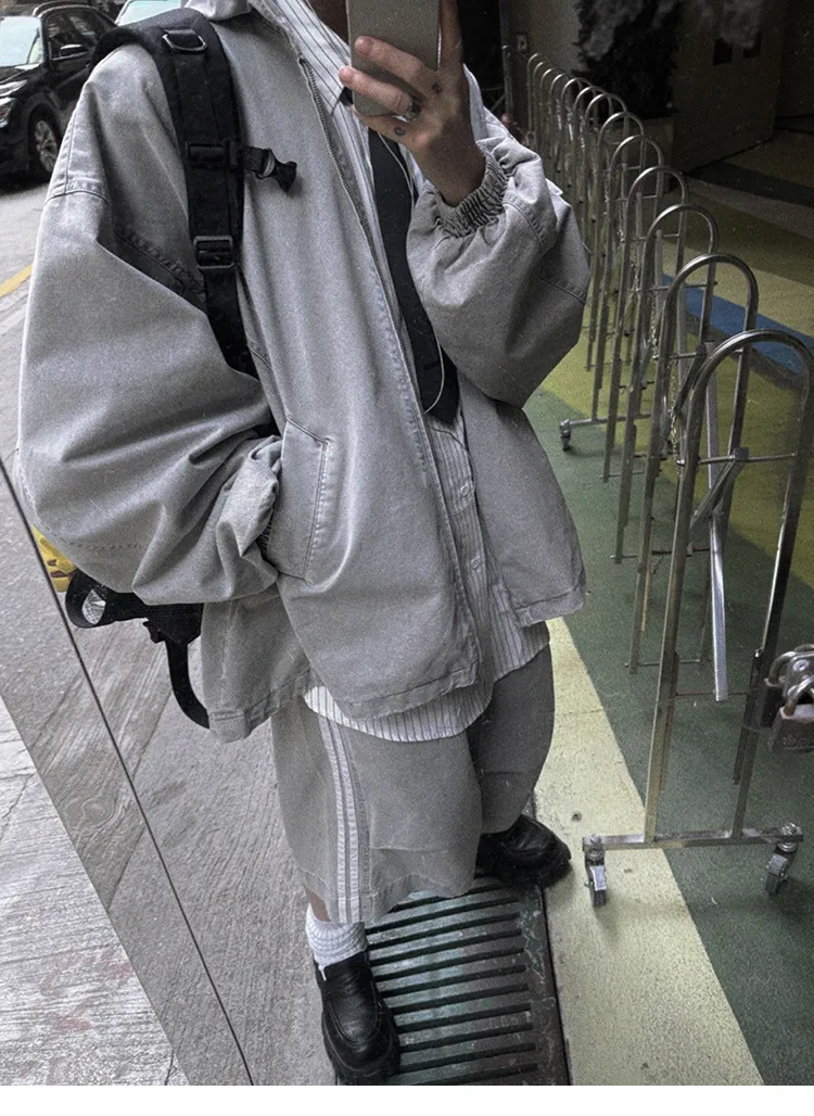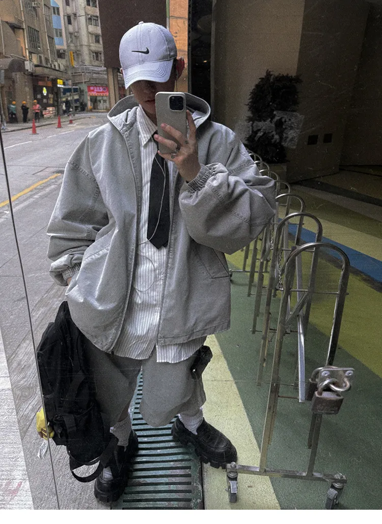 AUROCEAN 水洗舊感 工裝連帽 防風 外套(淺灰色)