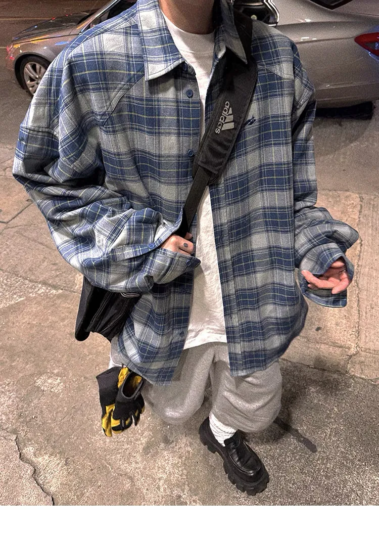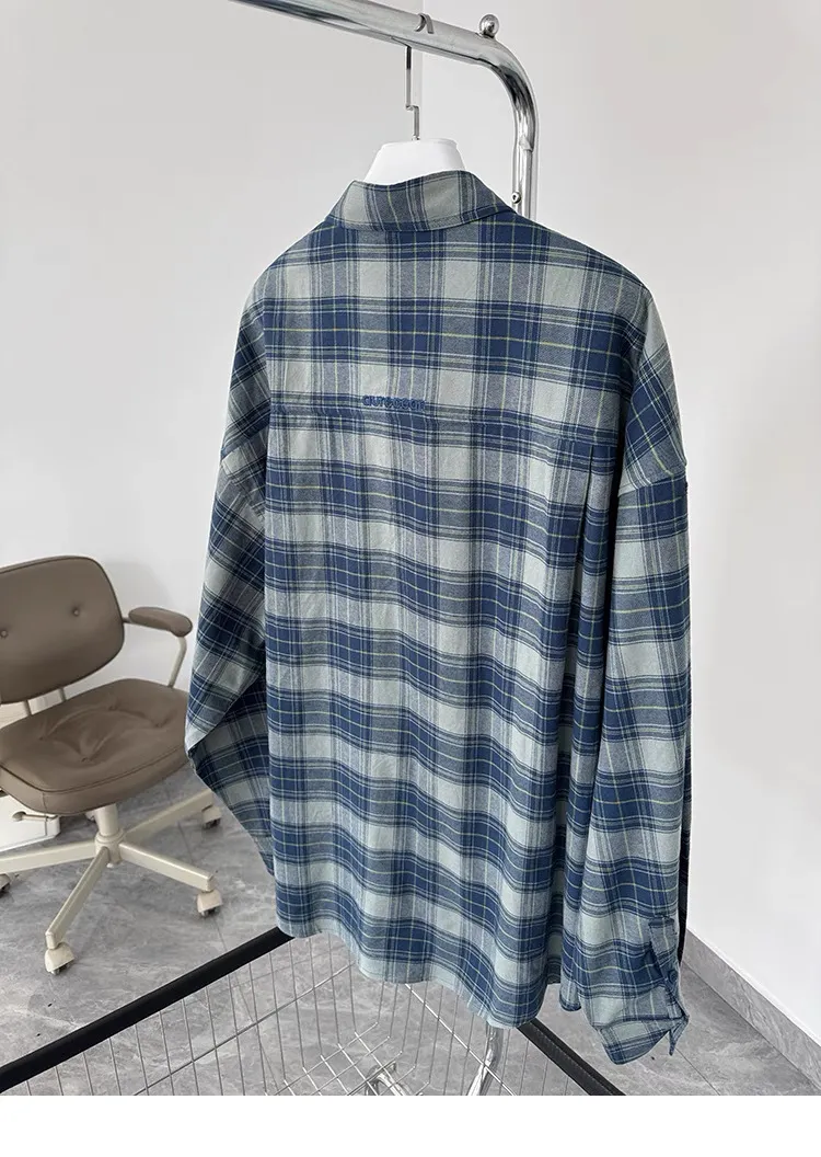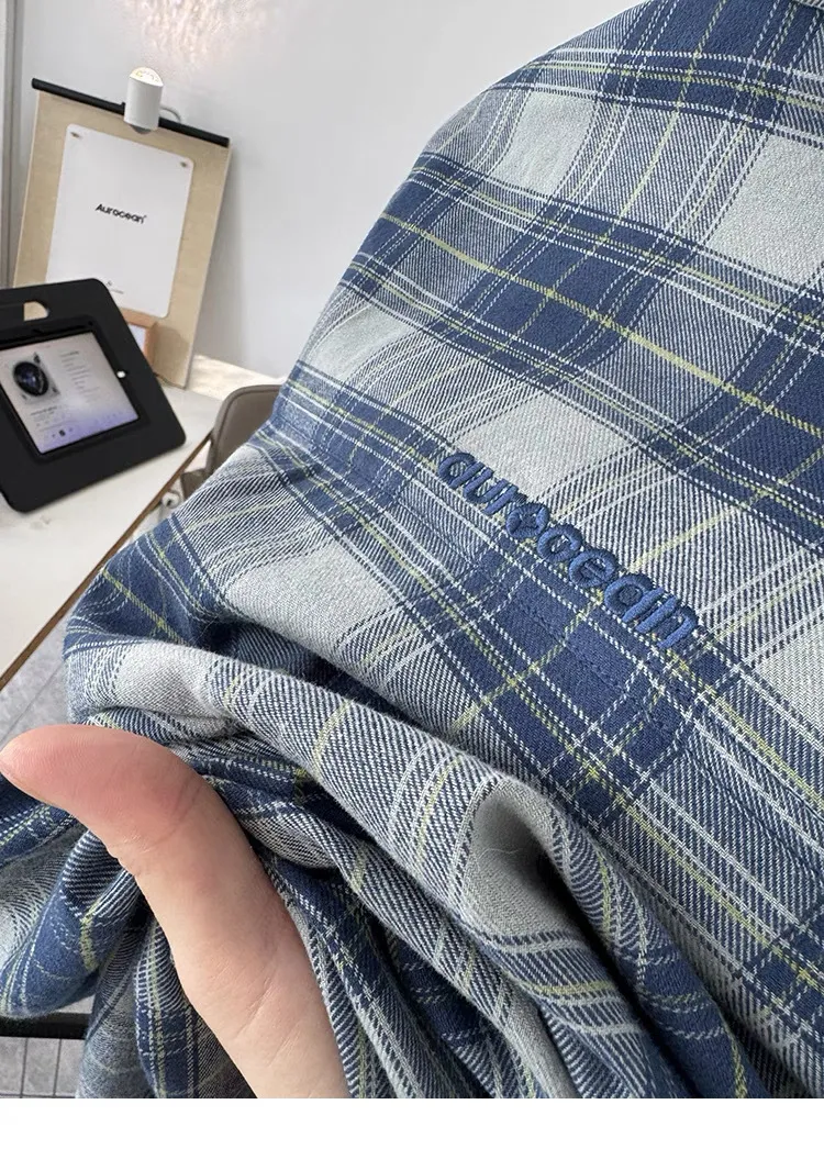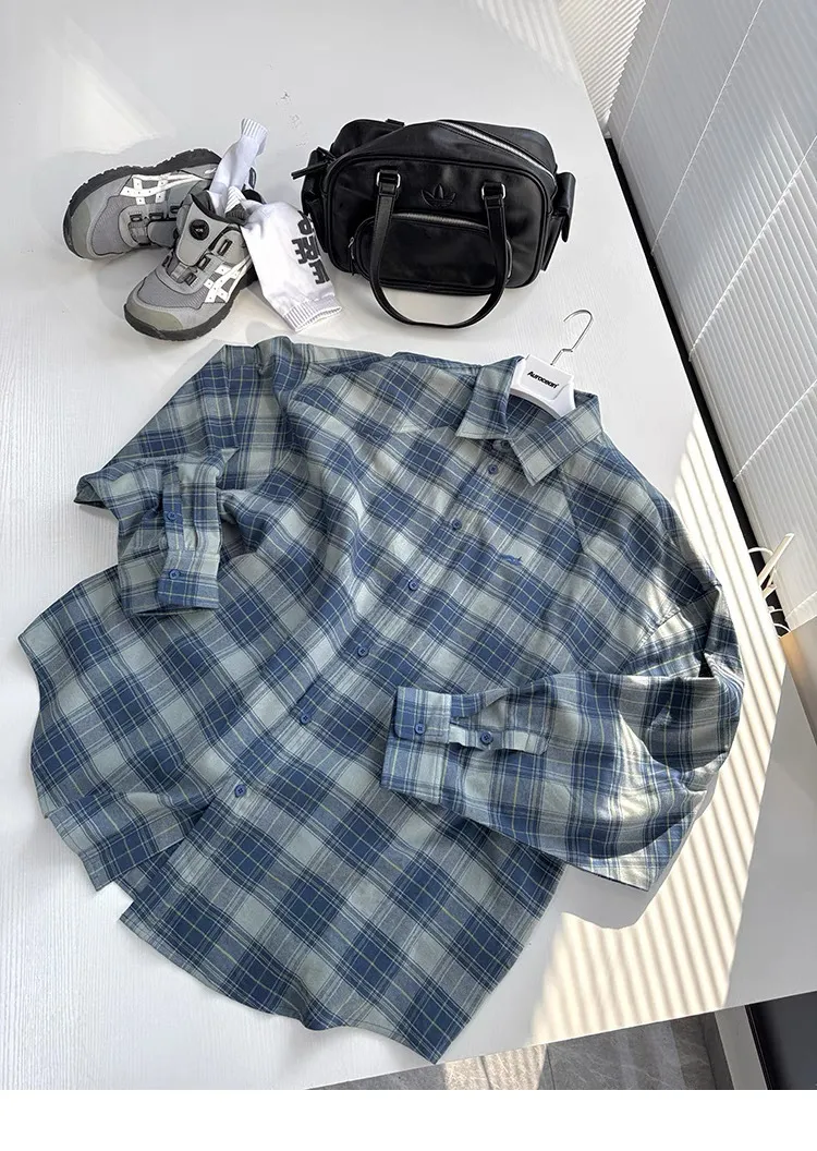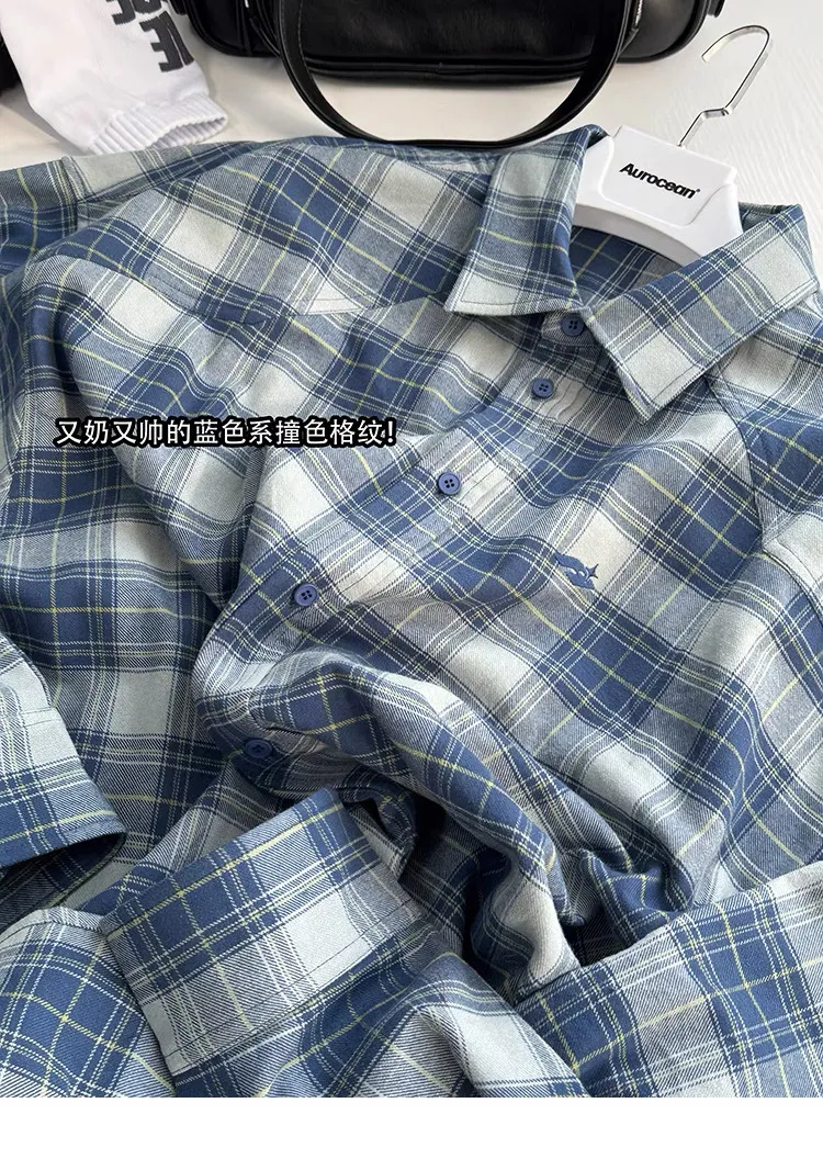 AUROCEAN 奶萌少年 寬肩闊型 肌理感 格紋 襯衫(奶藍色)