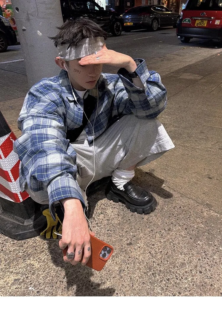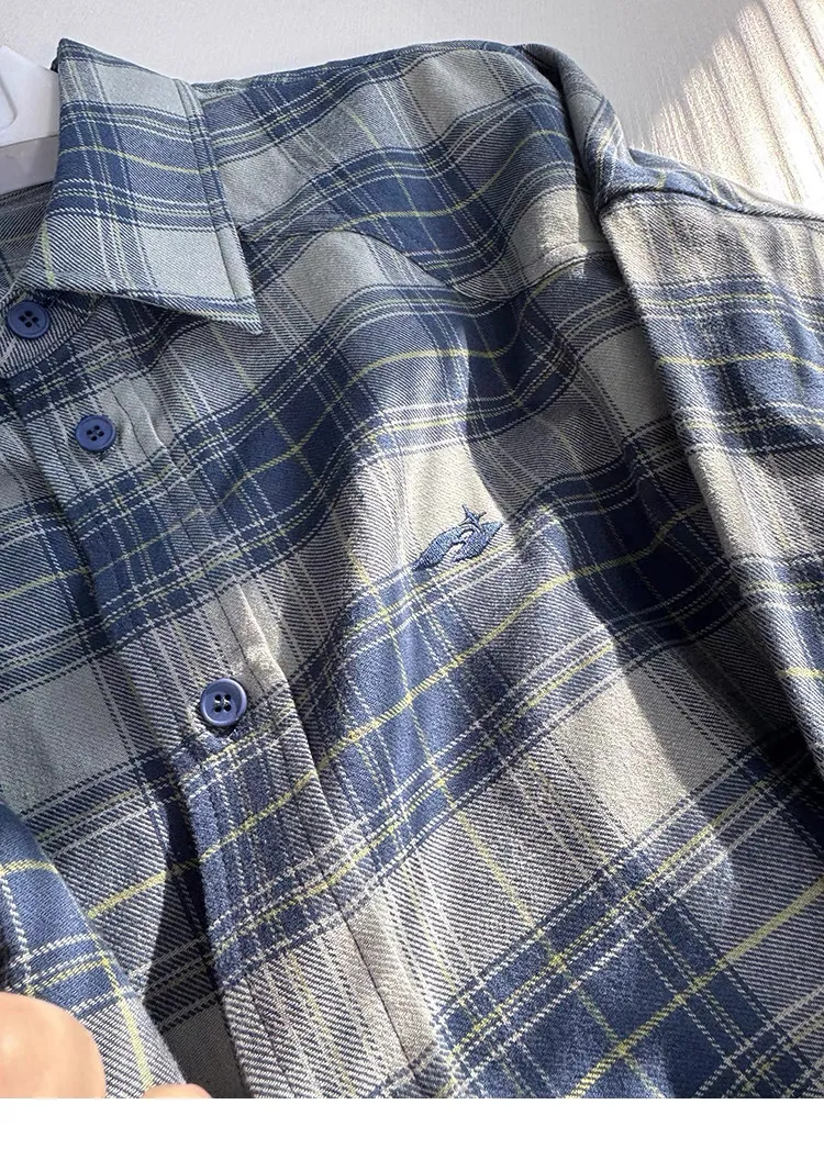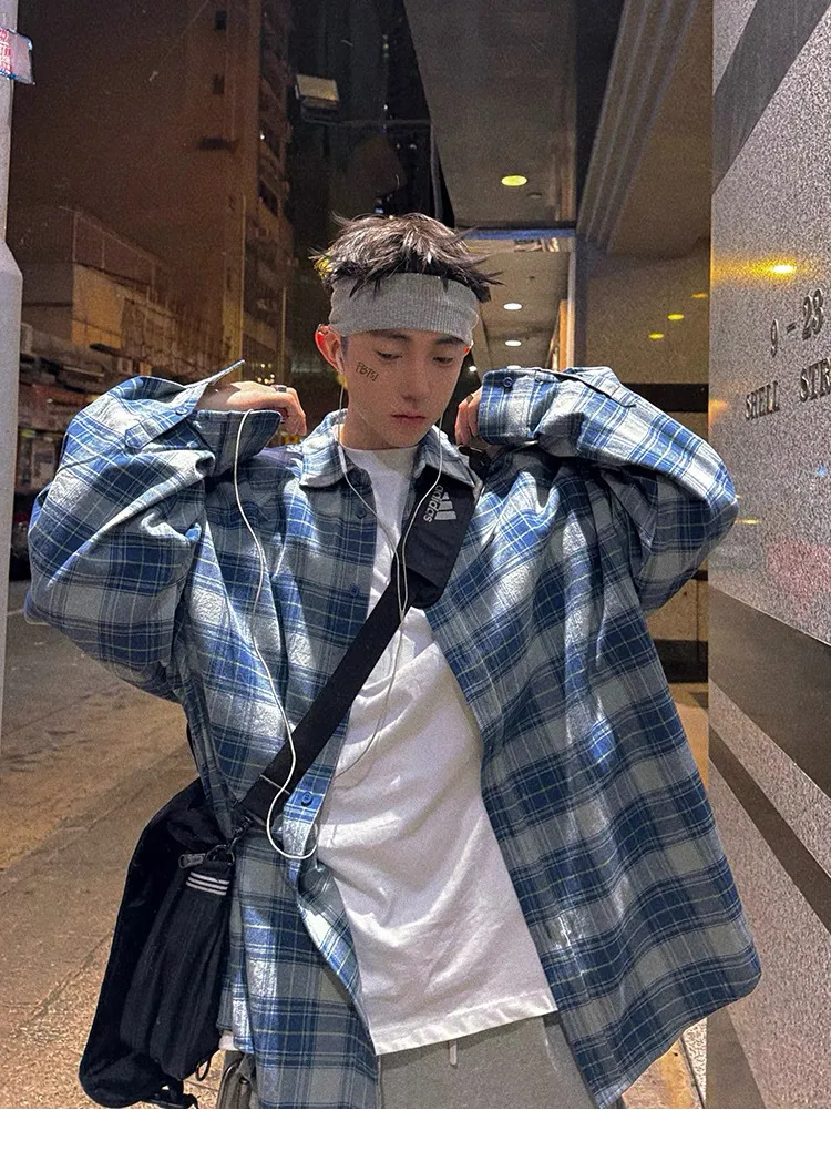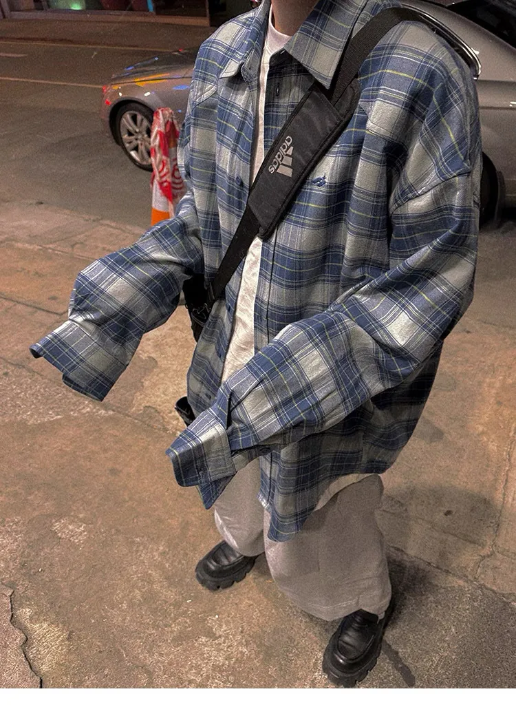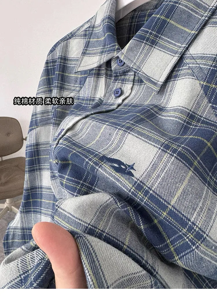 AUROCEAN 奶萌少年 寬肩闊型 肌理感 格紋 襯衫(奶藍色)