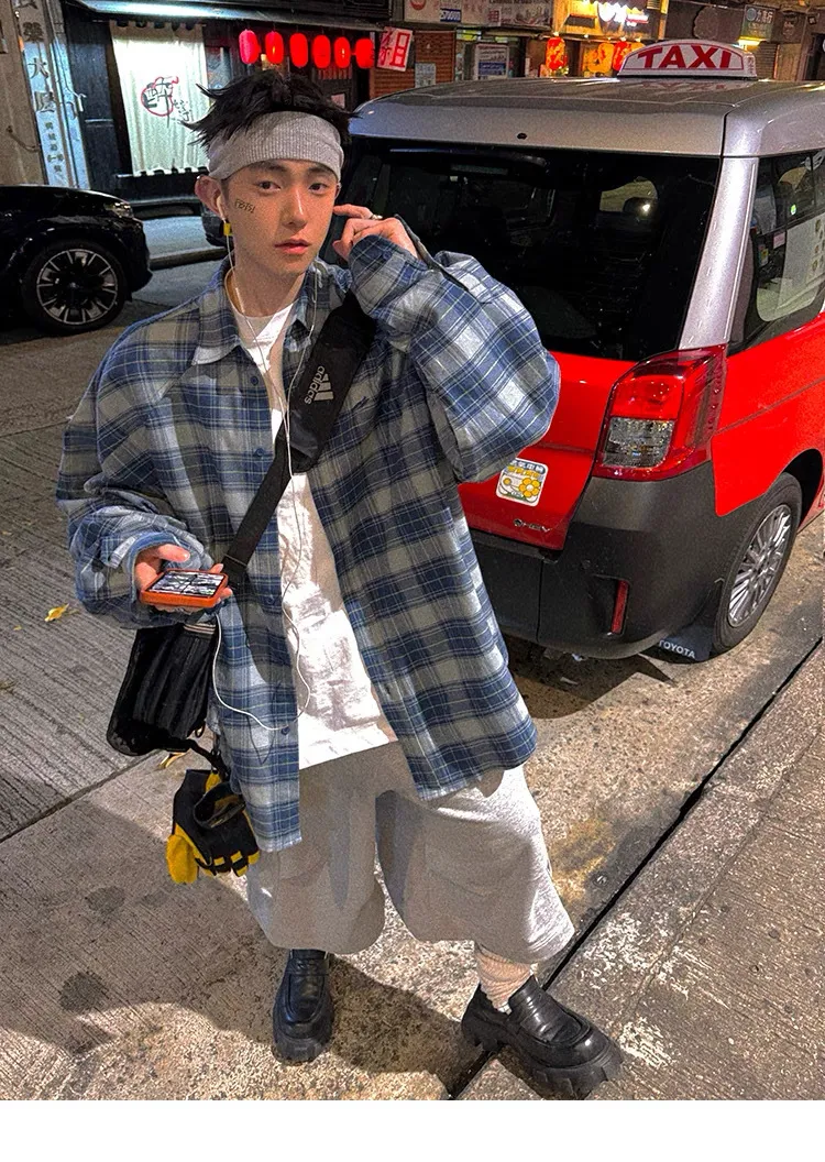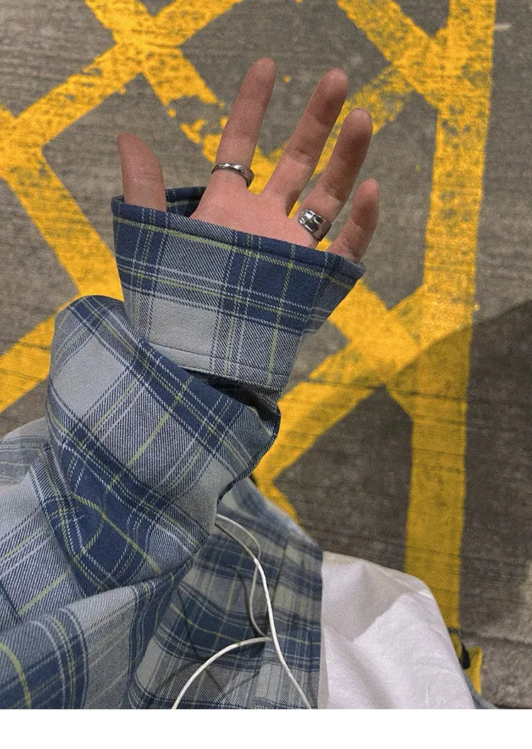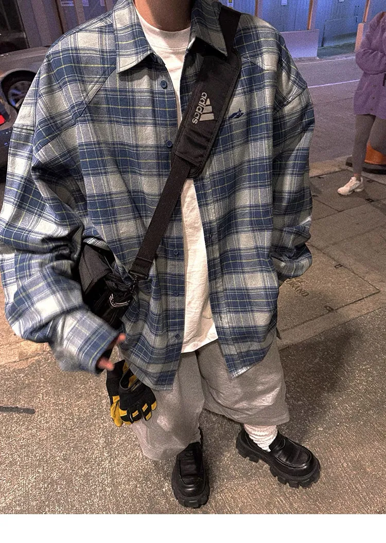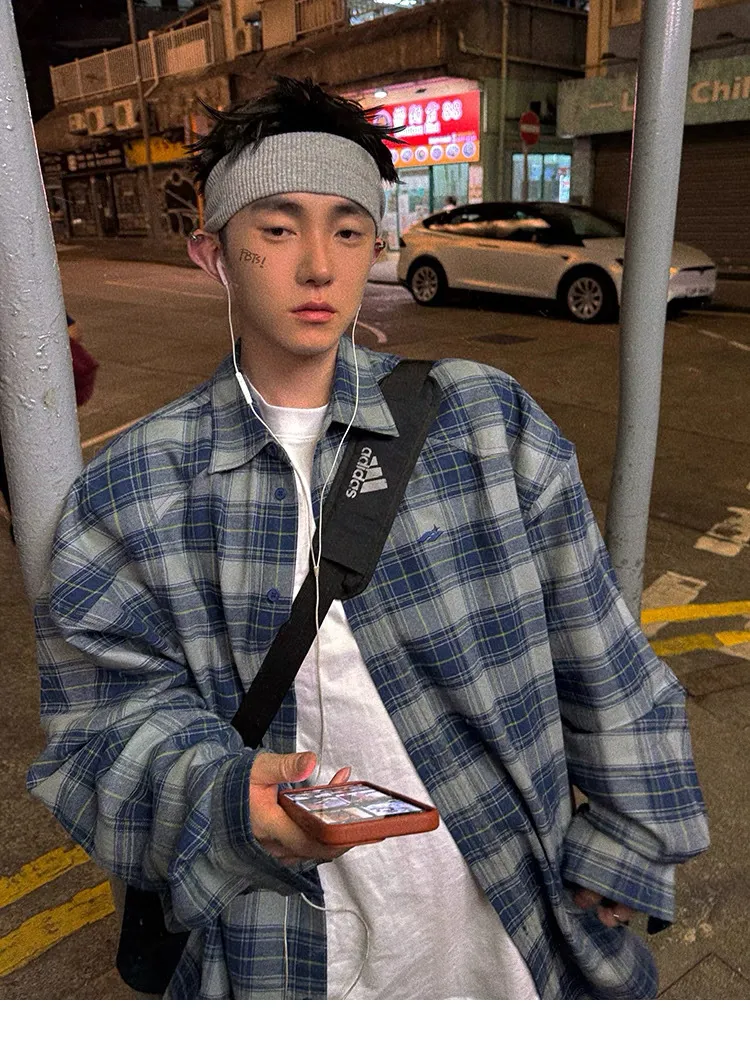 AUROCEAN 港風少年 寬肩闊型 撞色格紋 襯衫(灰綠色)