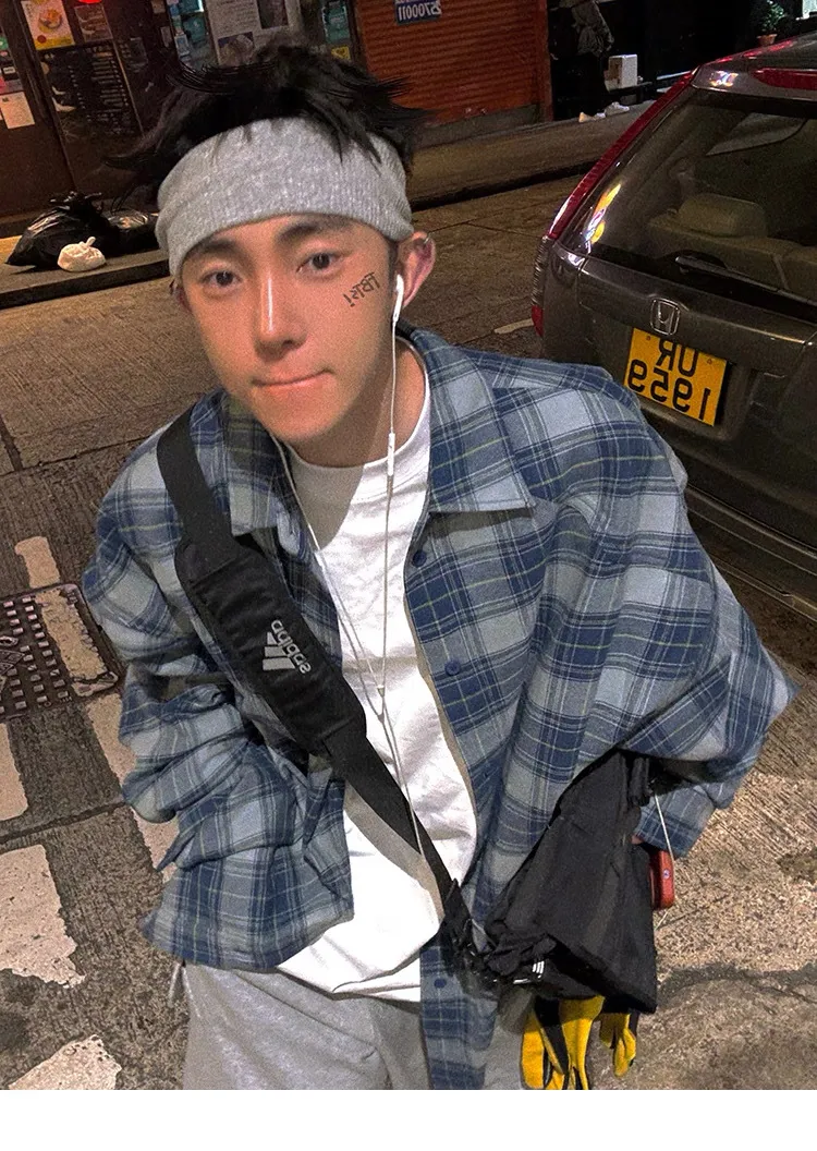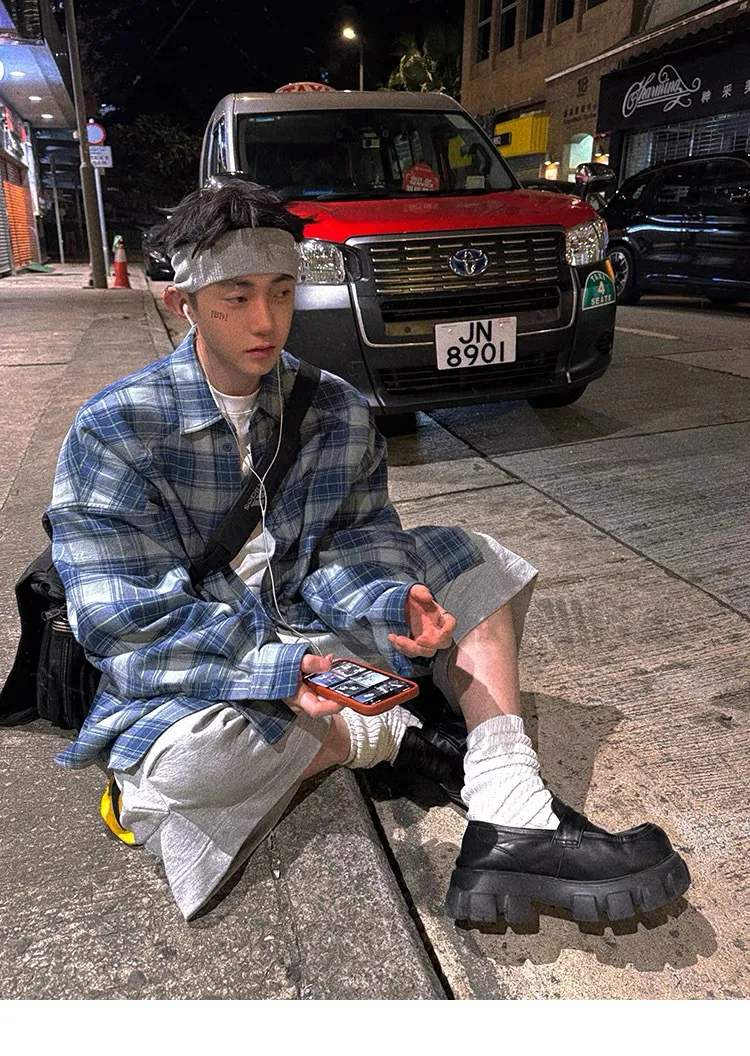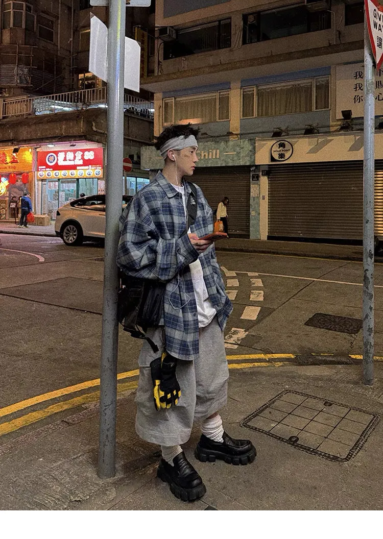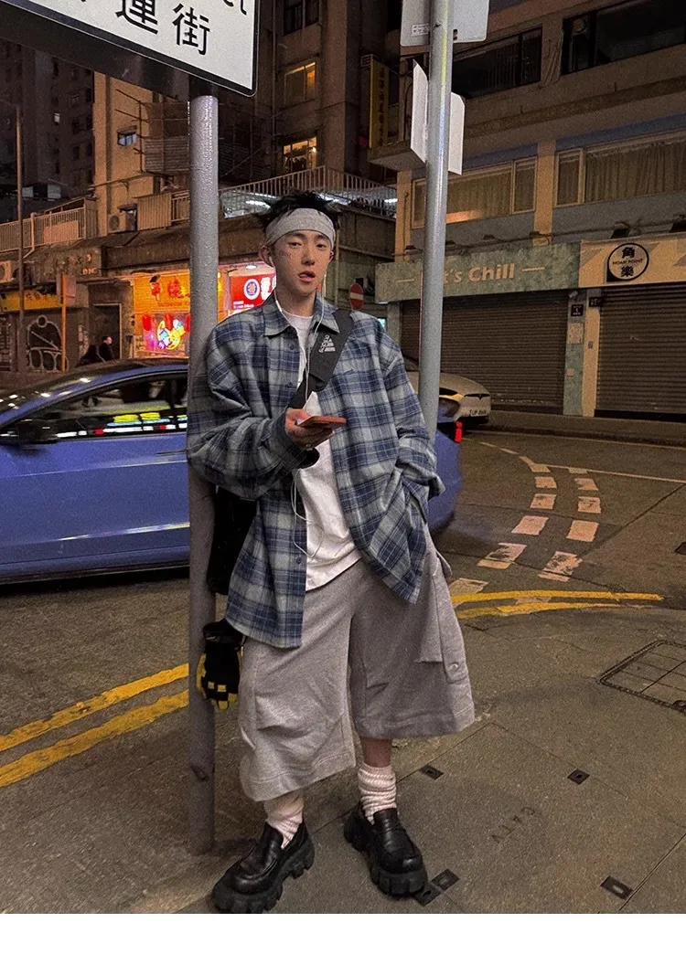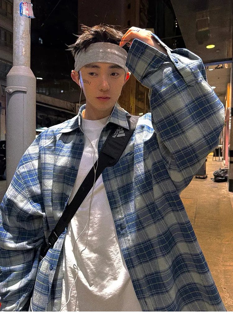 AUROCEAN 港風少年 寬肩闊型 撞色格紋 襯衫(灰綠色)