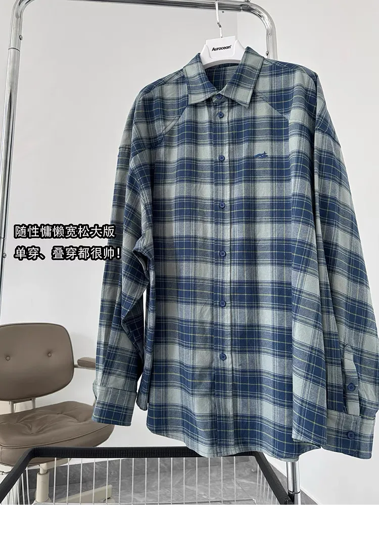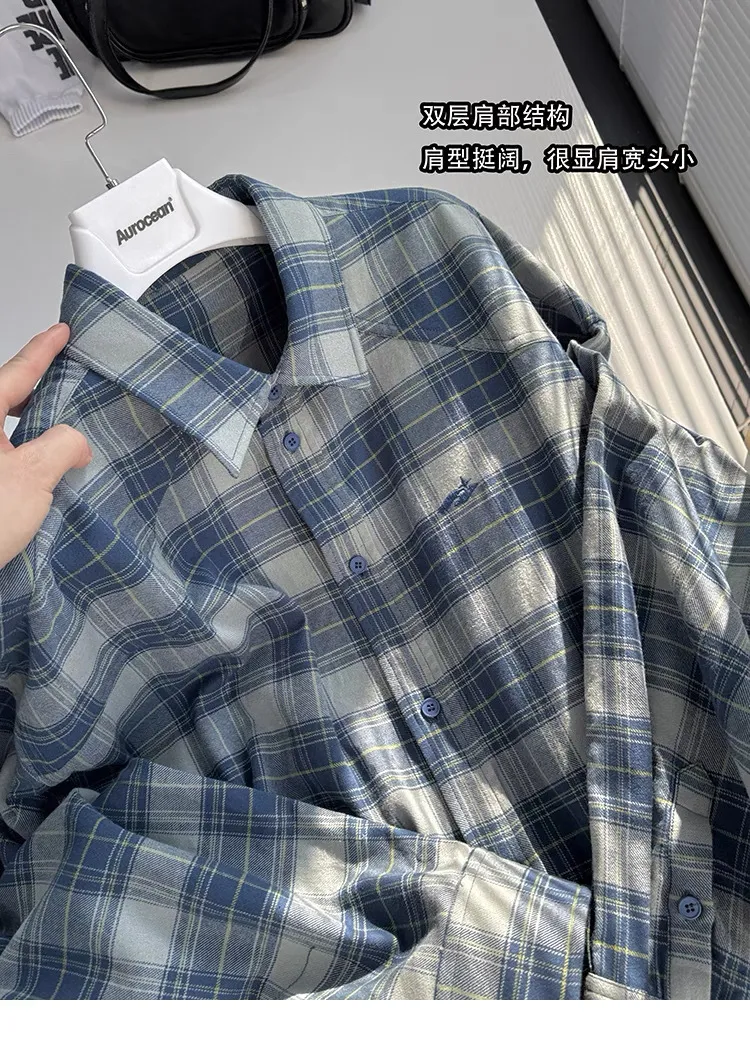 AUROCEAN 寬肩闊型 藍色系 格紋 襯衫(深藍色)