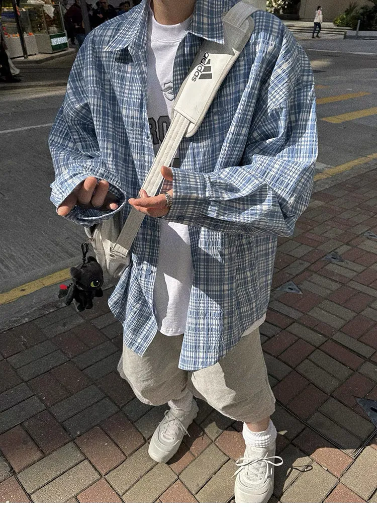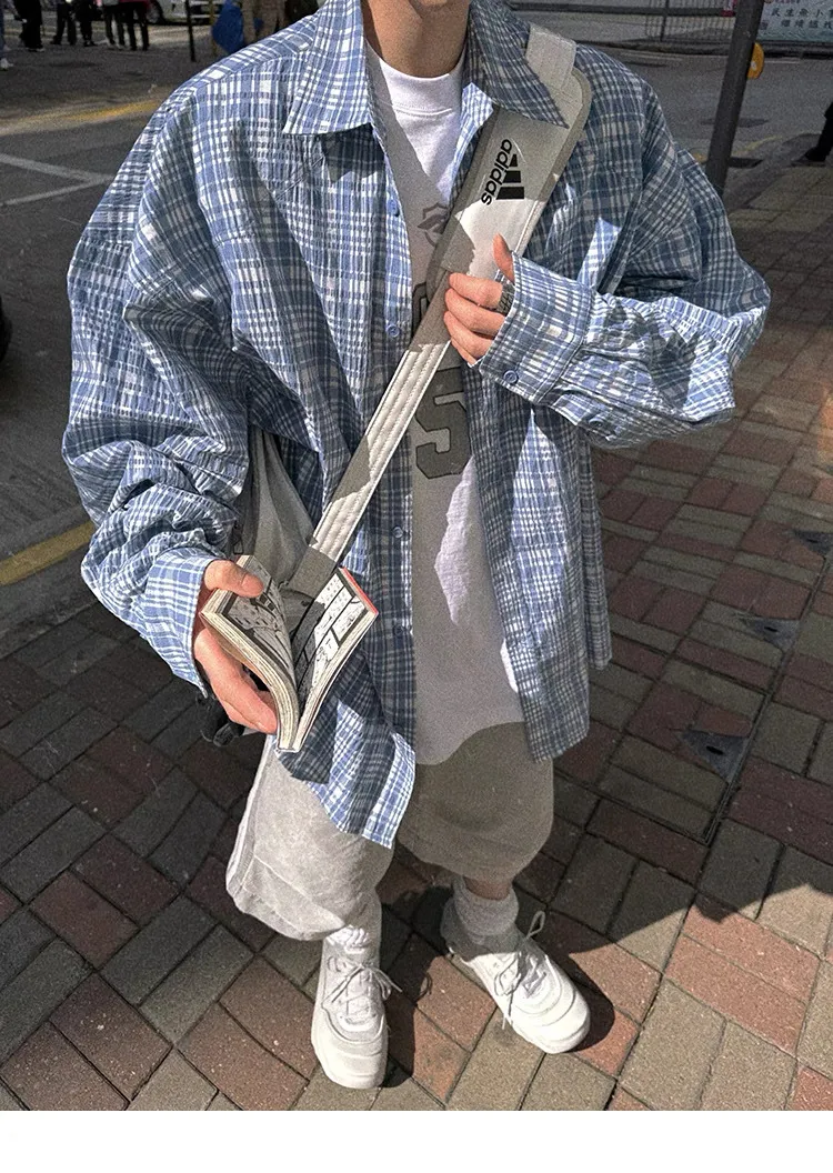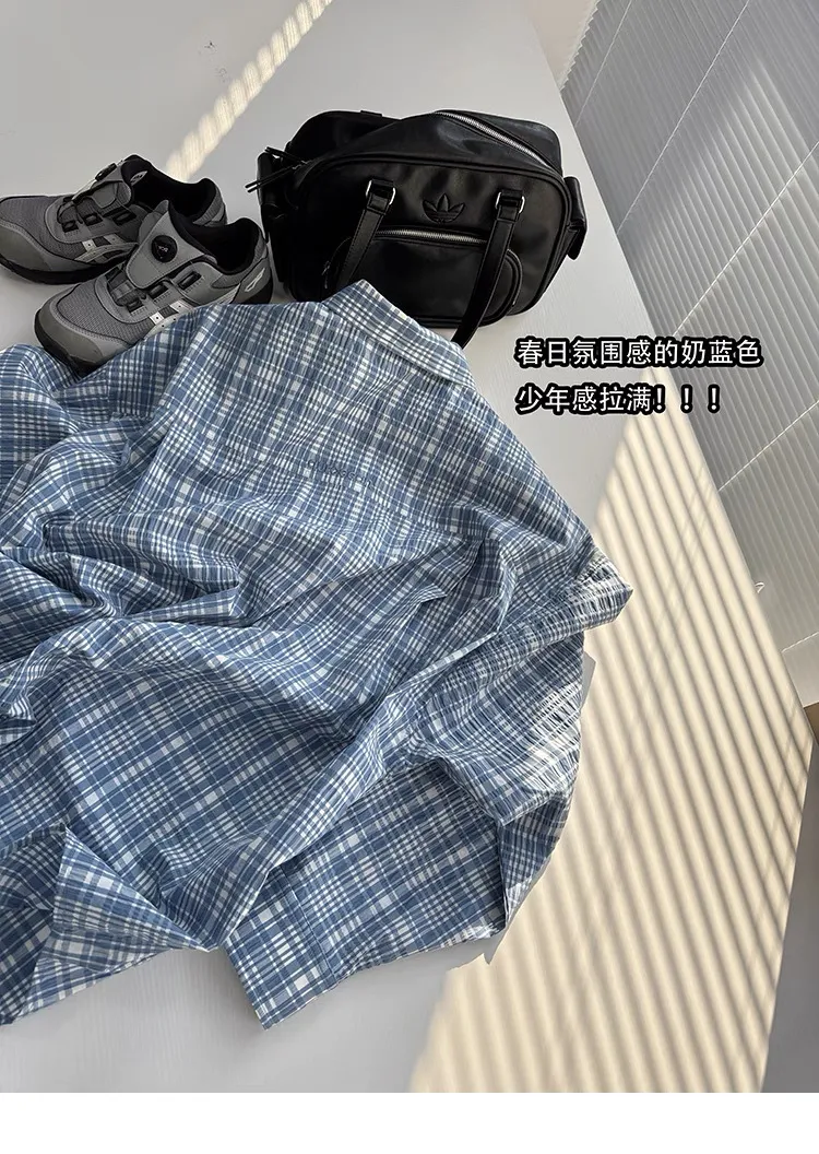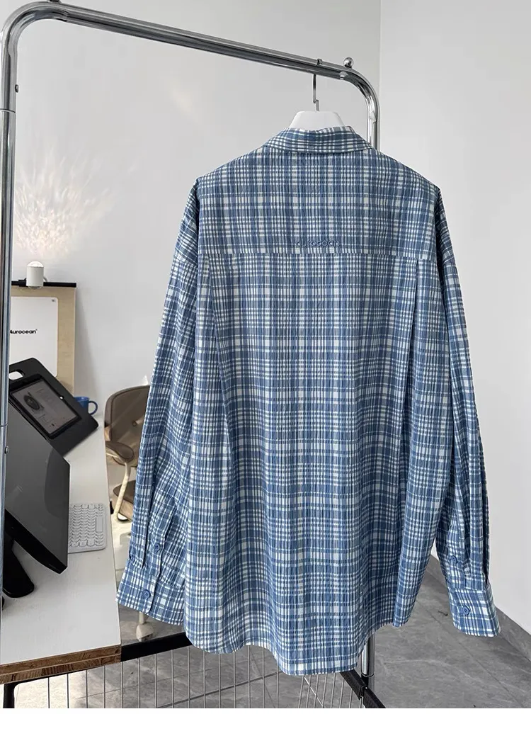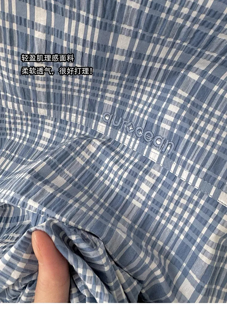 AUROCEAN 奶萌少年 寬肩闊型 肌理感 格紋 襯衫(奶藍色)