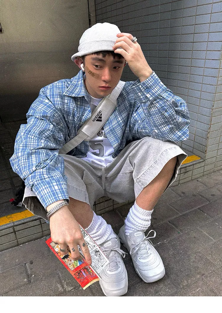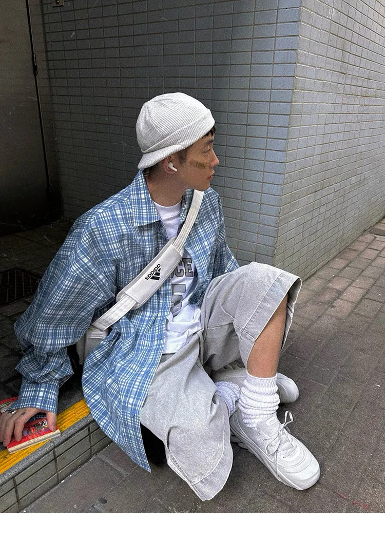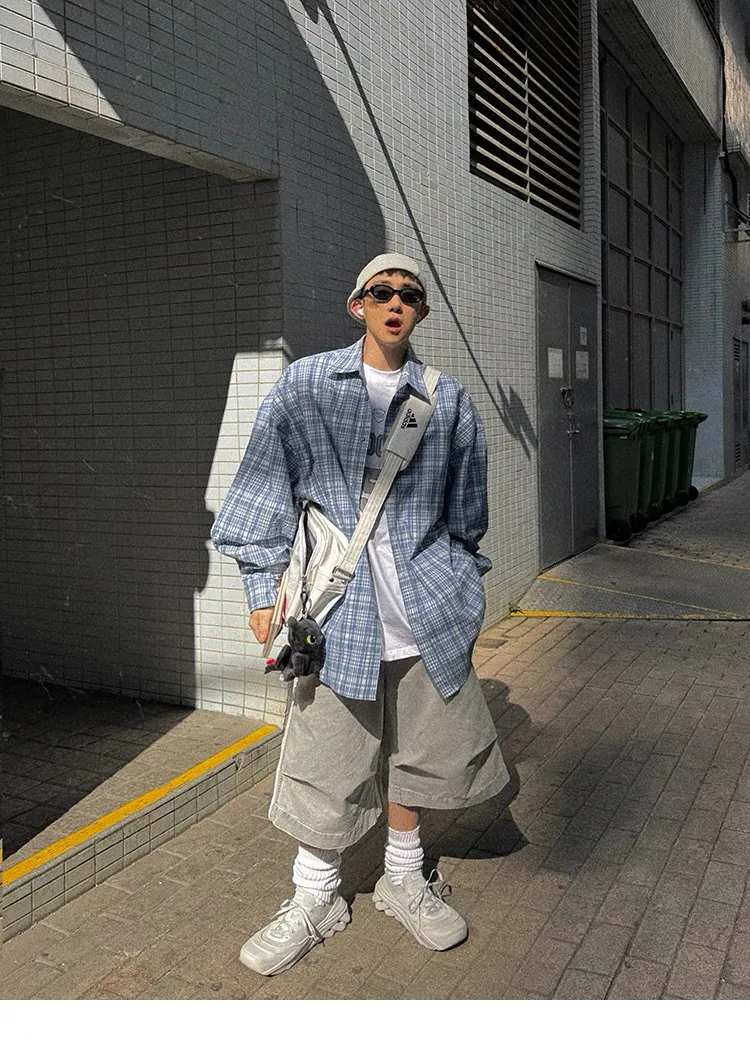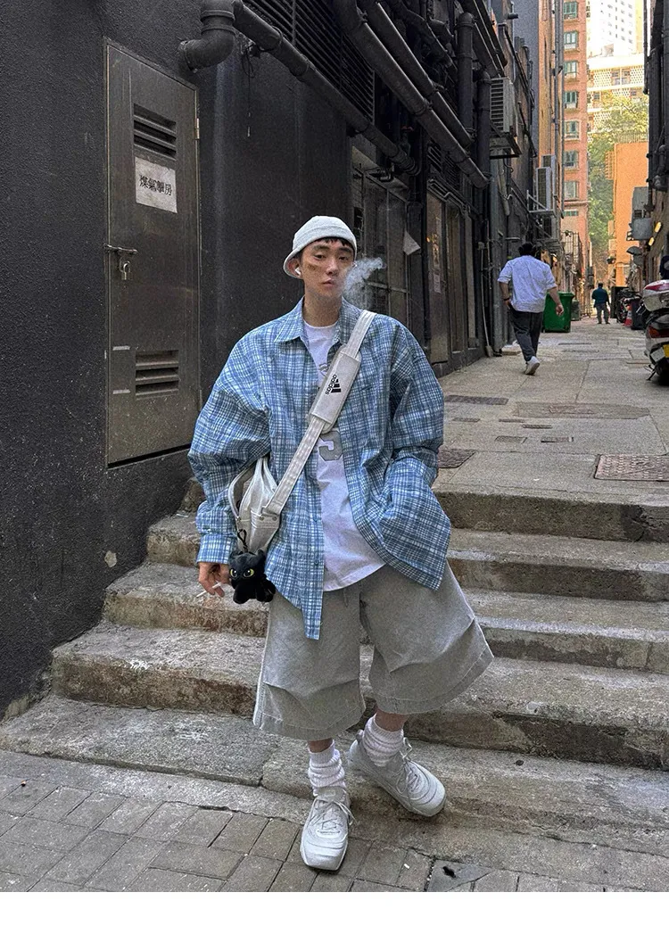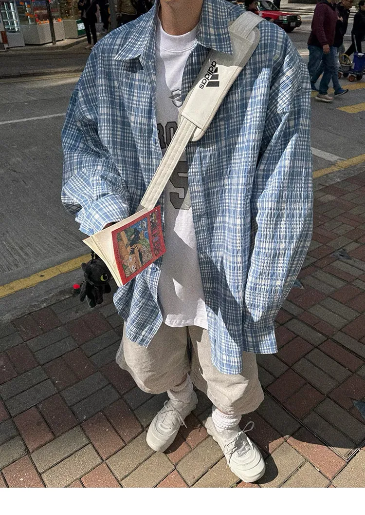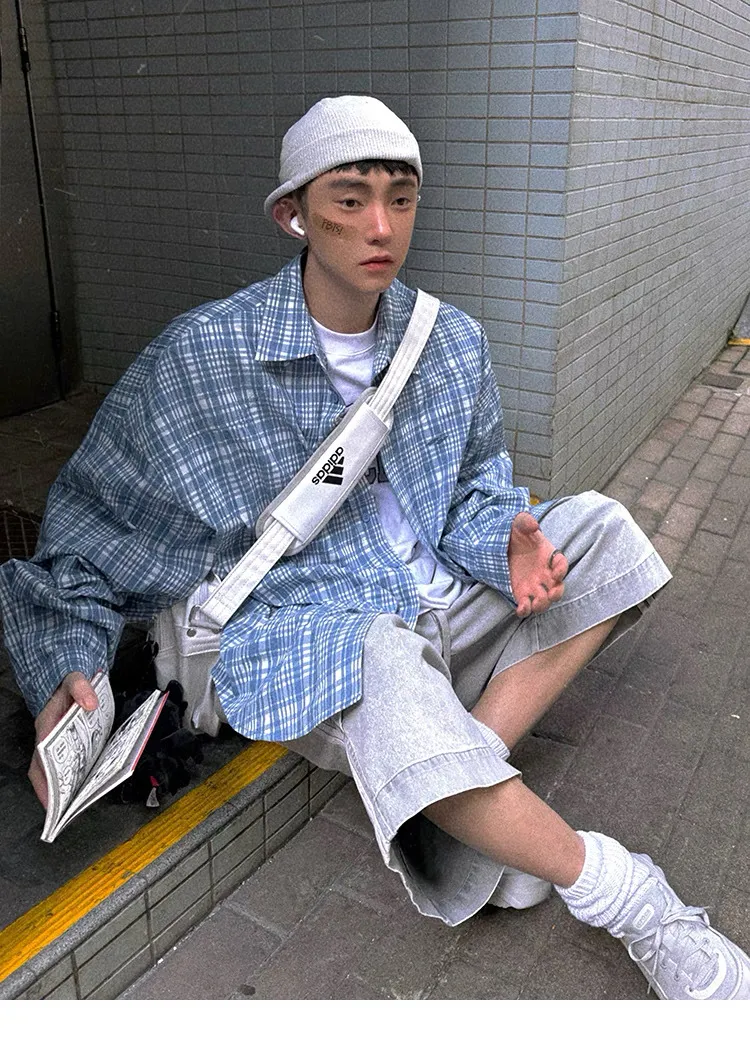 AUROCEAN 奶萌少年 寬肩闊型 肌理感 格紋 襯衫(奶藍色)