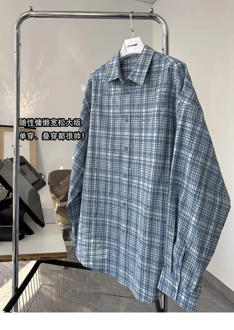 AUROCEAN 寬肩闊型 藍色系 格紋 襯衫(深藍色)