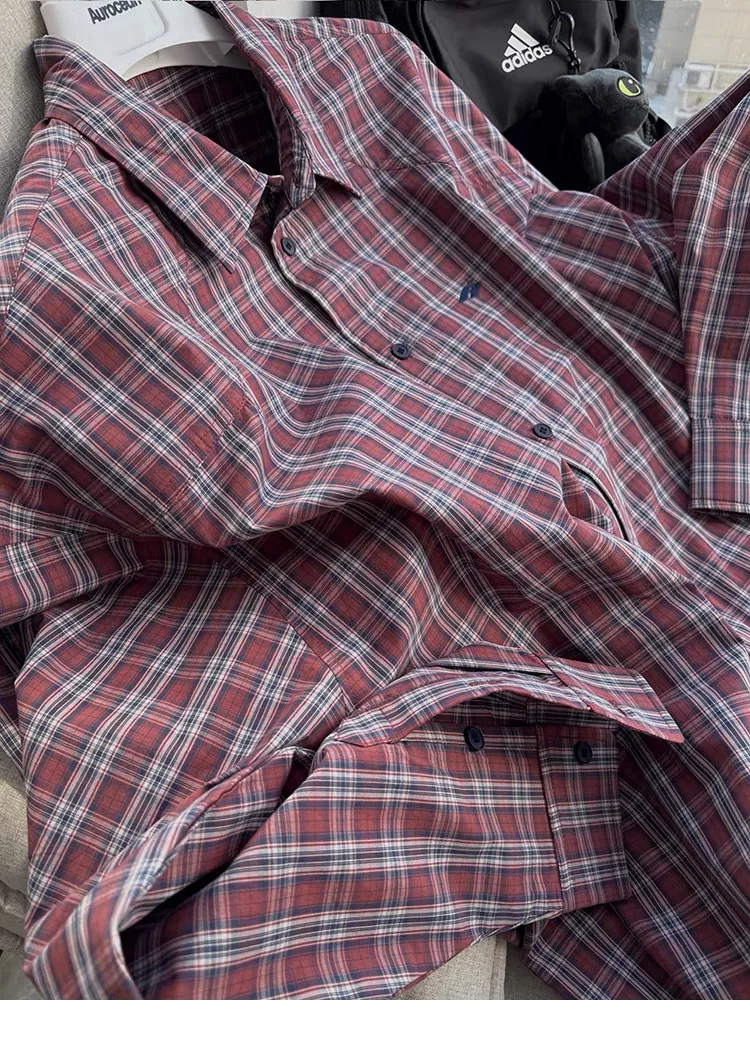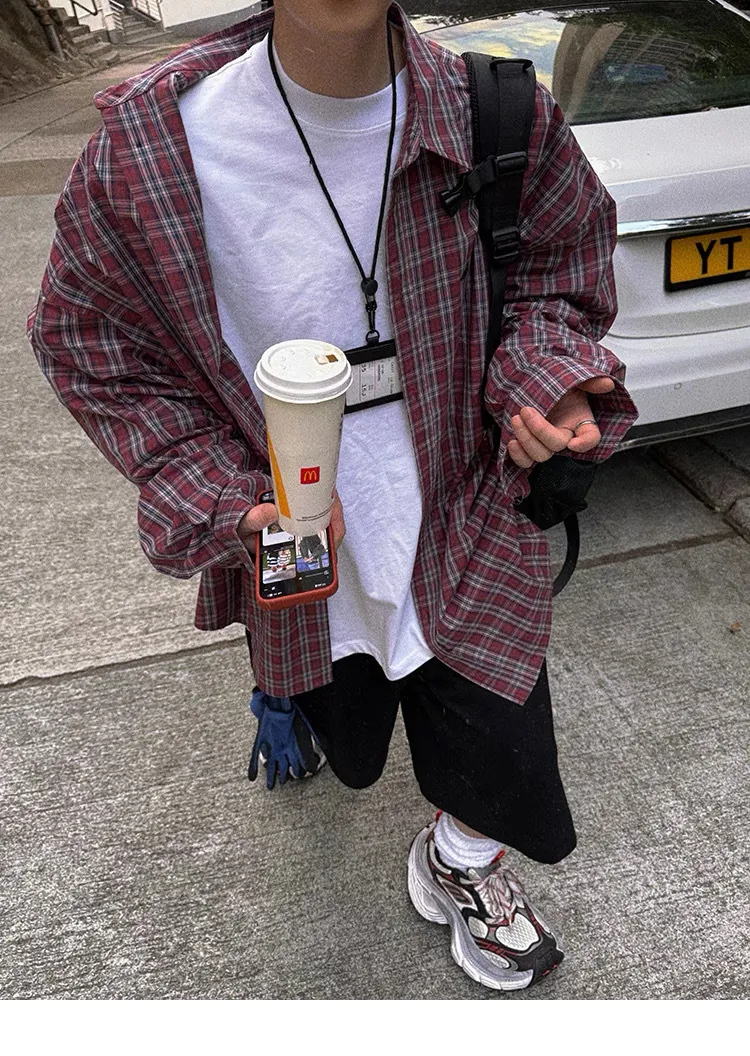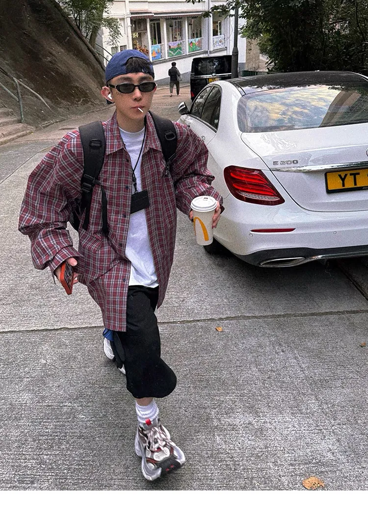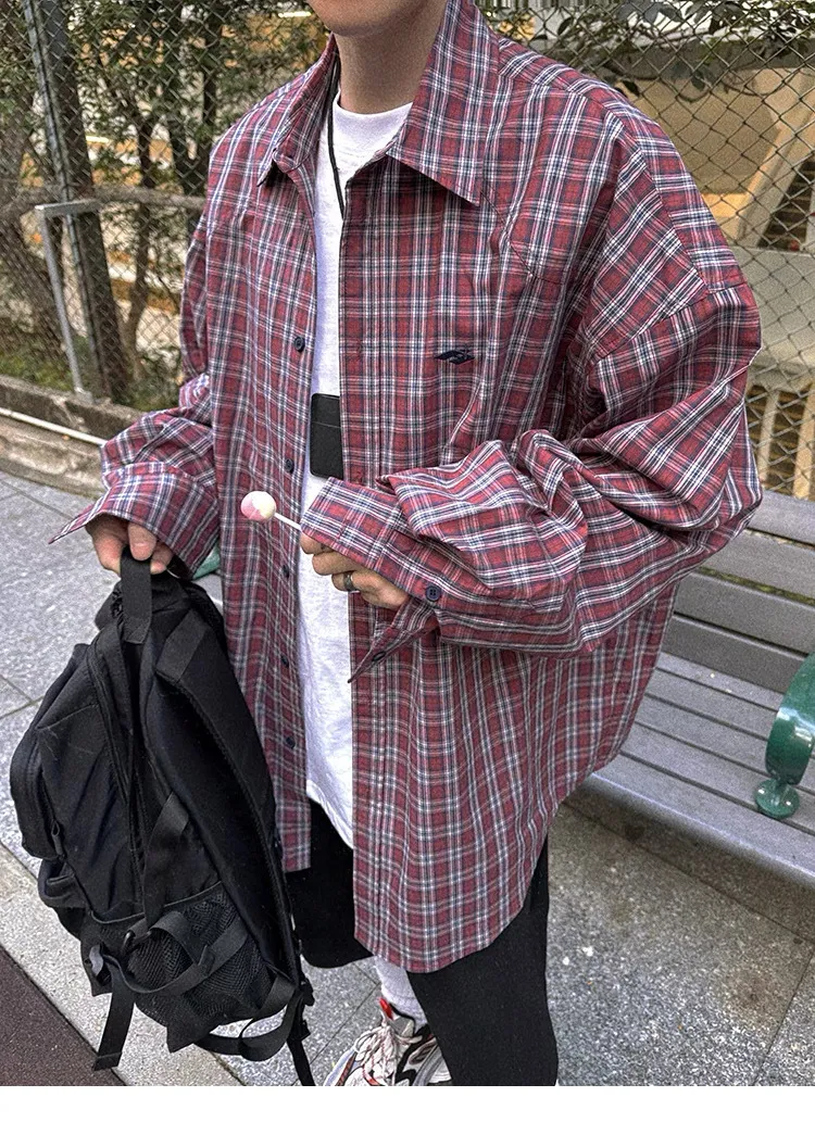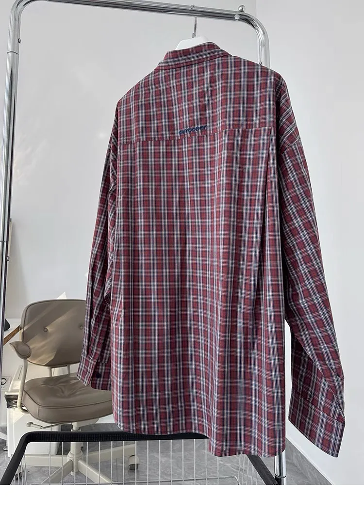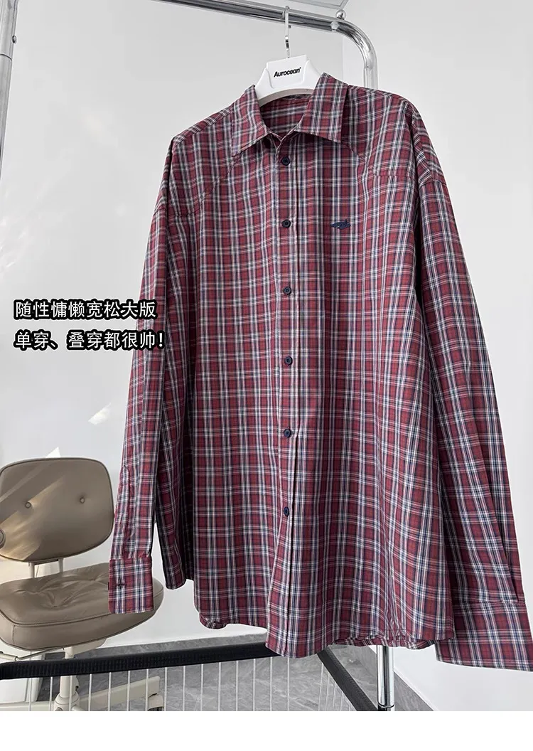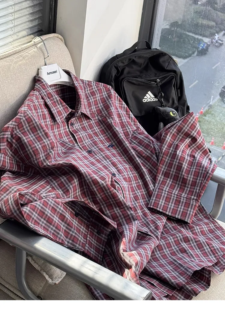 AUROCEAN 復古少年 寬肩闊型 撞色格紋 襯衫(灰紅色)