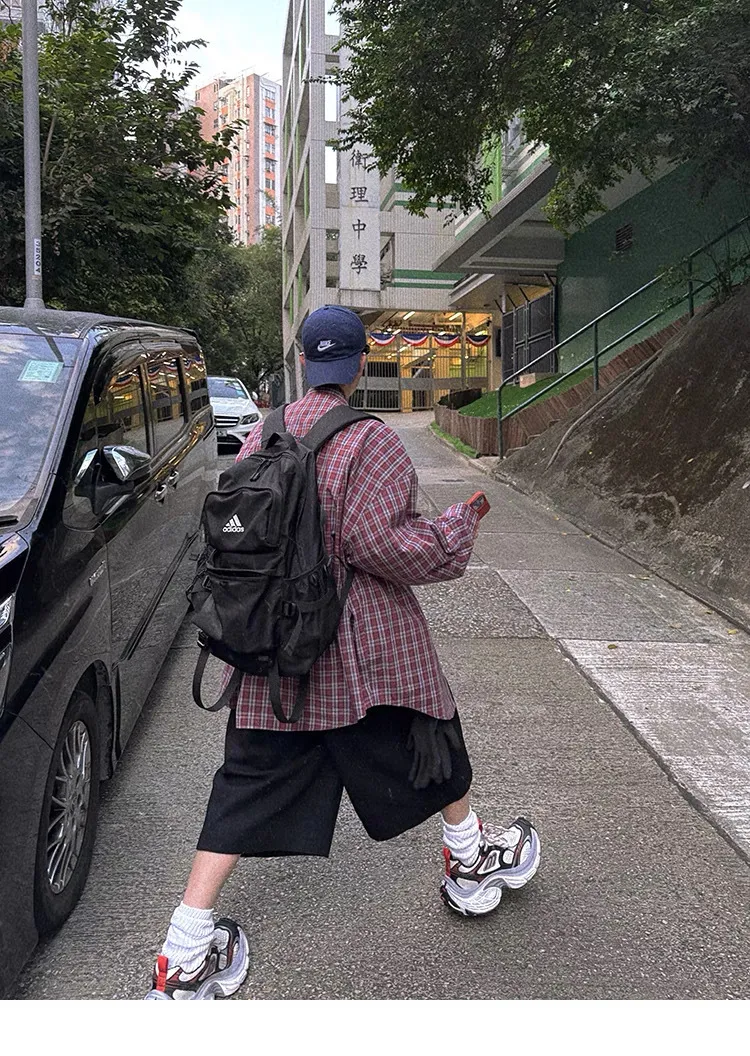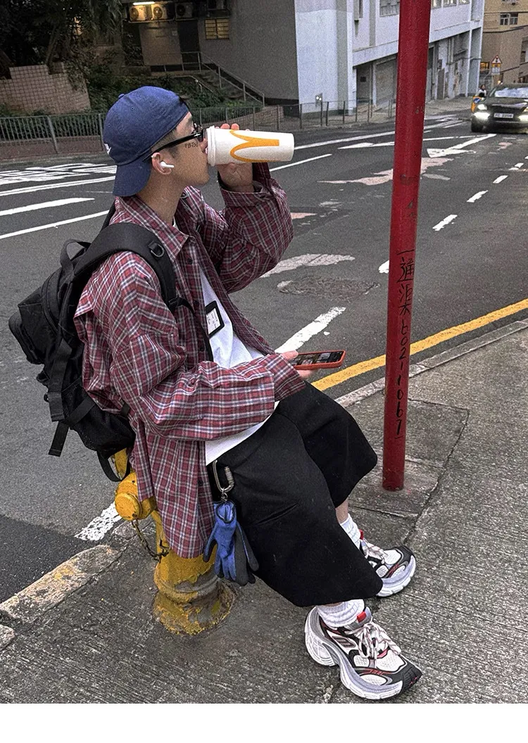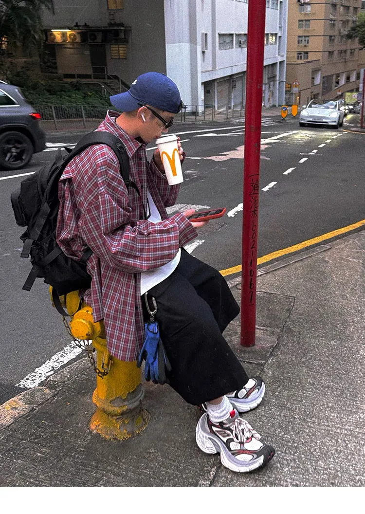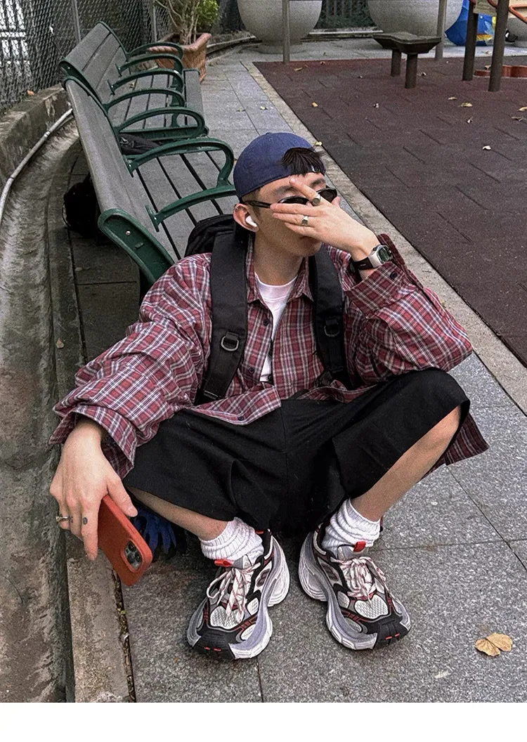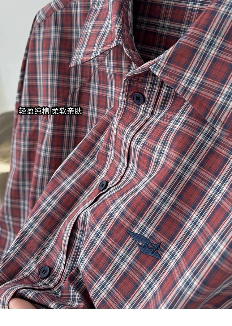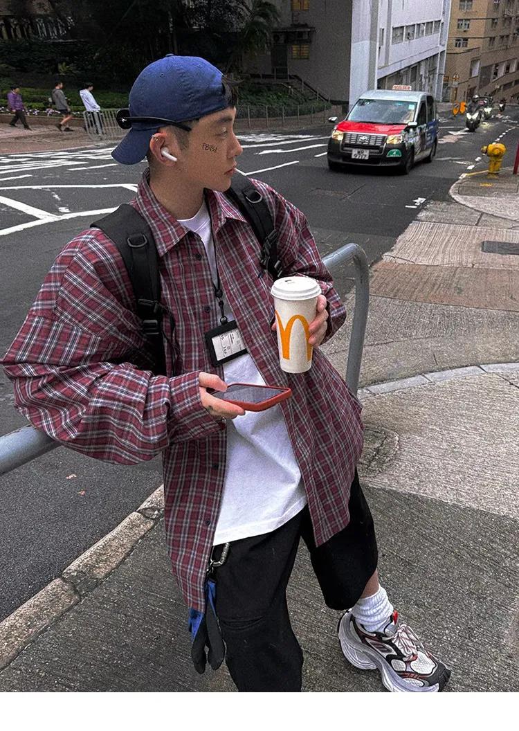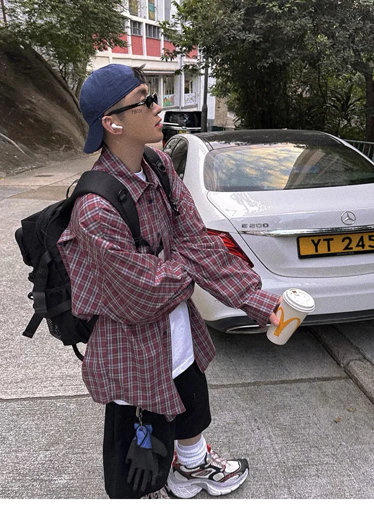 AUROCEAN 復古少年 寬肩闊型 撞色格紋 襯衫(灰紅色)
