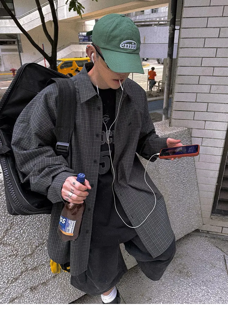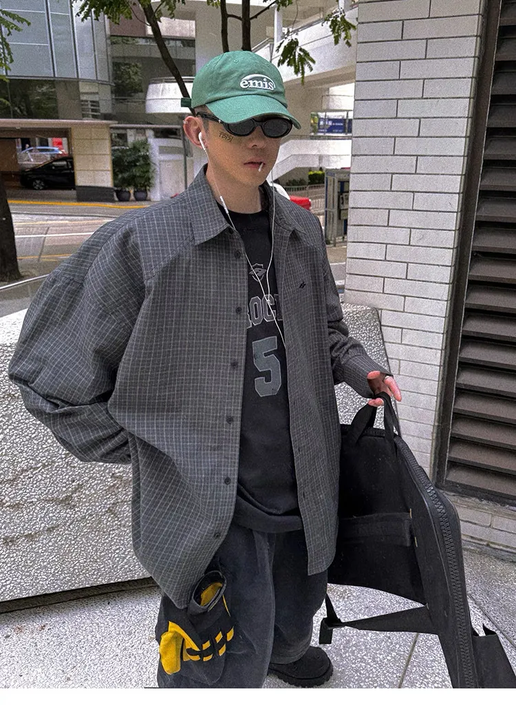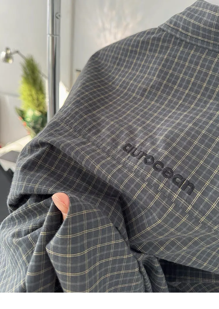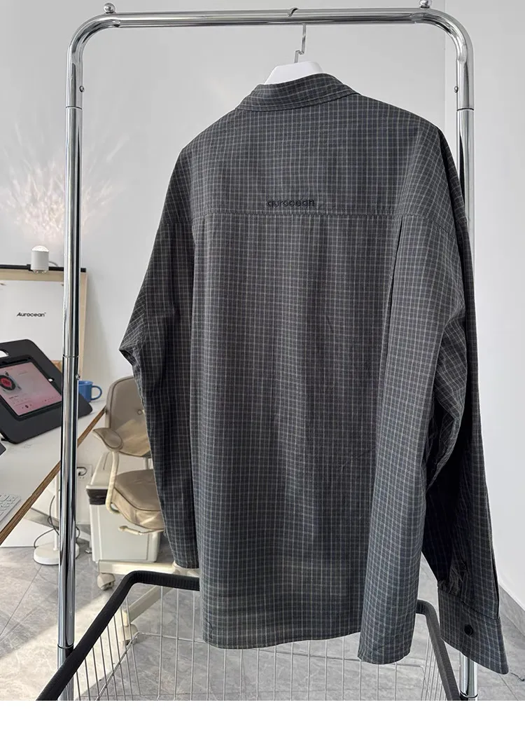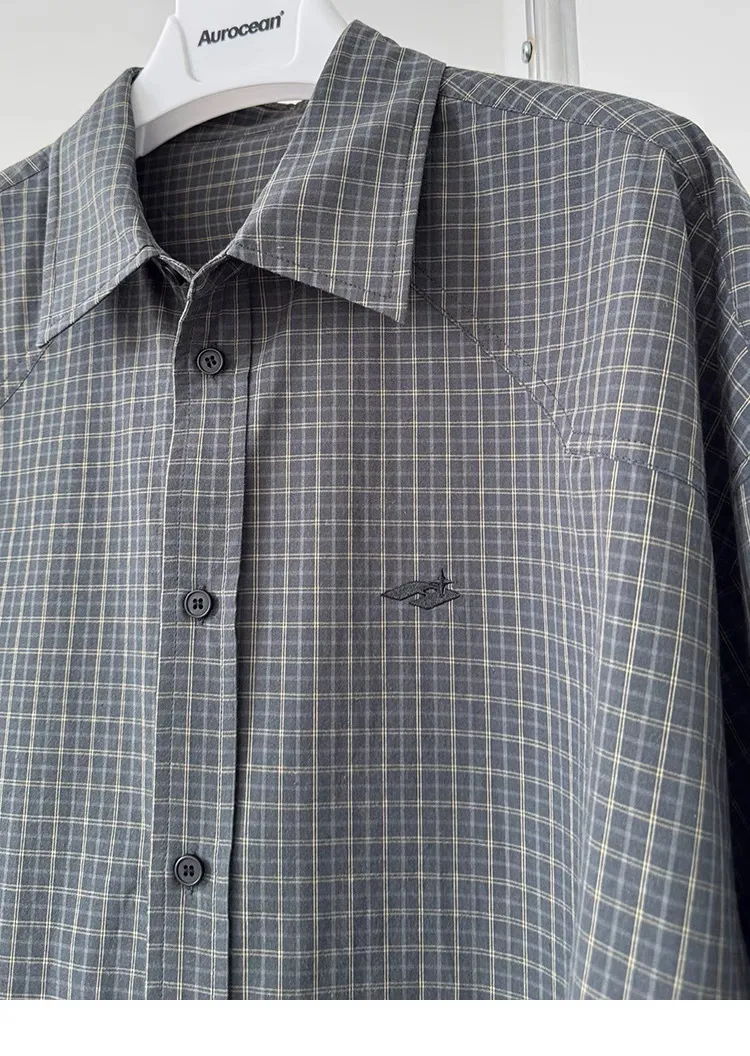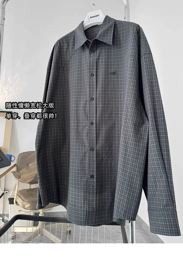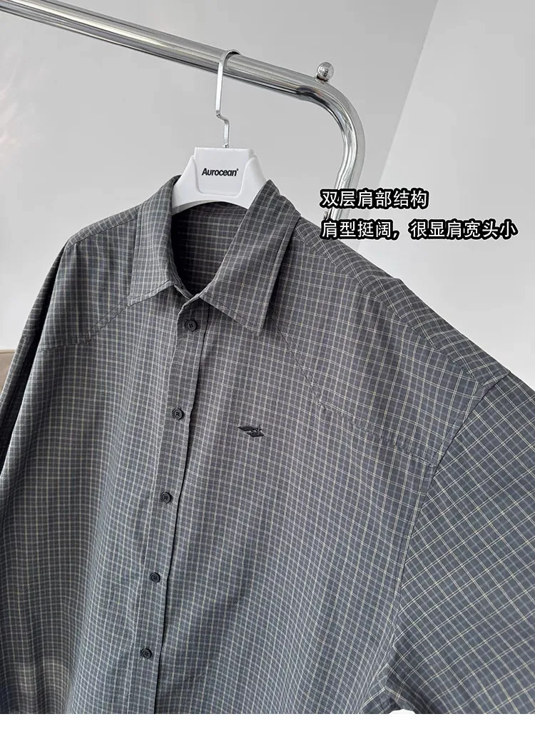 AUROCEAN 港風少年 寬肩闊型 撞色格紋 襯衫(灰綠色)