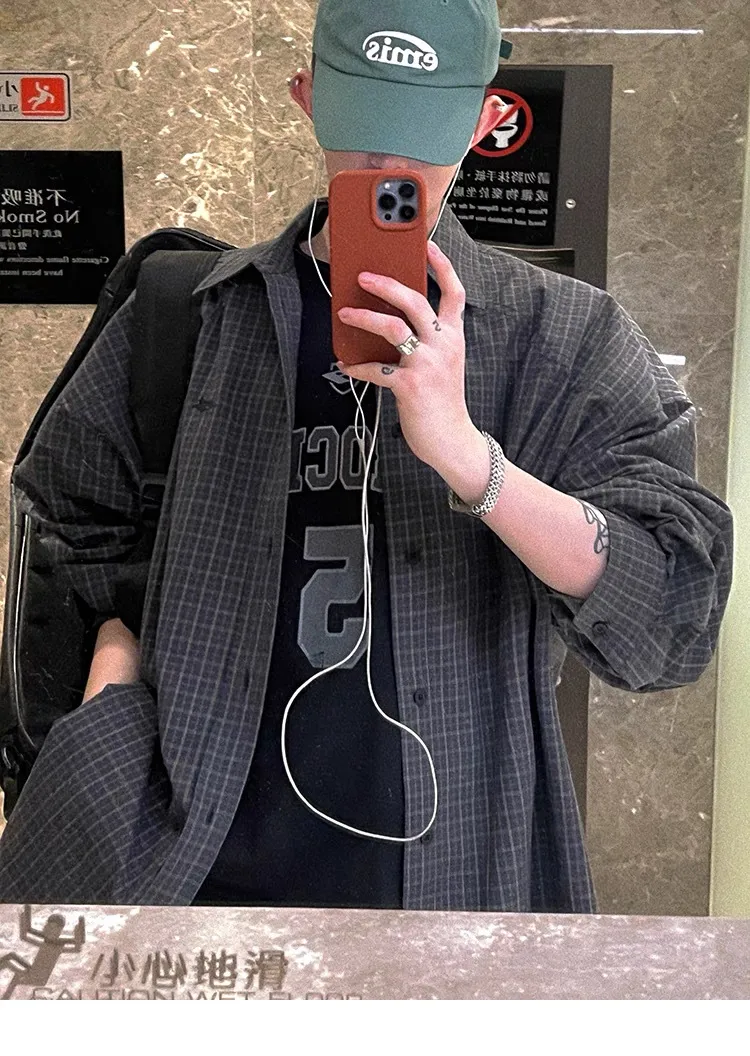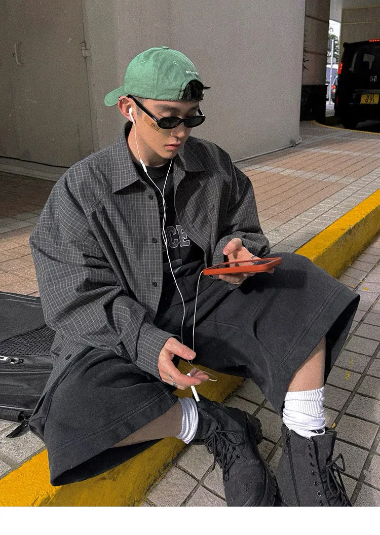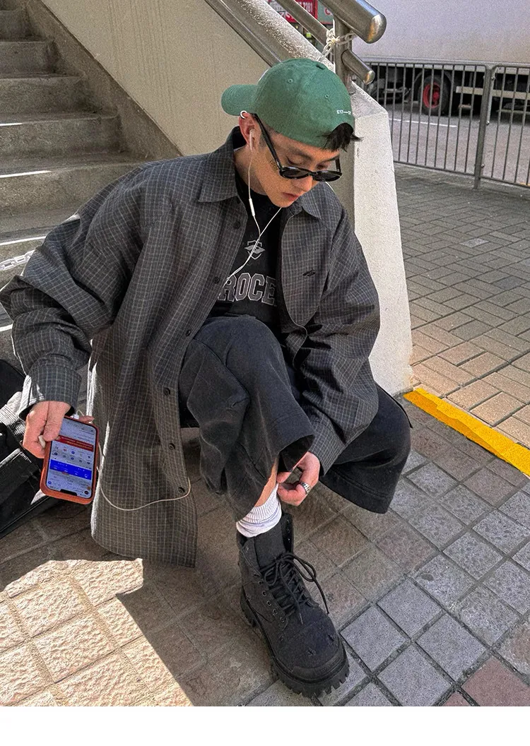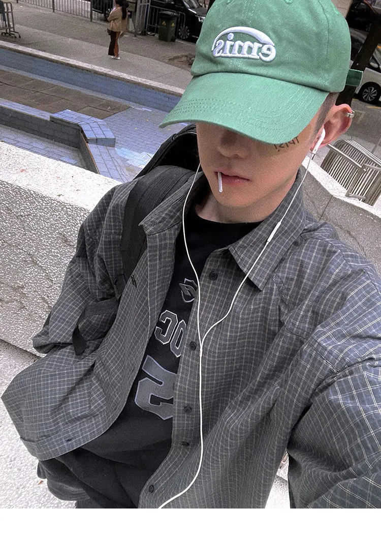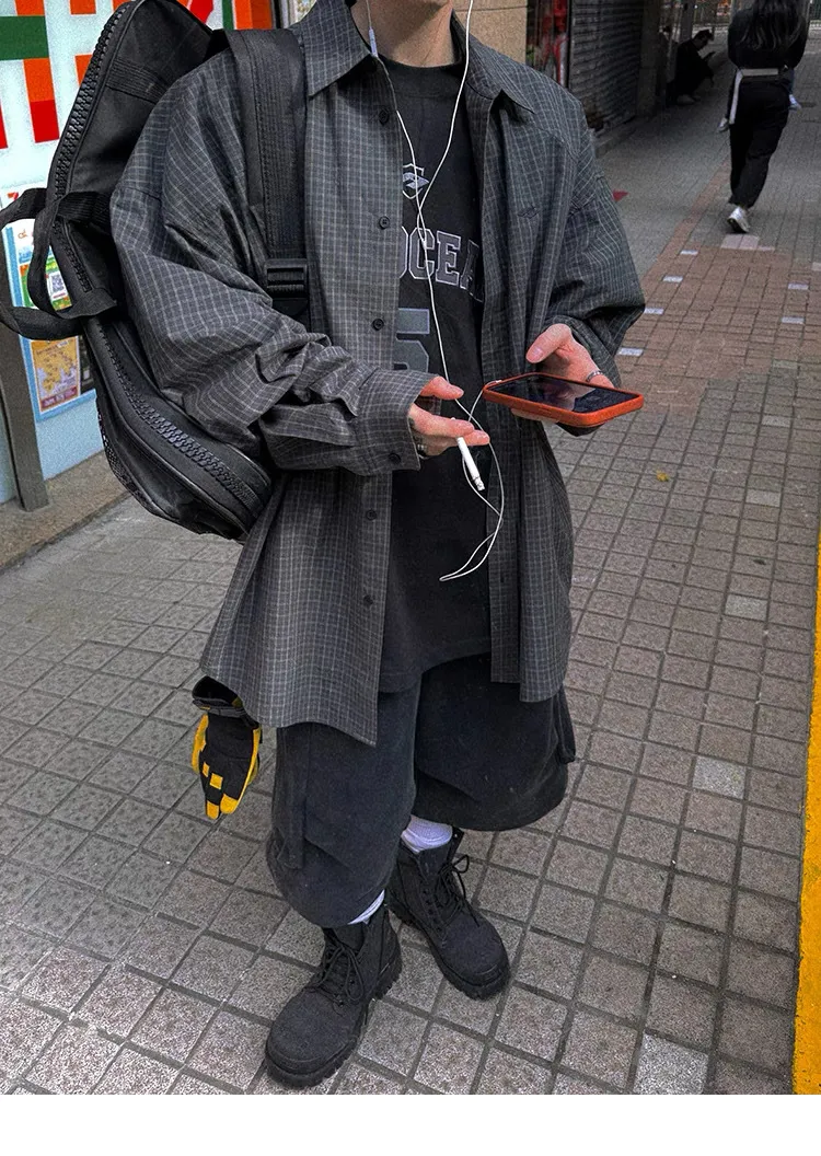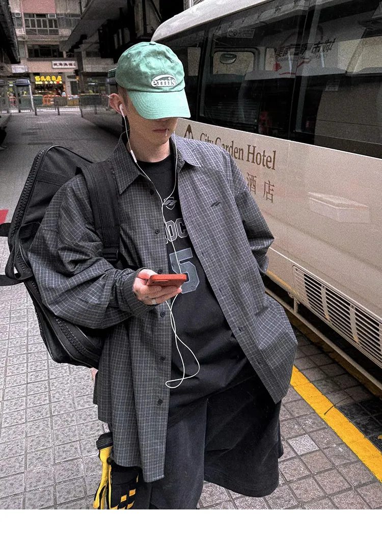 AUROCEAN 港風少年 寬肩闊型 撞色格紋 襯衫(灰綠色)