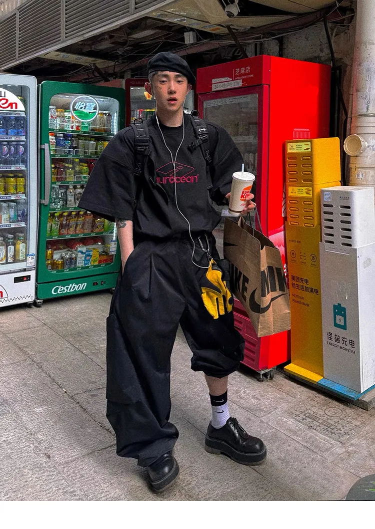 AUROCEAN 紅標刺繡 寬肩闊型 破壞 短袖(黑色)