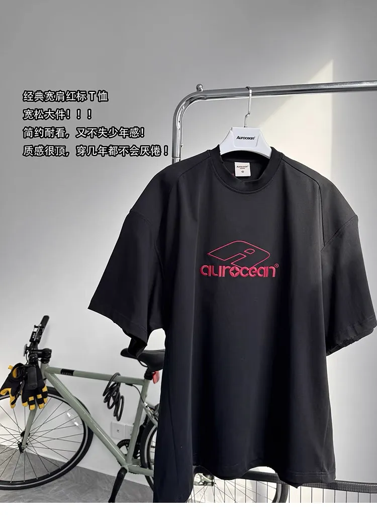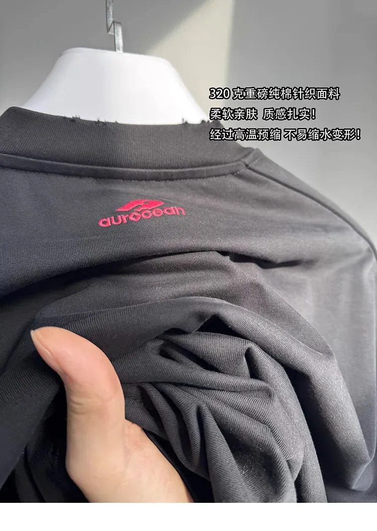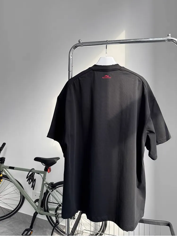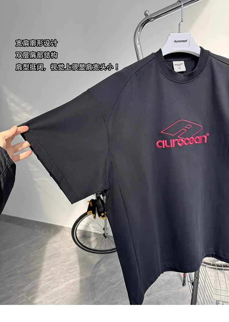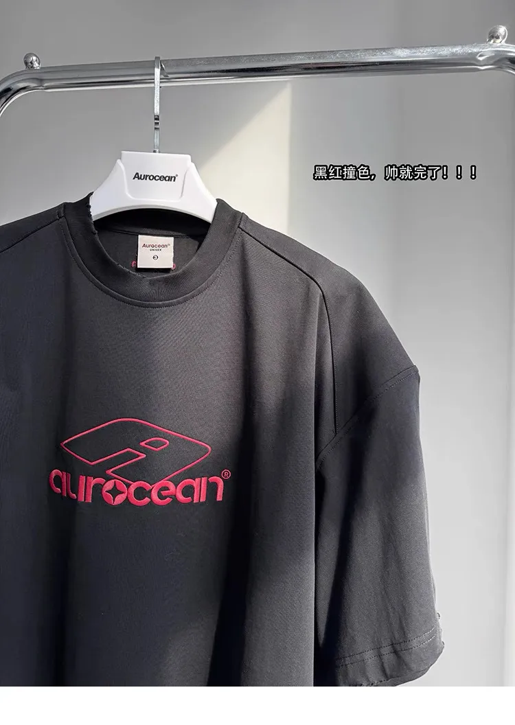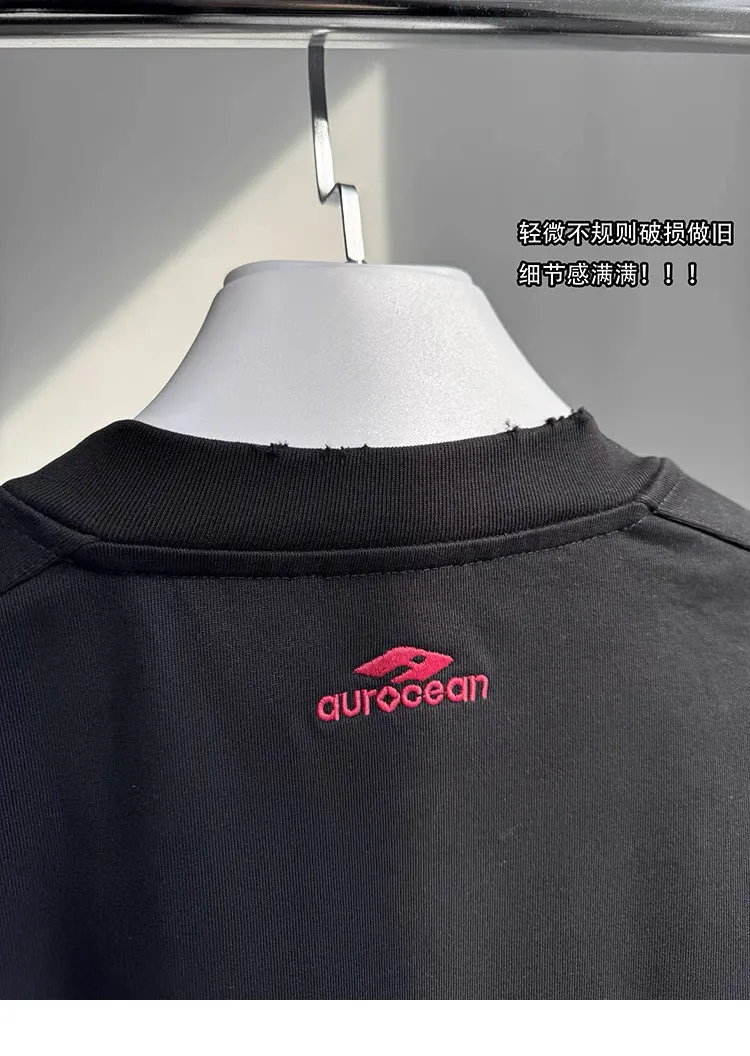 AUROCEAN 紅標刺繡 寬肩闊型 破壞 短袖(黑色)