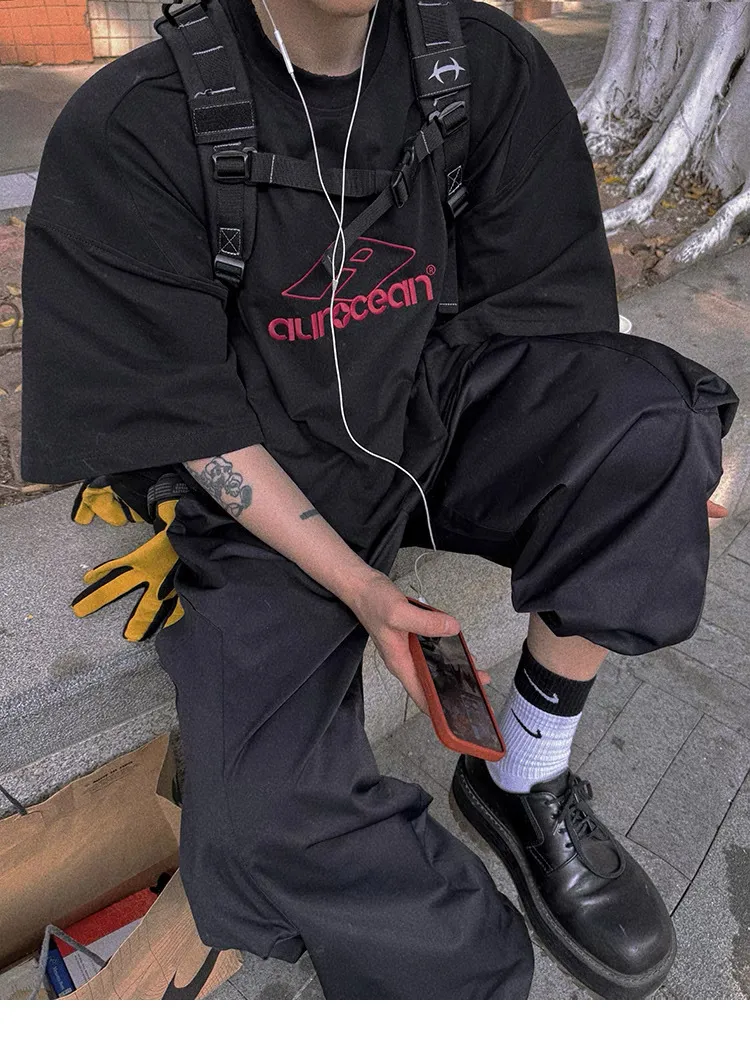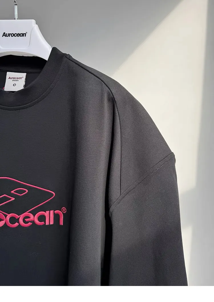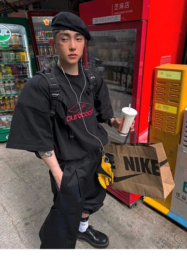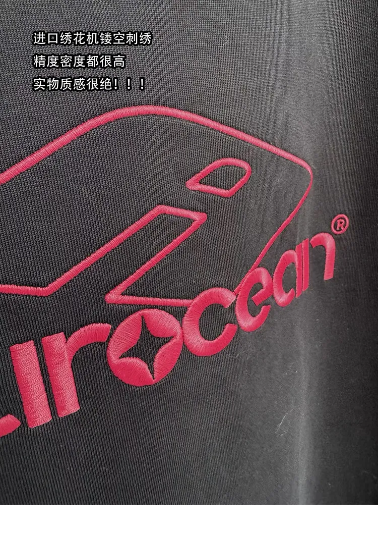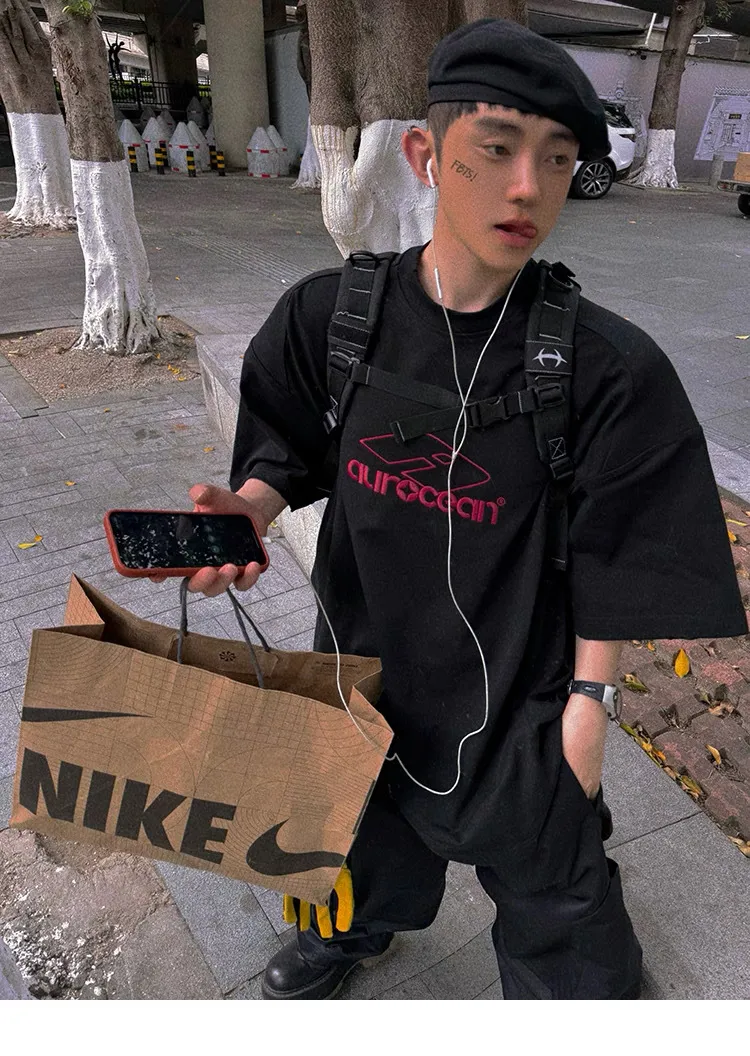 AUROCEAN 紅標刺繡 寬肩闊型 破壞 短袖(黑色)