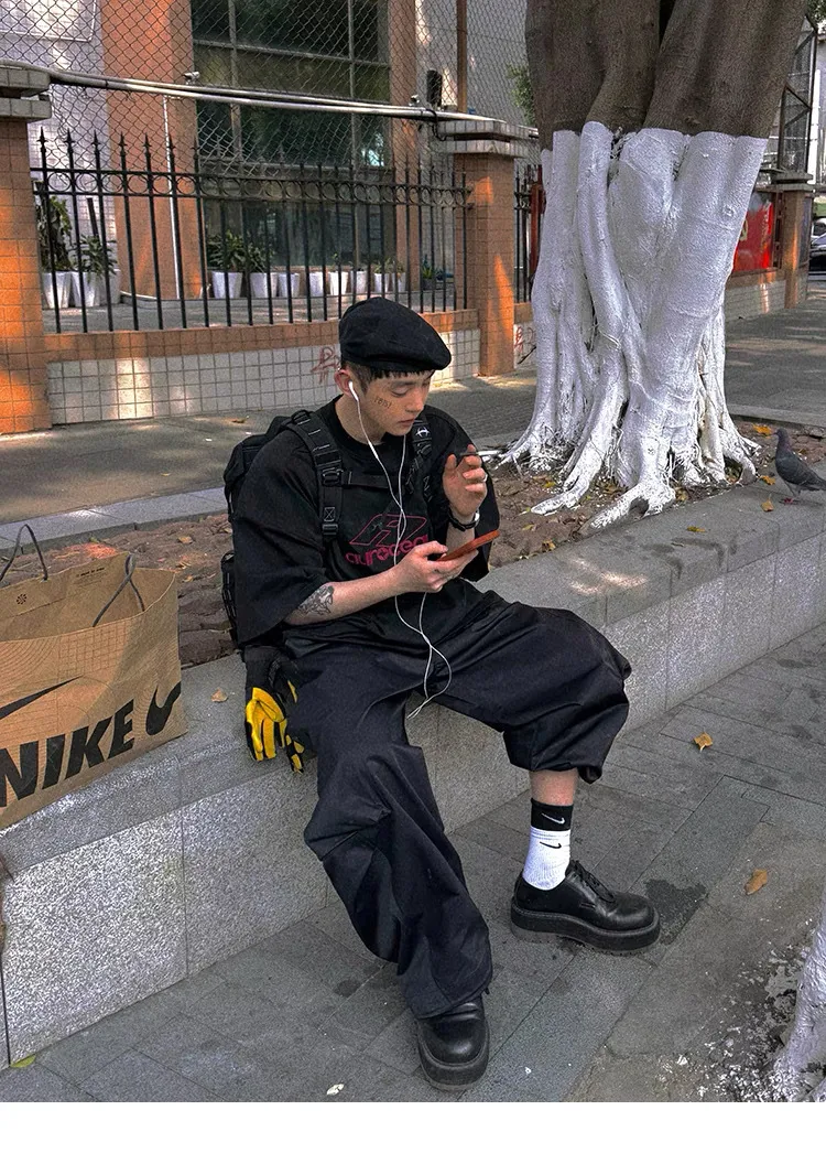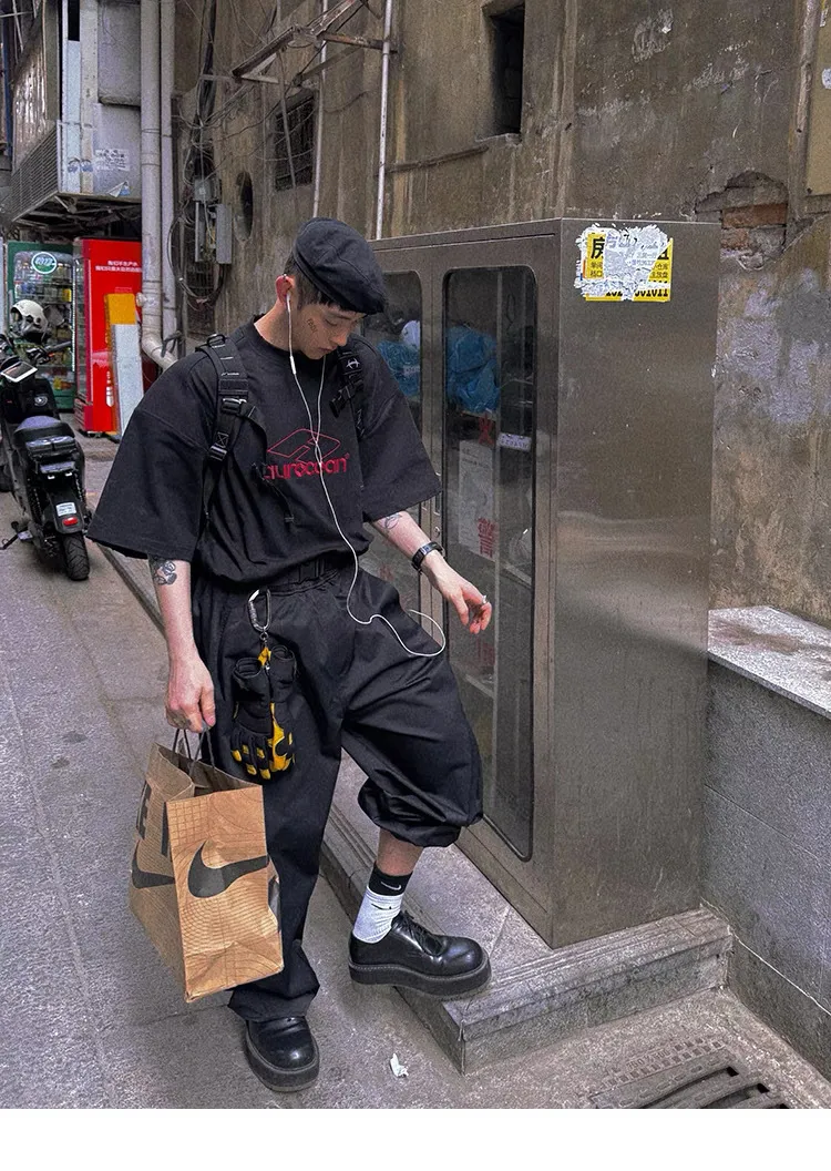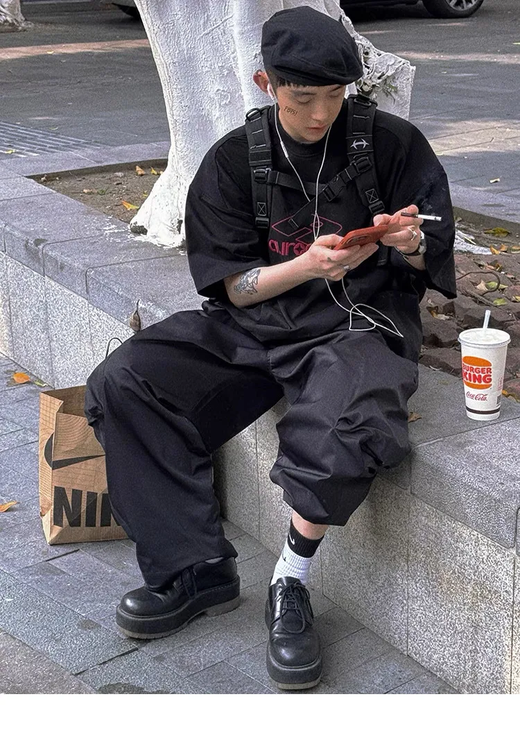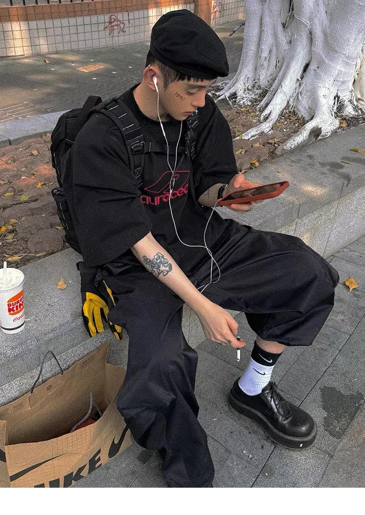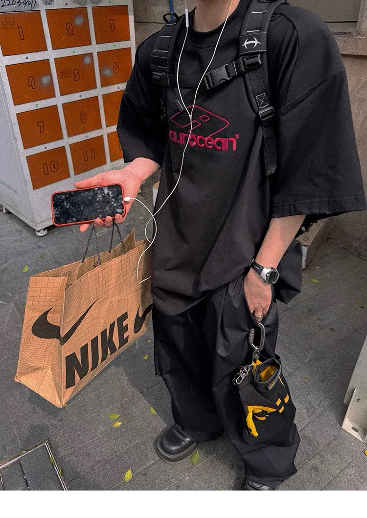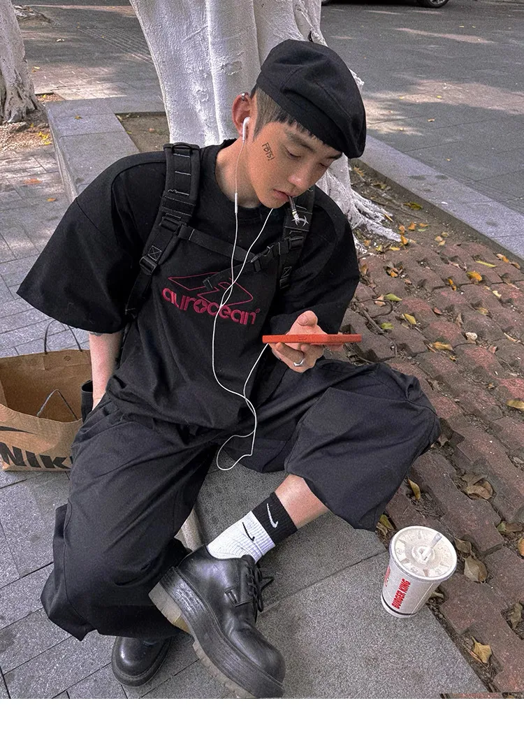 AUROCEAN 紅標刺繡 寬肩闊型 破壞 短袖(黑色)