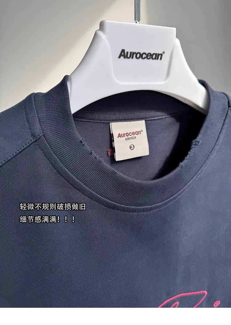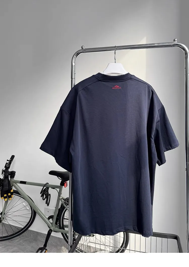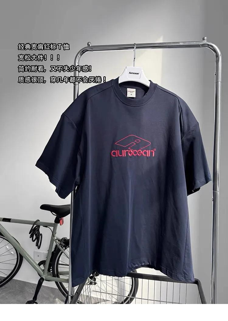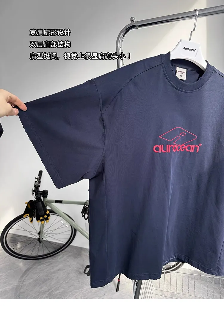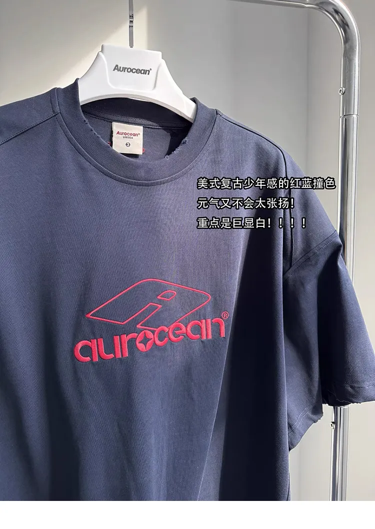AUROCEAN 紅標刺繡 寬肩闊型 破壞 短袖(藏青色)