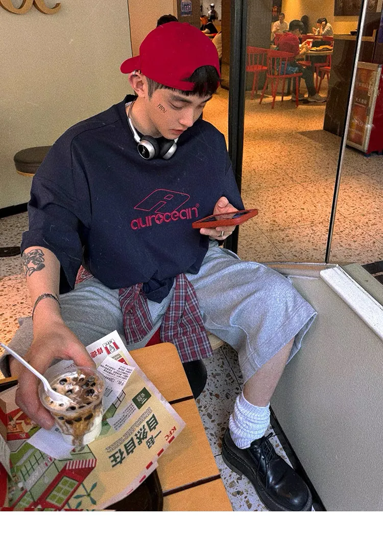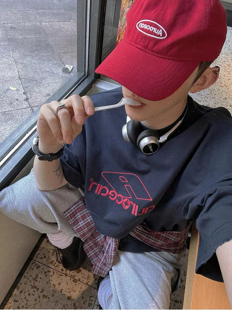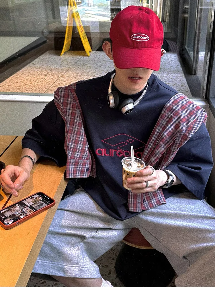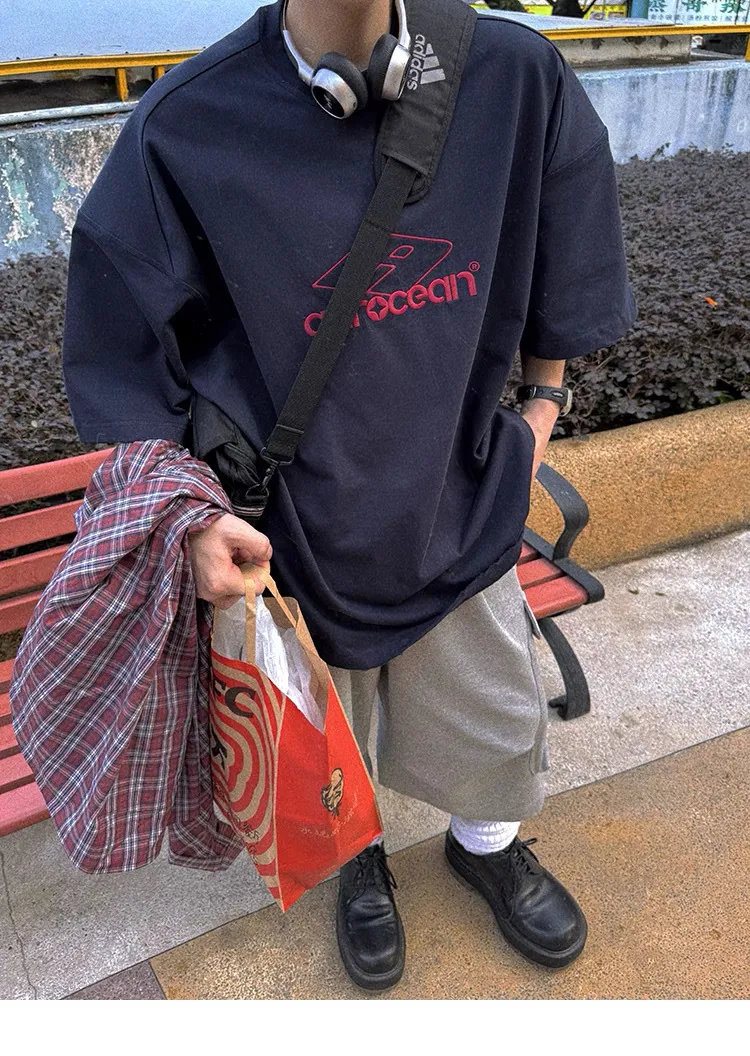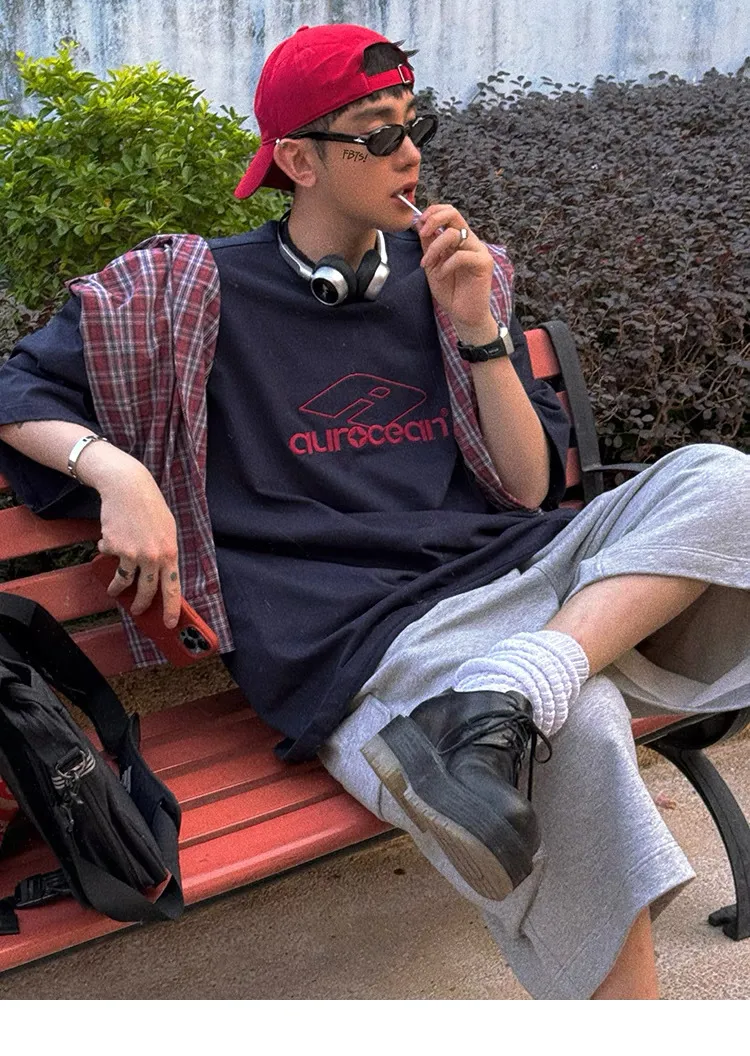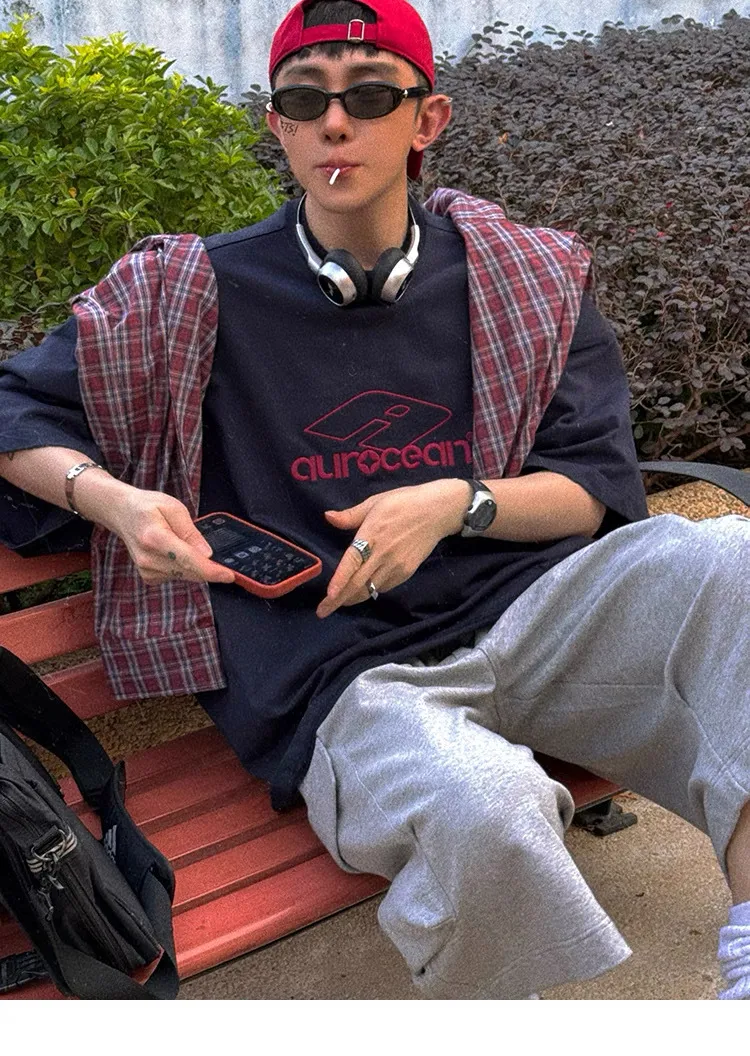 AUROCEAN 紅標刺繡 寬肩闊型 破壞 短袖(藏青色)