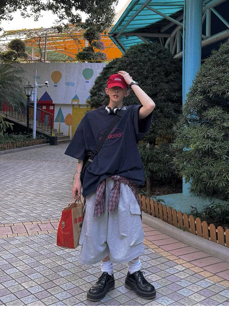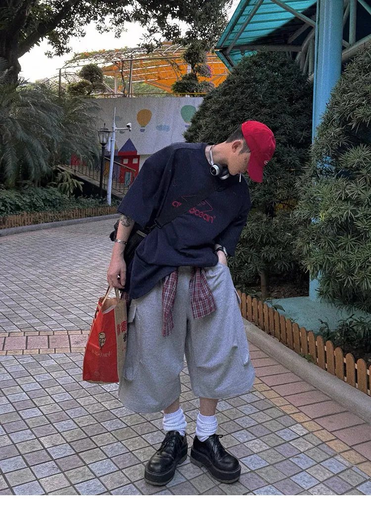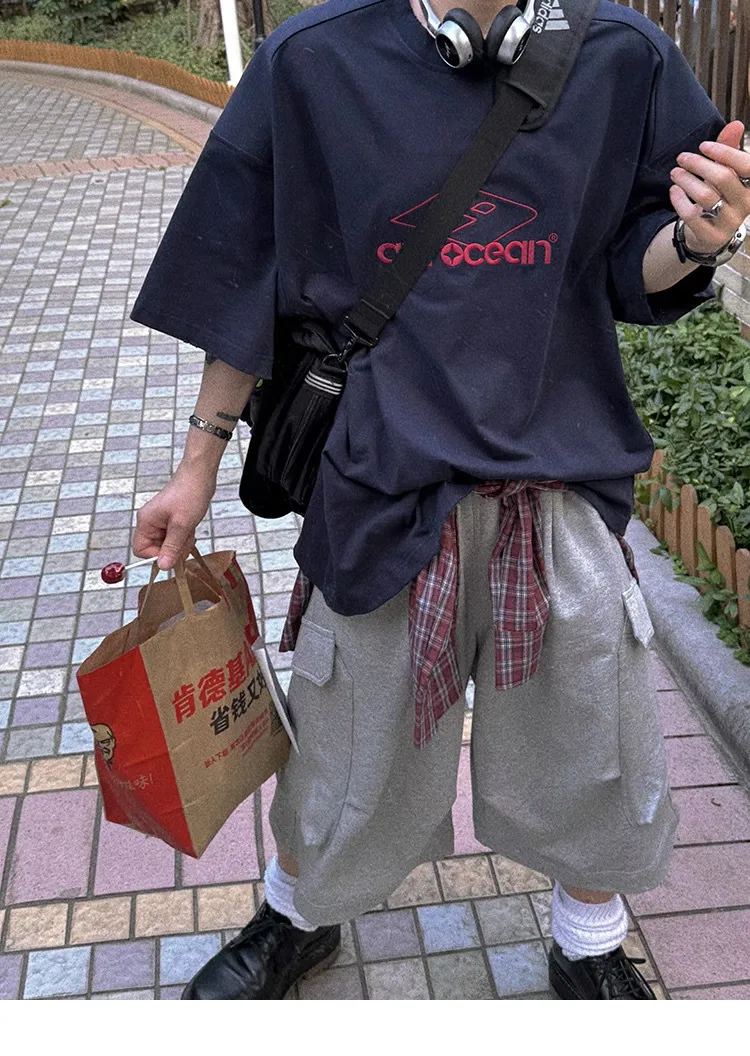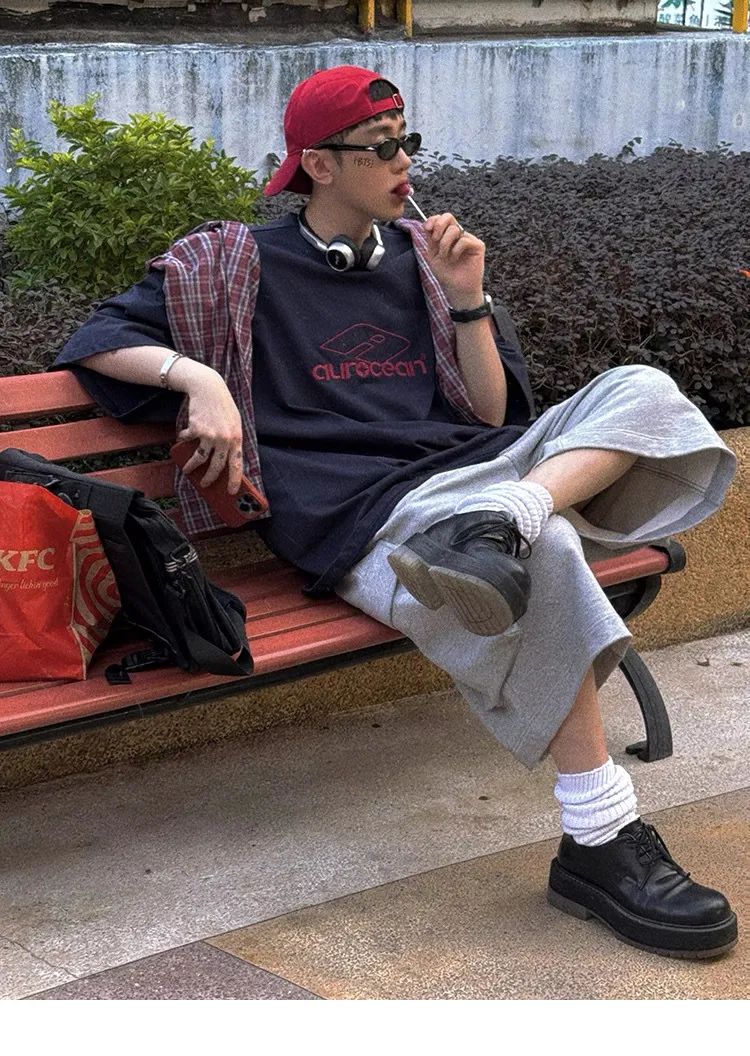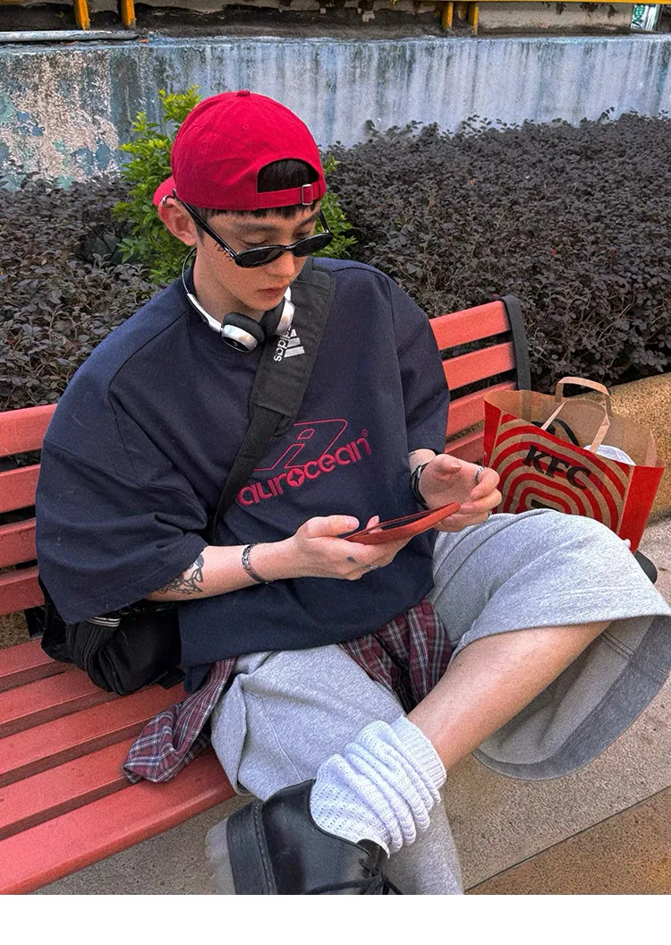 AUROCEAN 紅標刺繡 寬肩闊型 破壞 短袖(藏青色)