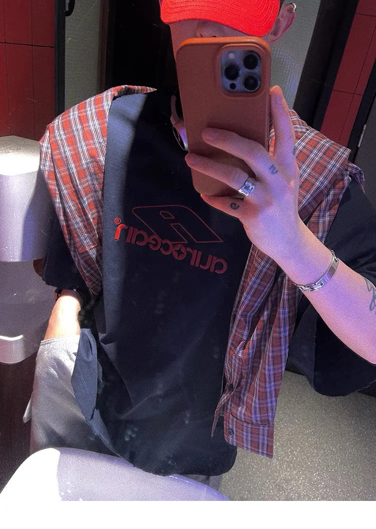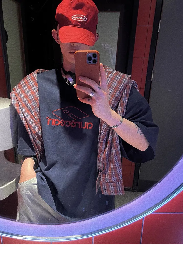 AUROCEAN 紅標刺繡 寬肩闊型 破壞 短袖(黑色)