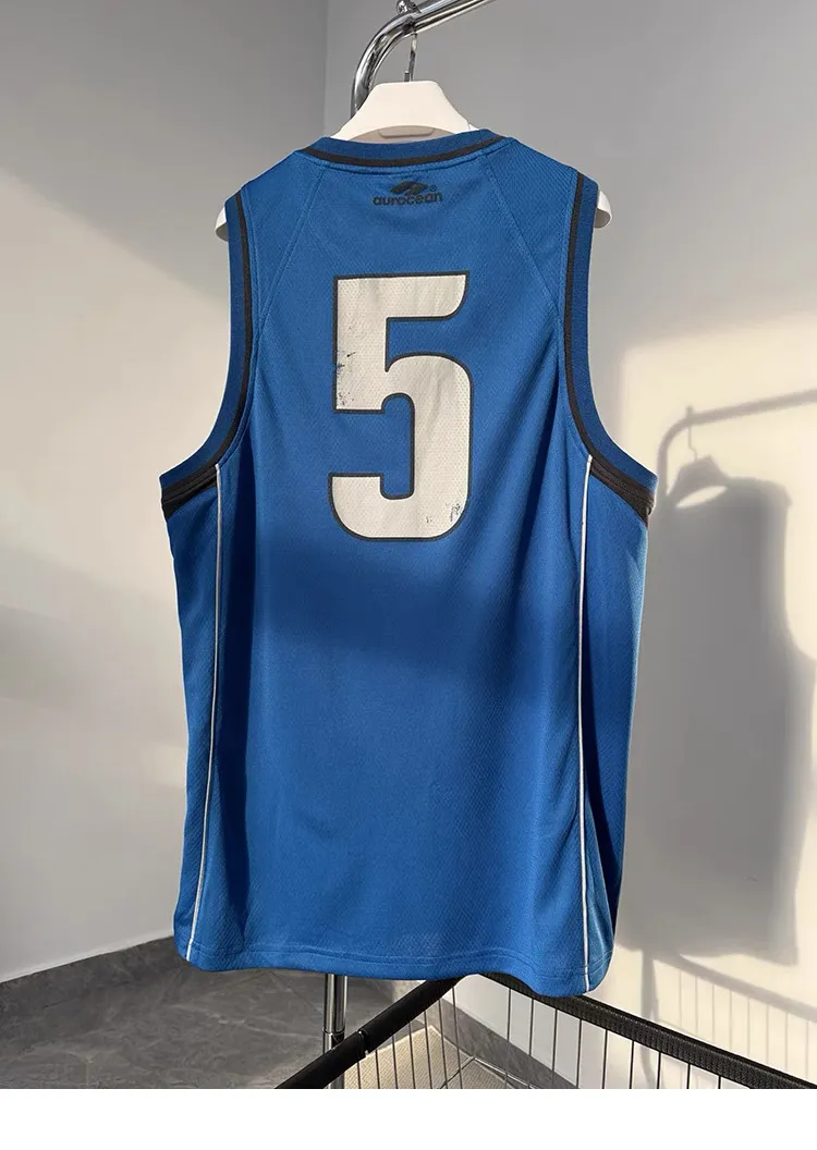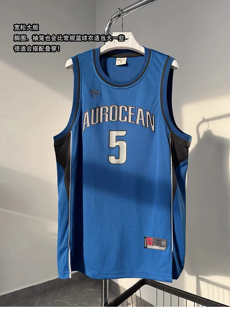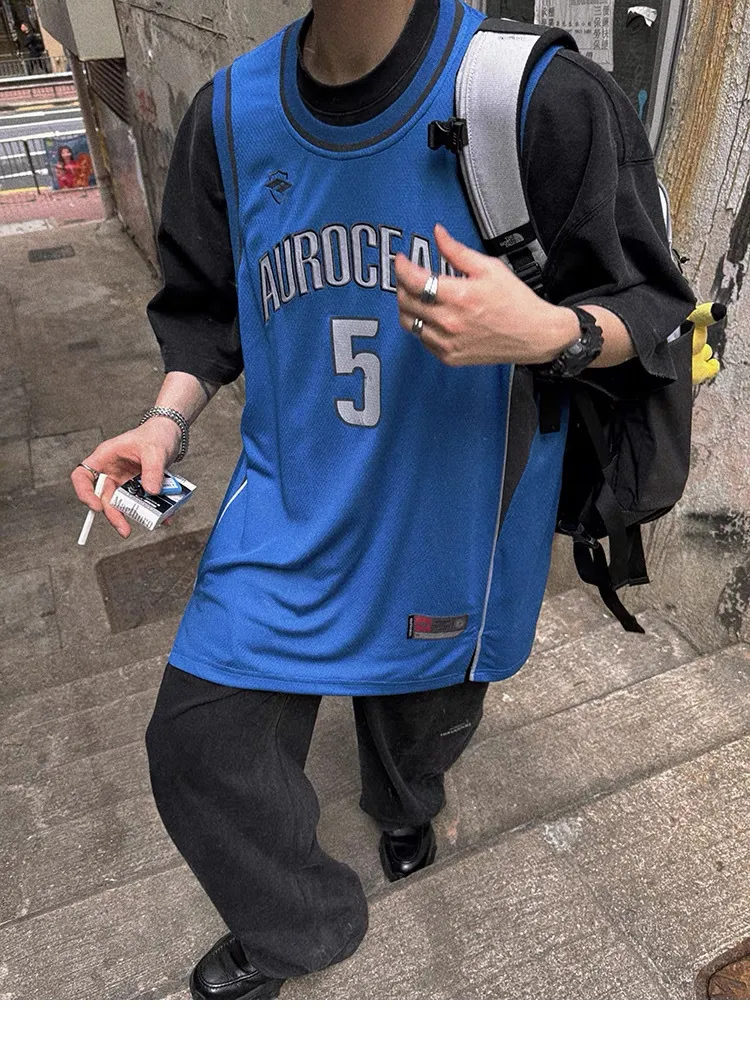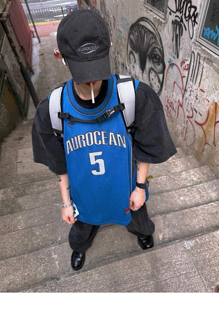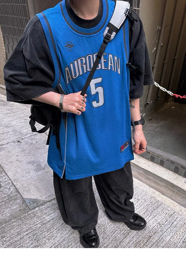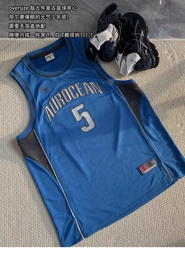AUROCEAN 拼色復古 超大件 刺繡 球衣 背心(藍色)