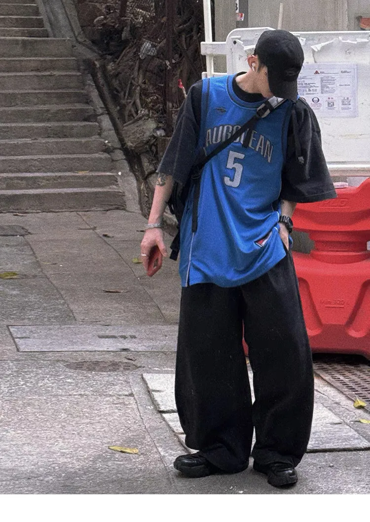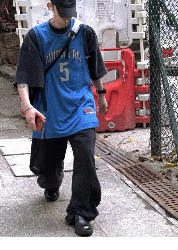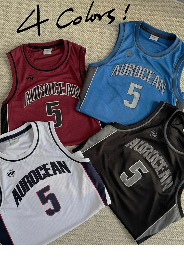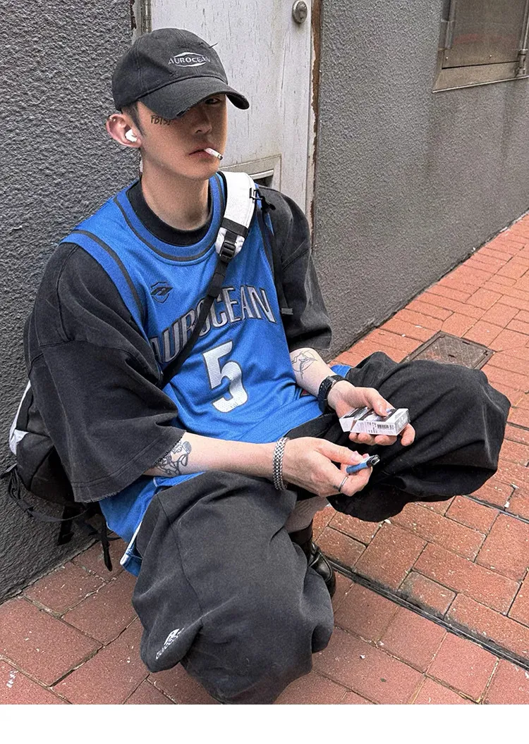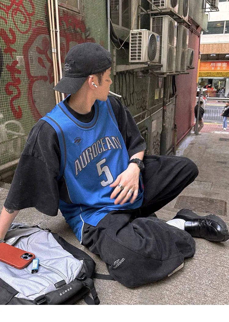 AUROCEAN 拼色復古 超大件 刺繡 球衣 背心(黑色)