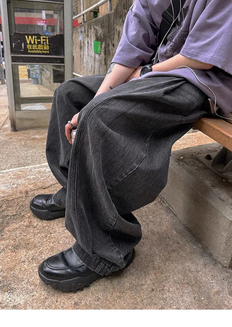 AUROCEAN 寬鬆輕盈 水洗 純棉彎刀 長褲(水洗黑色)