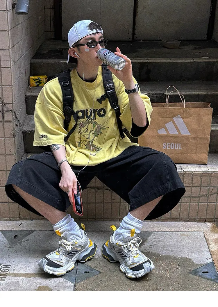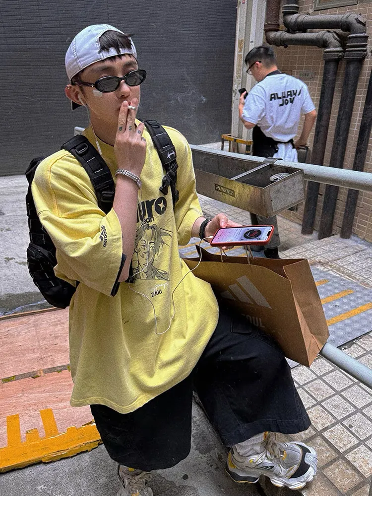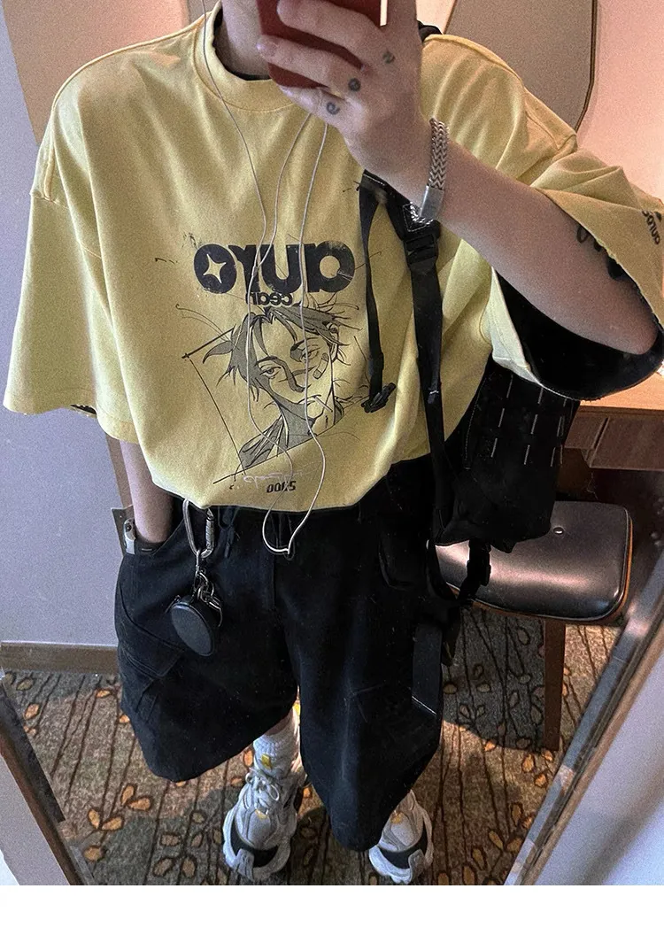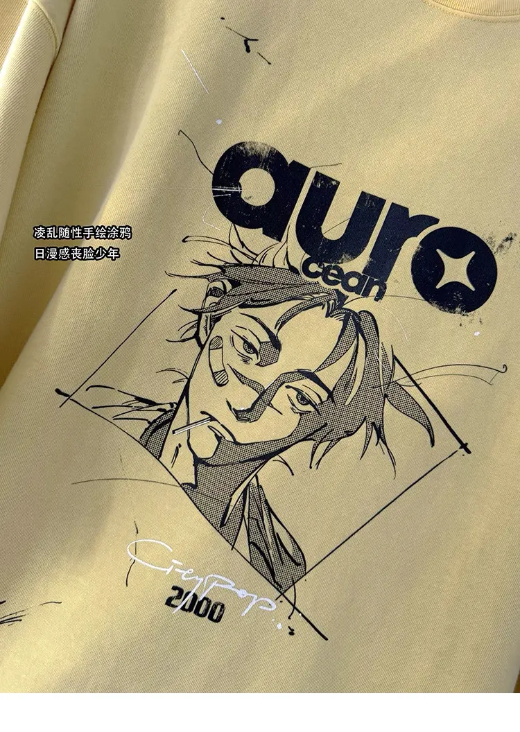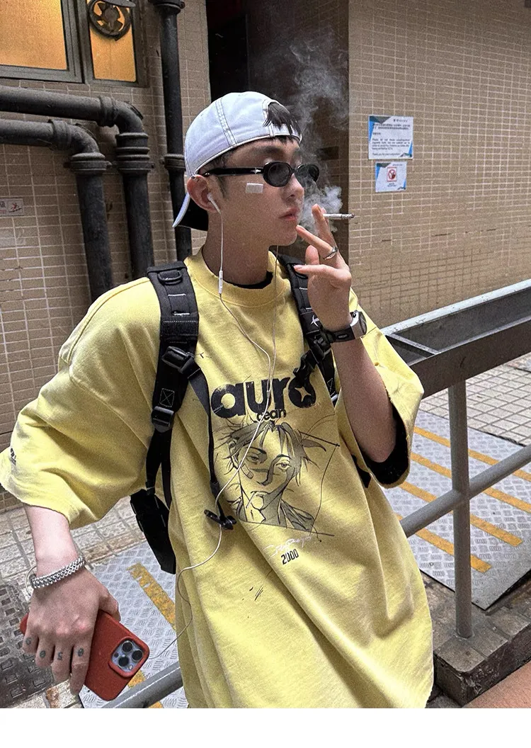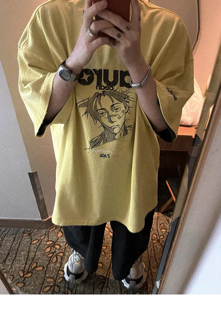 AUROCEAN 喪臉脹相 做舊日漫 OVERSIZE 短袖(奶黃色)