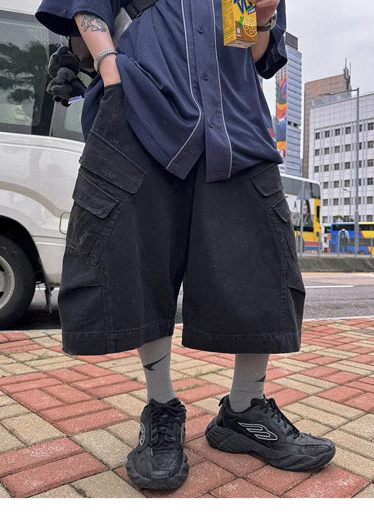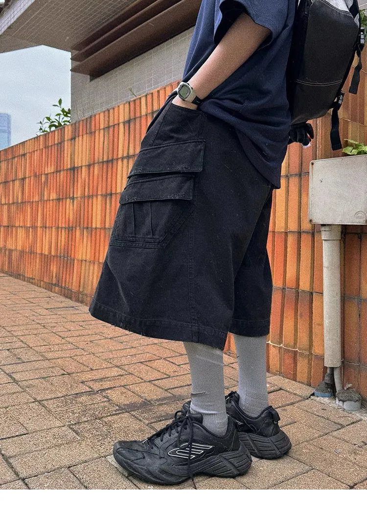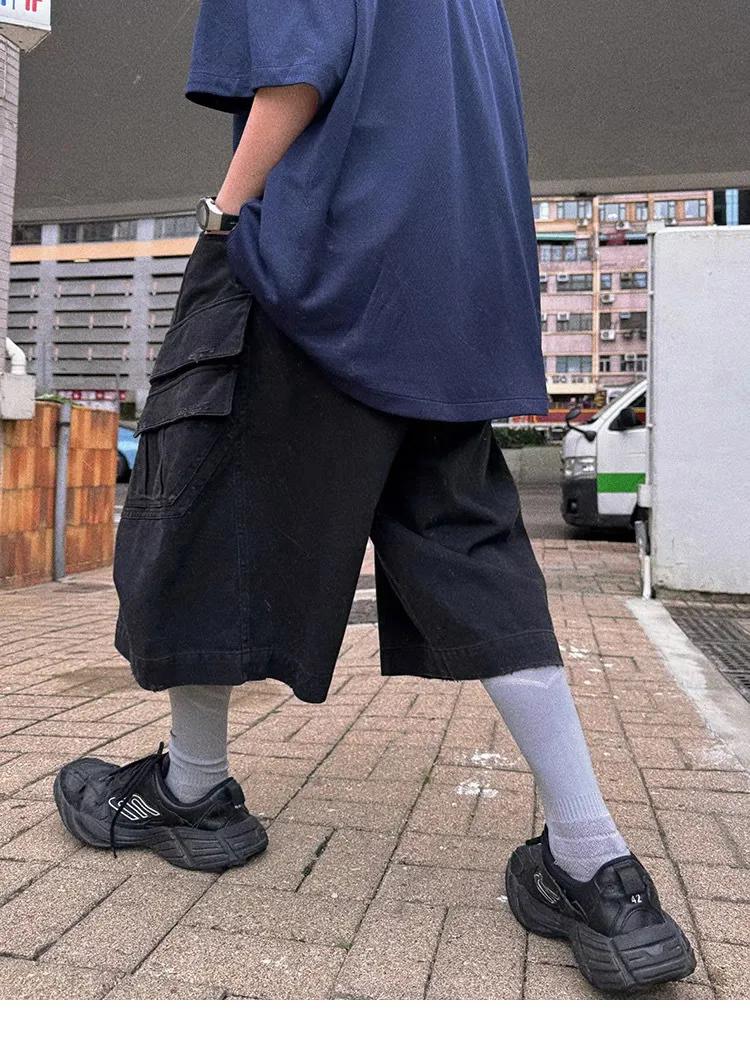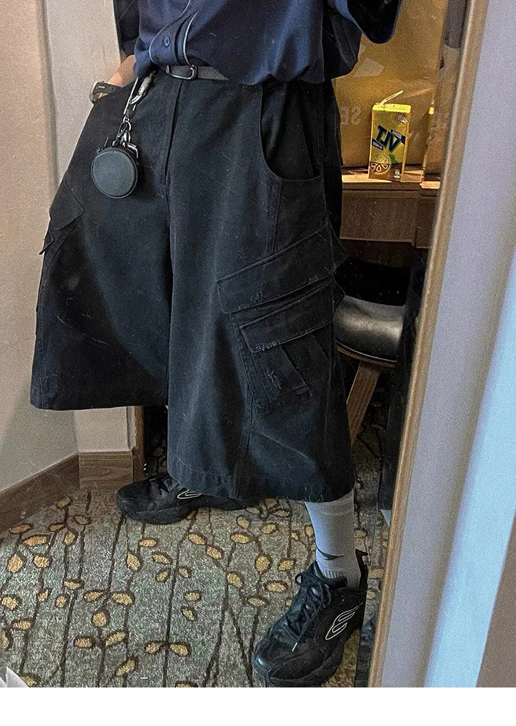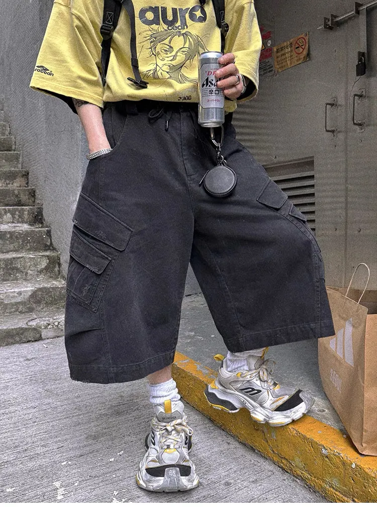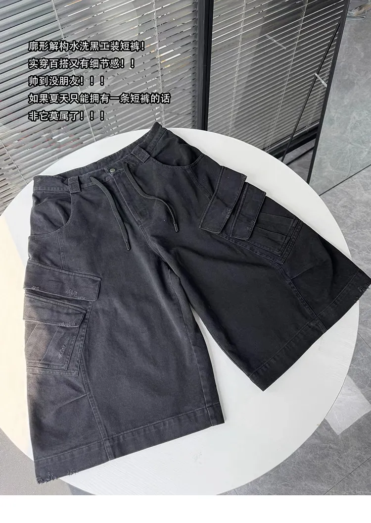 AUROCEAN 雙口袋 水洗做舊 寬大 七分褲(水洗黑色)
