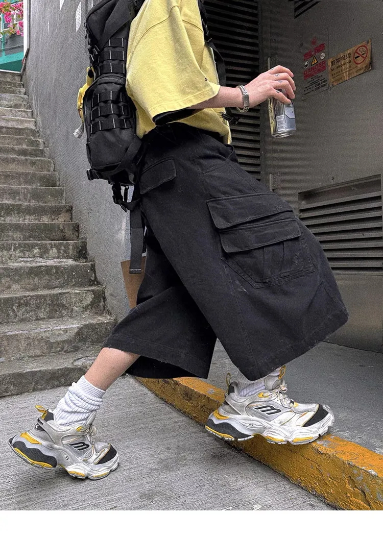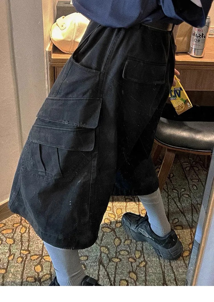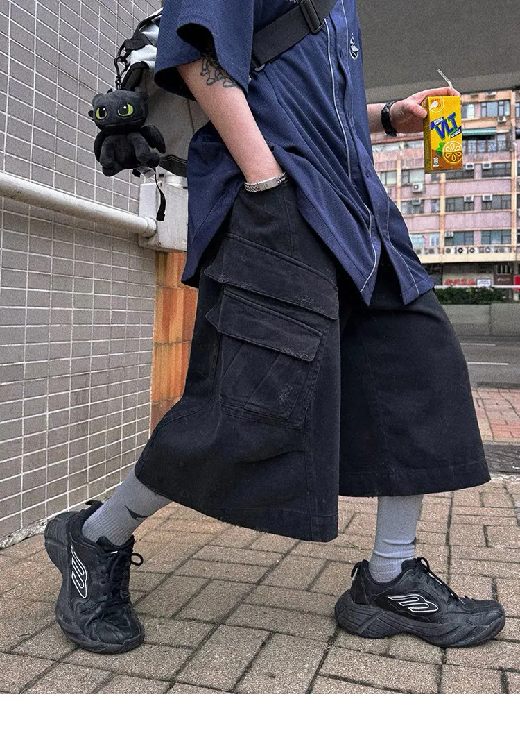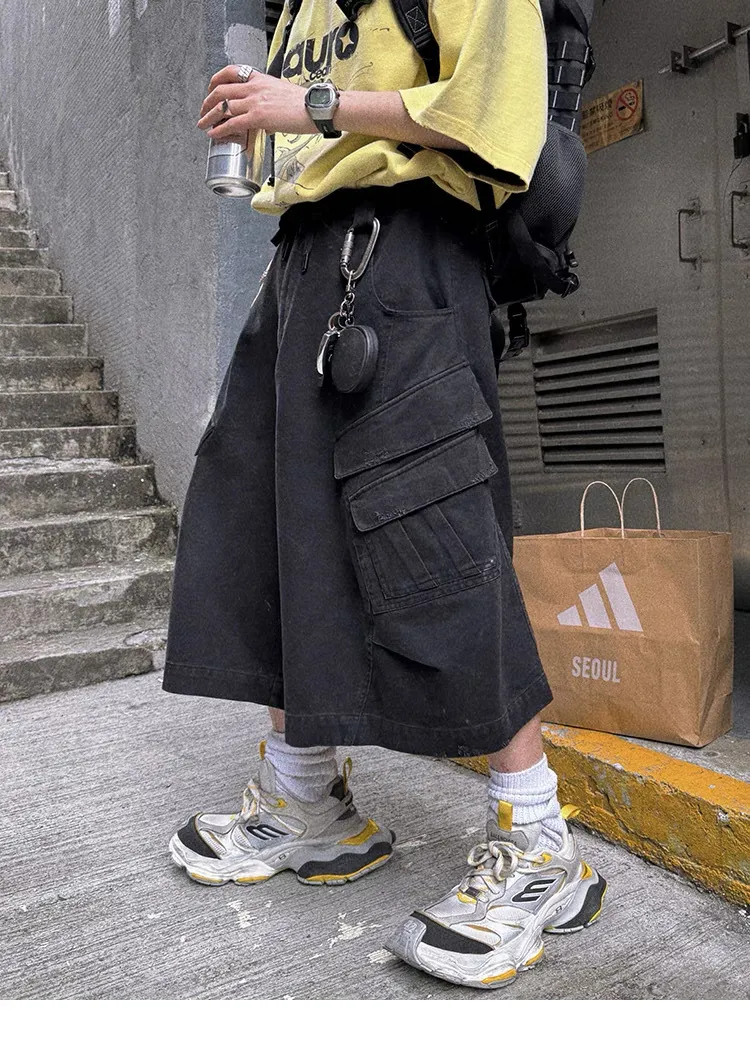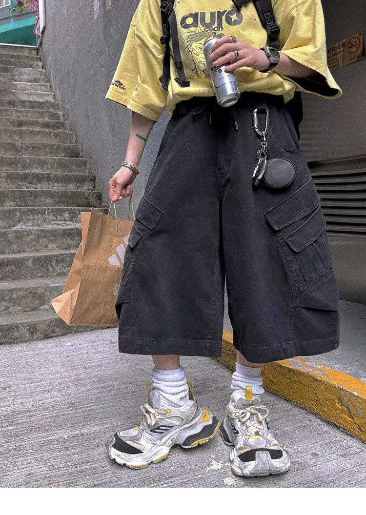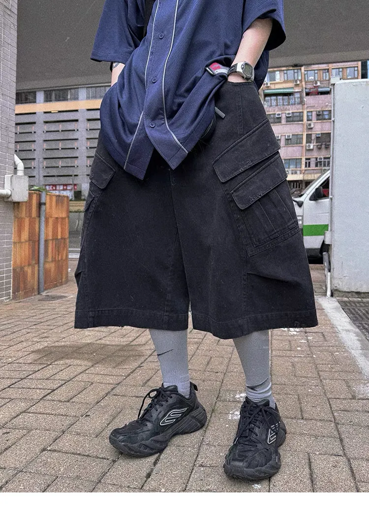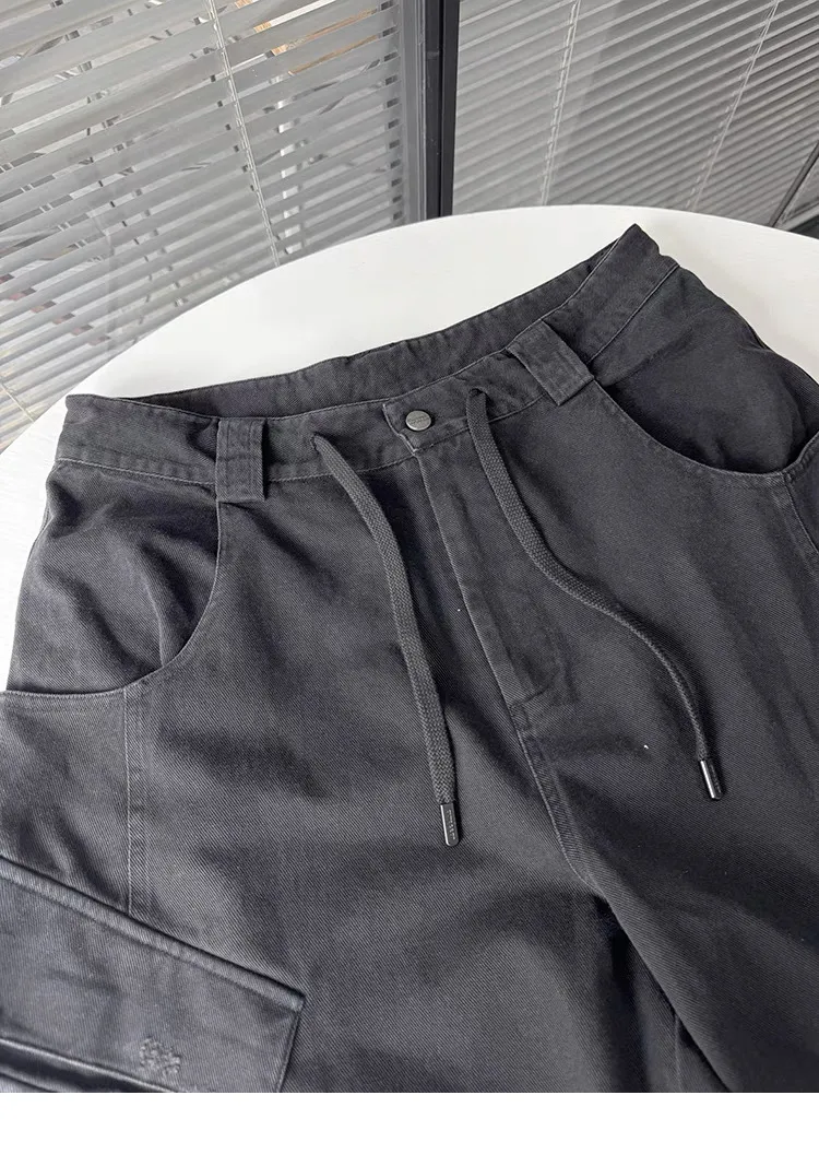 AUROCEAN 雙口袋 水洗做舊 寬大 七分褲(水洗黑色)
