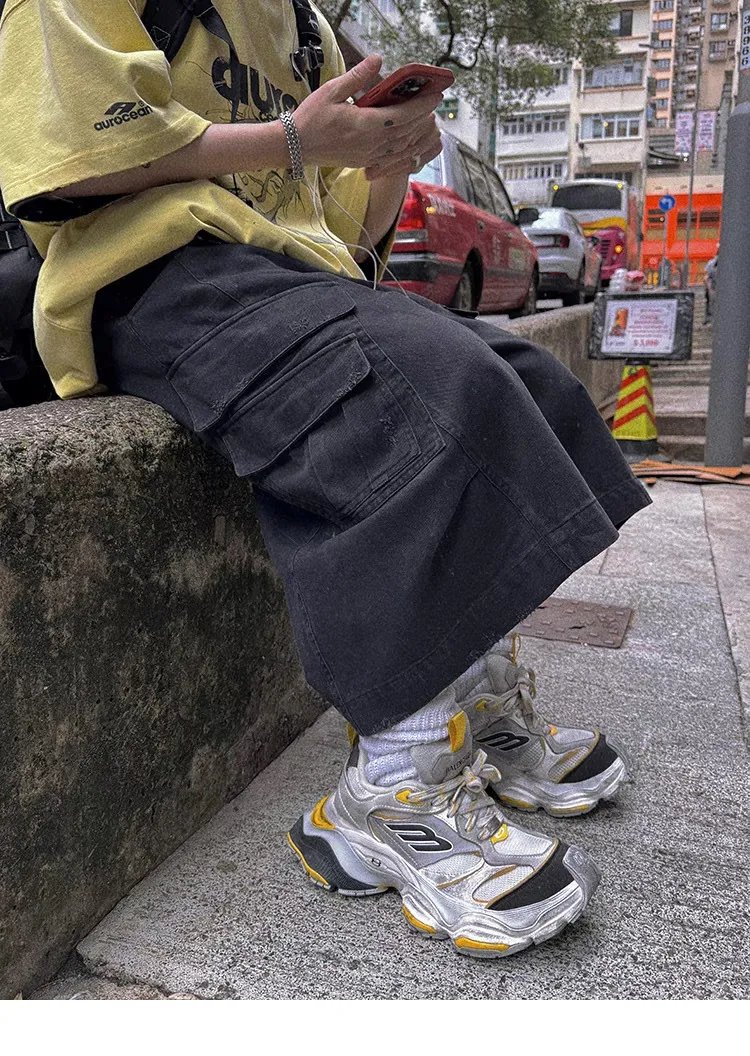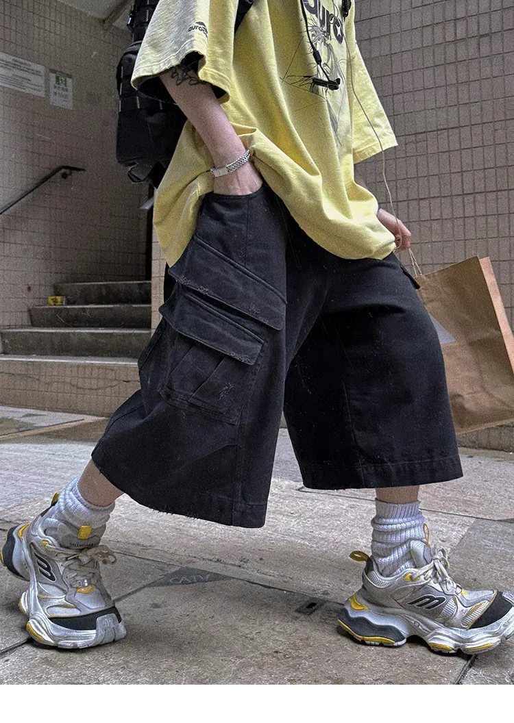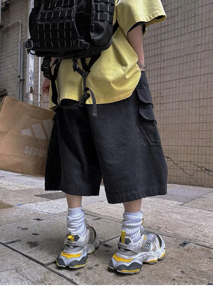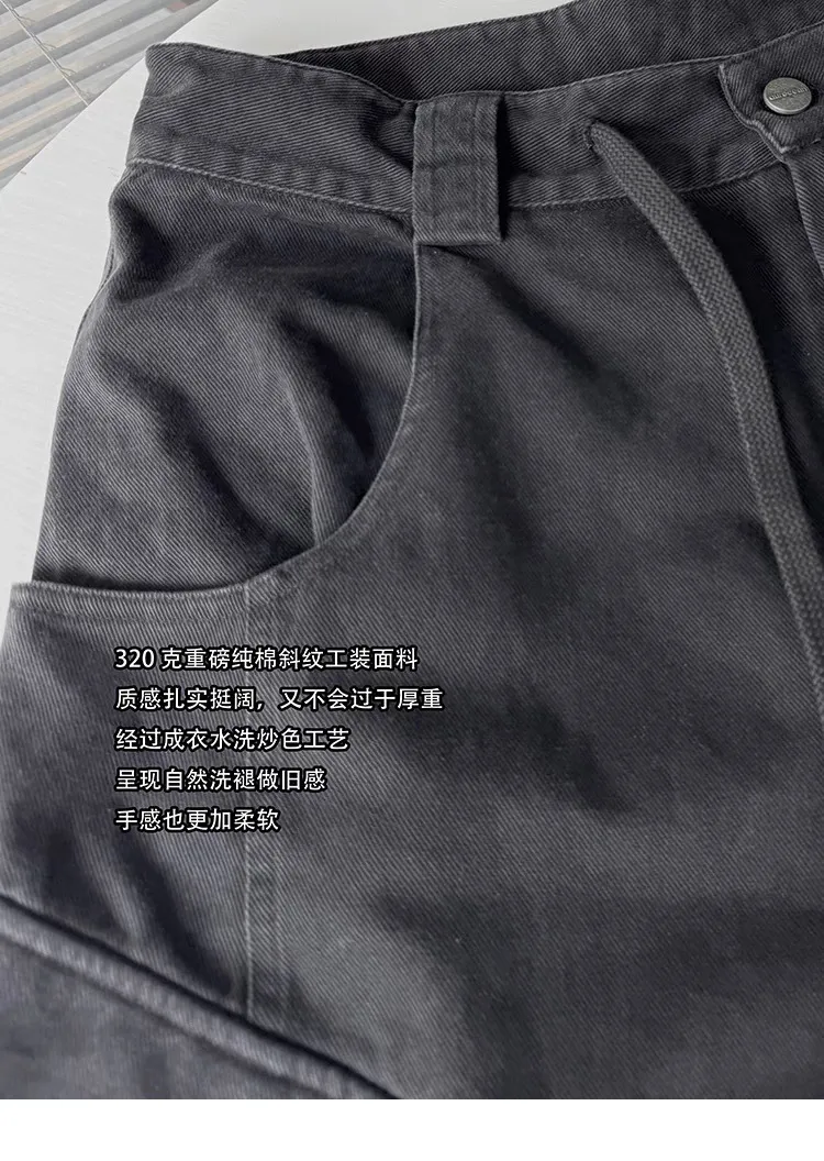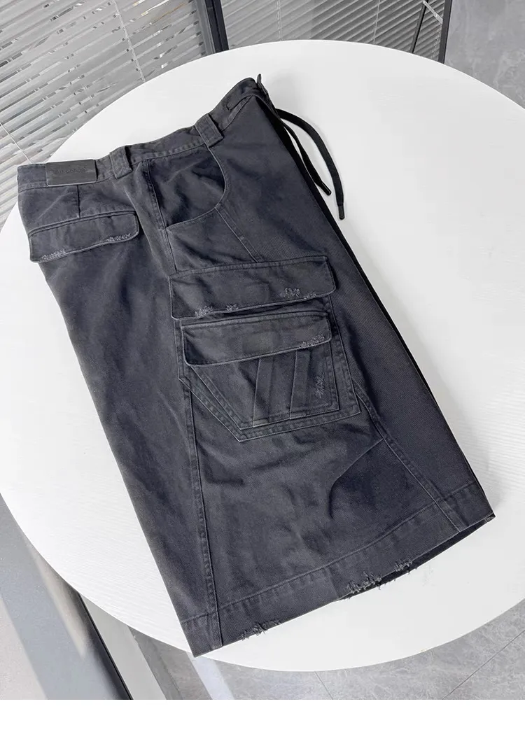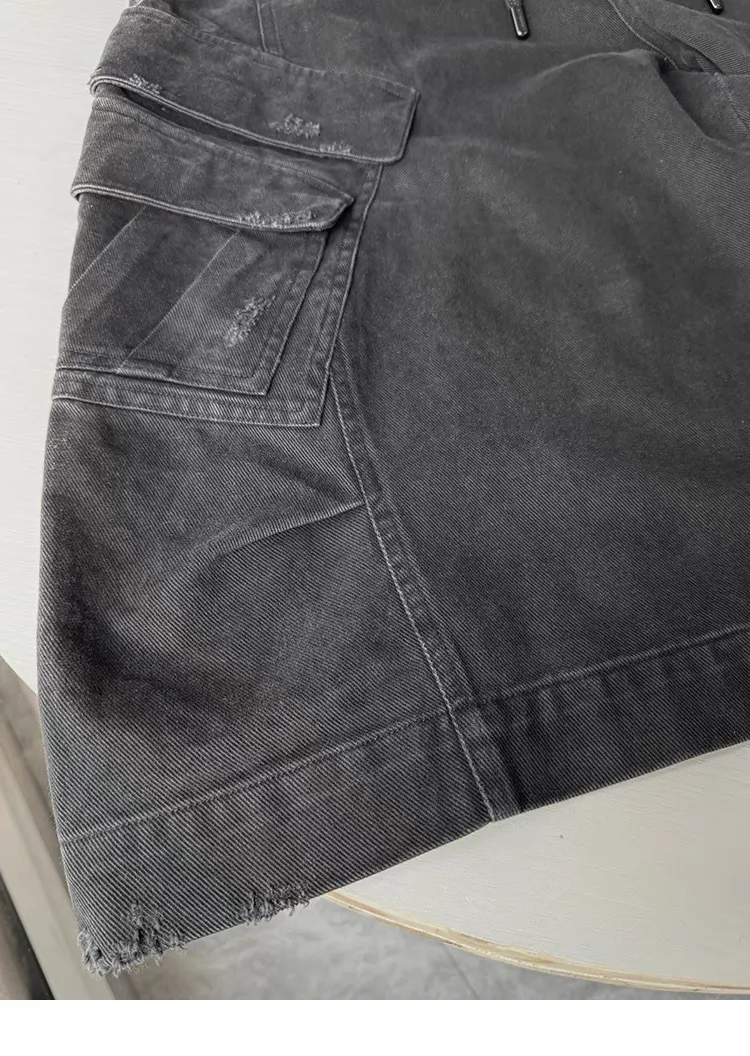 AUROCEAN 雙口袋 做舊破壞 廓形工裝 七分褲(銀灰色)