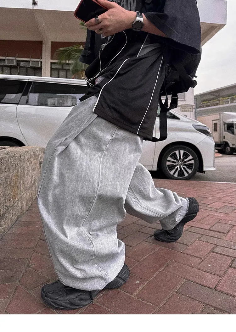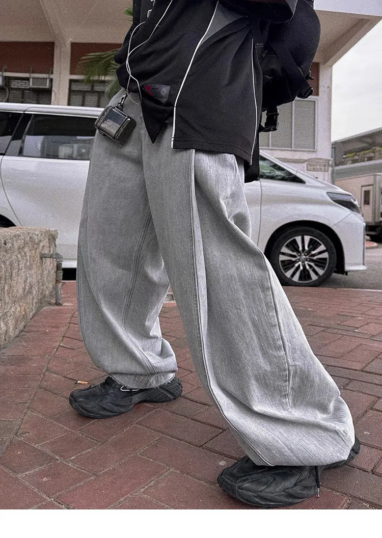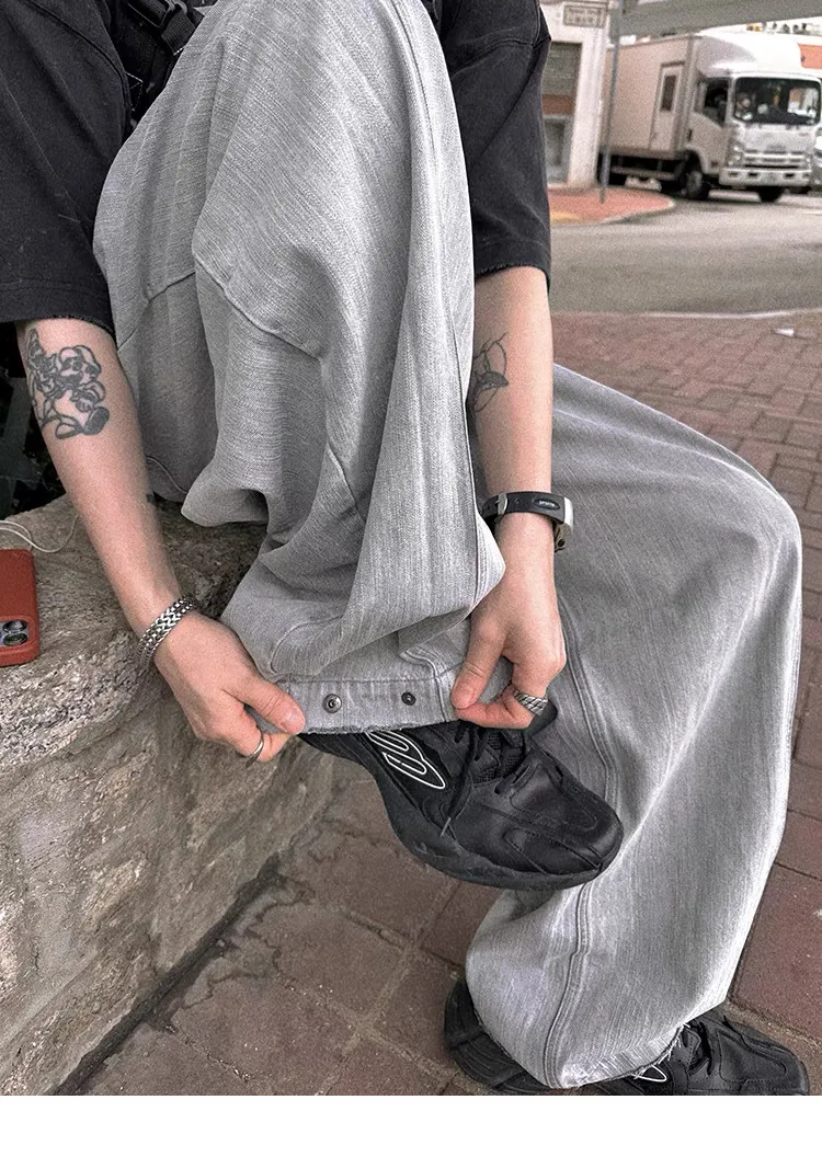 AUROCEAN 寬鬆輕盈 水洗 純棉彎刀 長褲(淺花灰色)