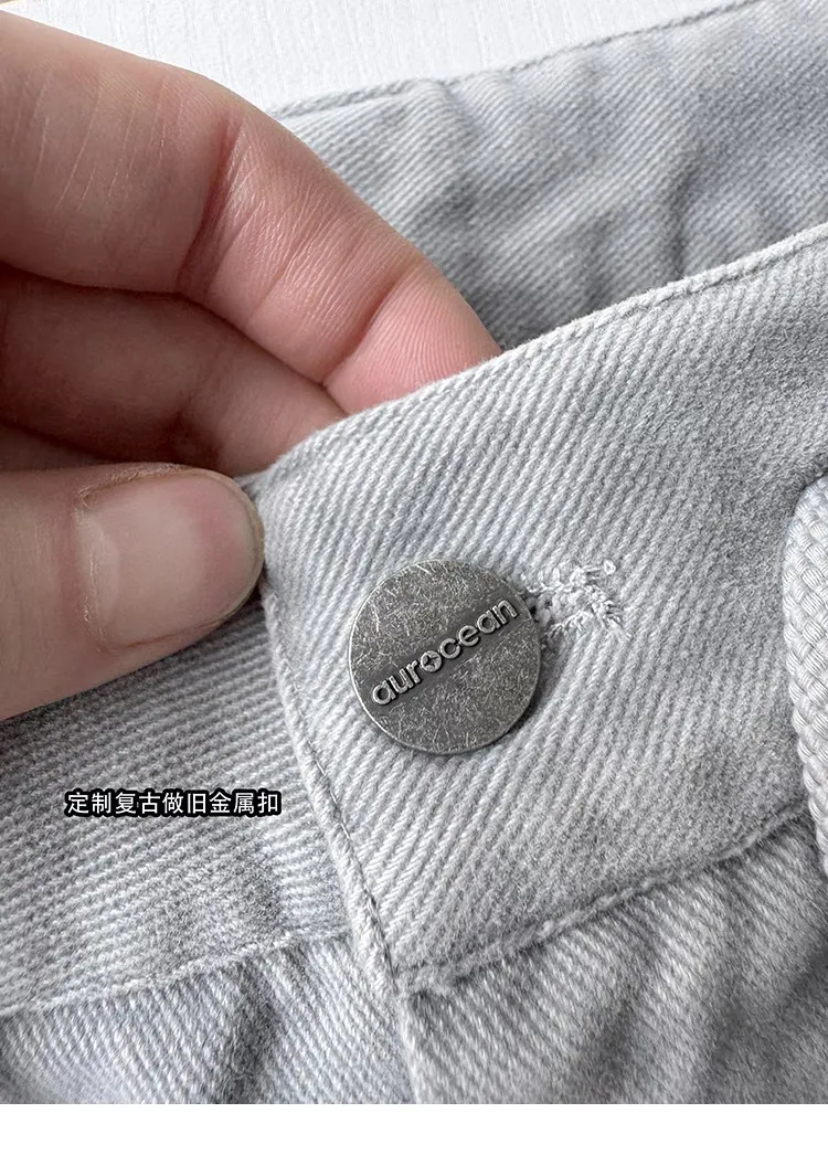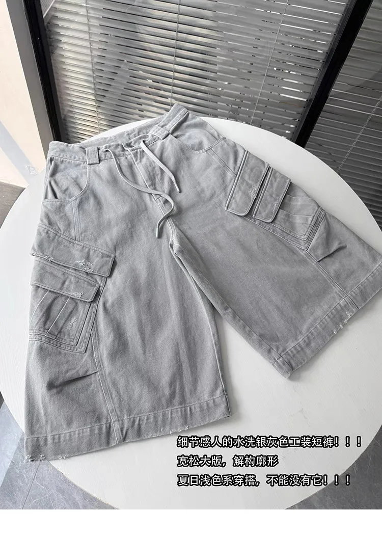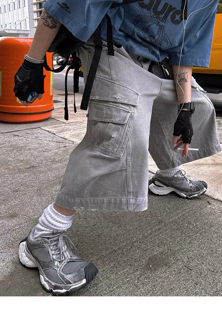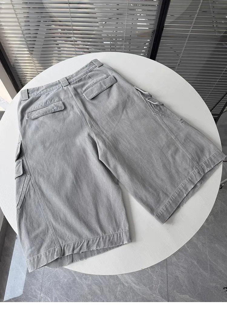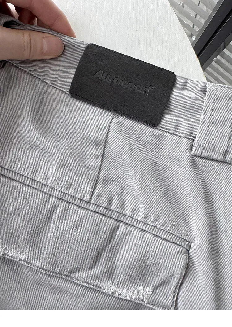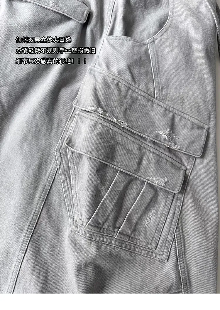 AUROCEAN 雙口袋 做舊破壞 廓形工裝 七分褲(銀灰色)