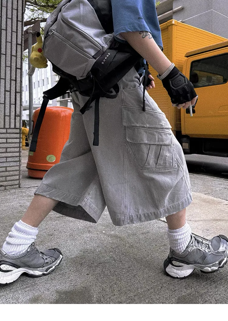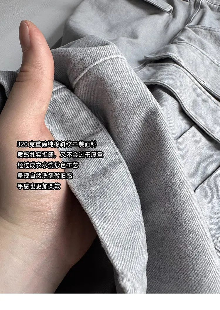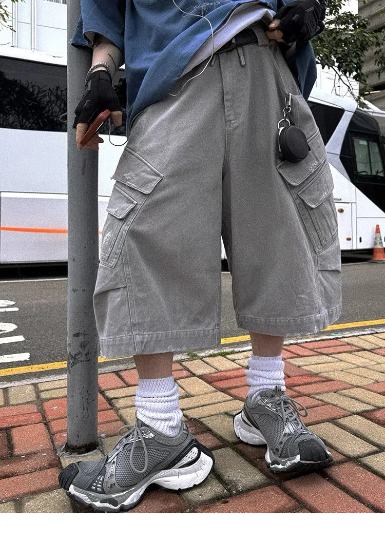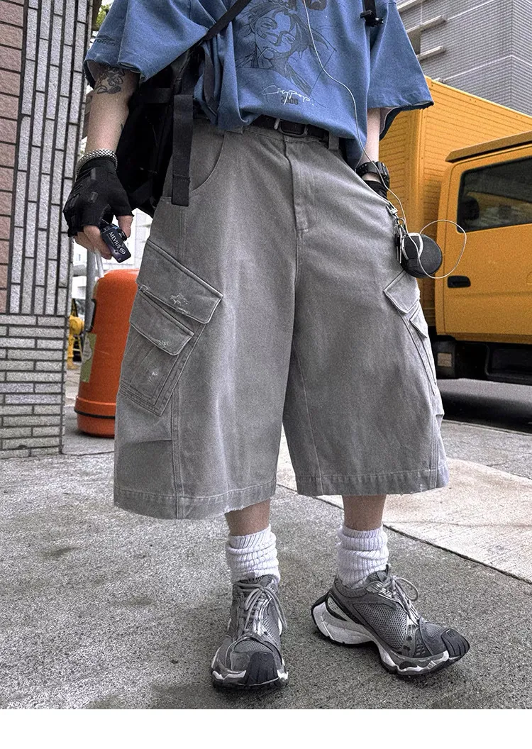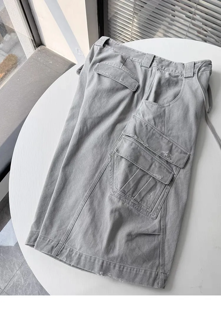 AUROCEAN 雙口袋 做舊破壞 廓形工裝 七分褲(銀灰色)