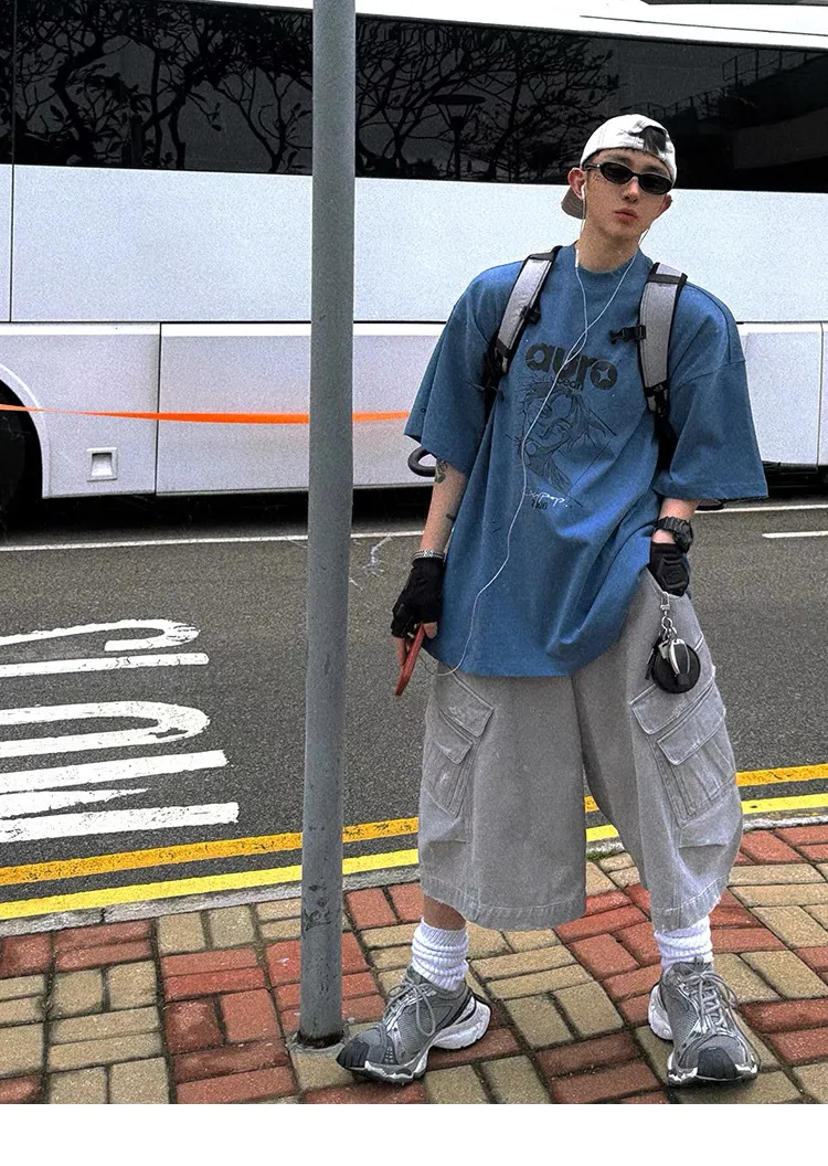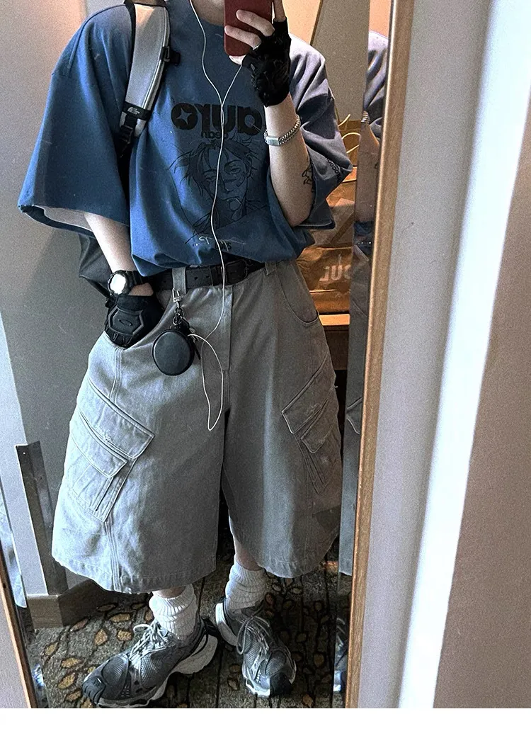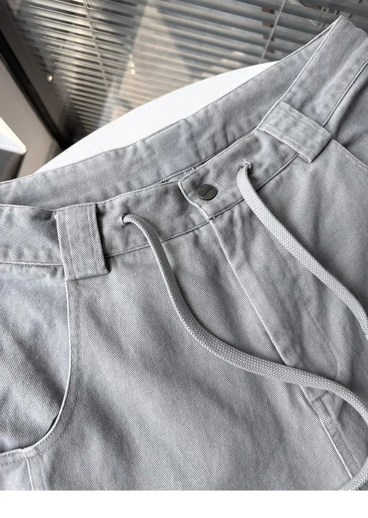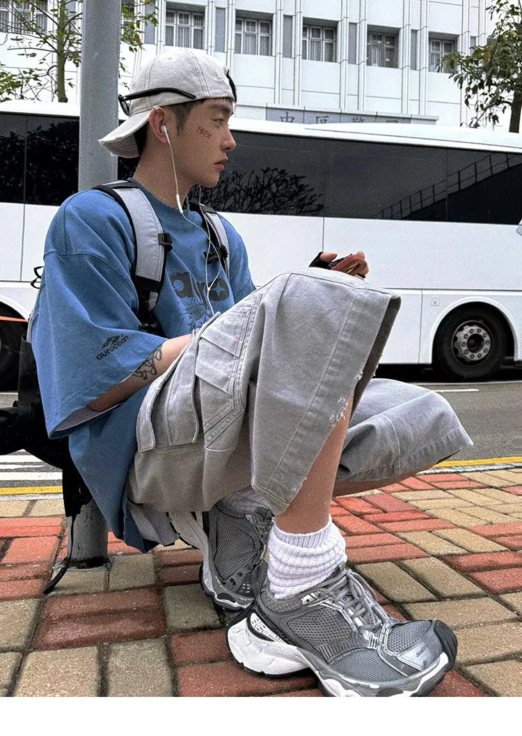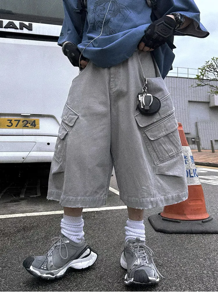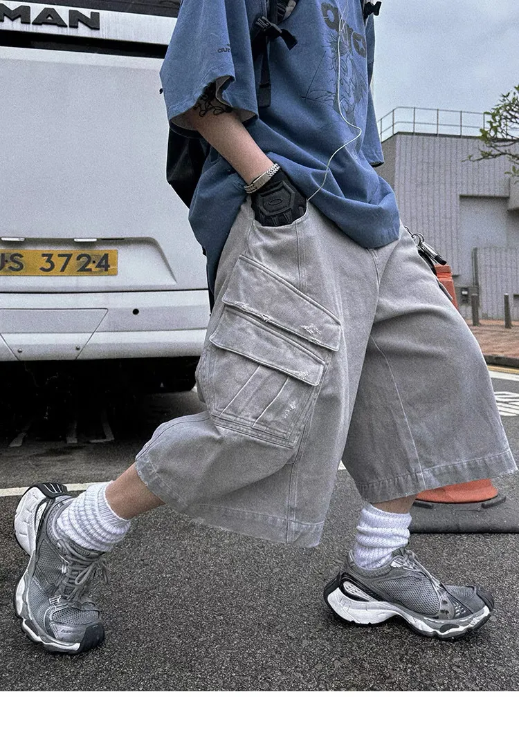 AUROCEAN 雙口袋 做舊破壞 廓形工裝 七分褲(銀灰色)