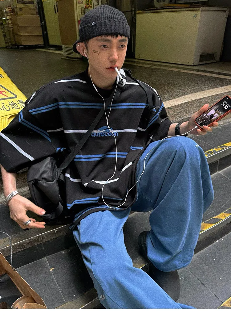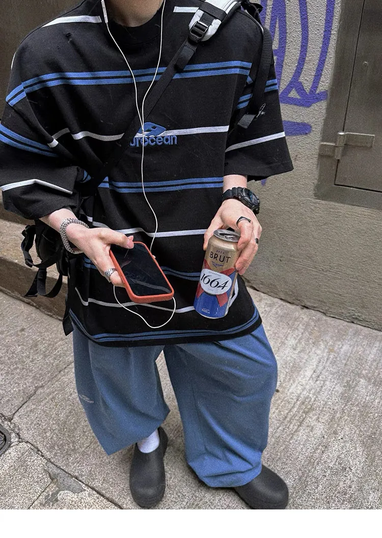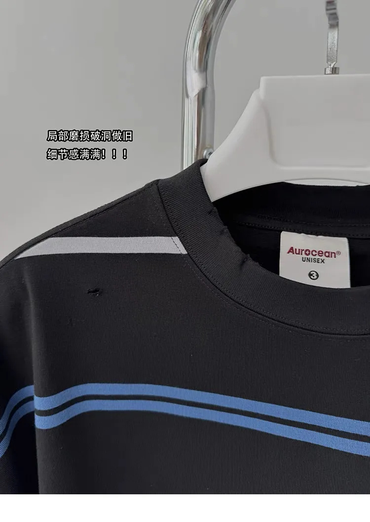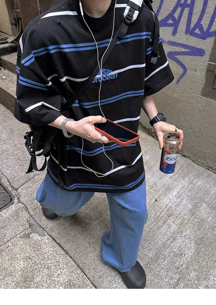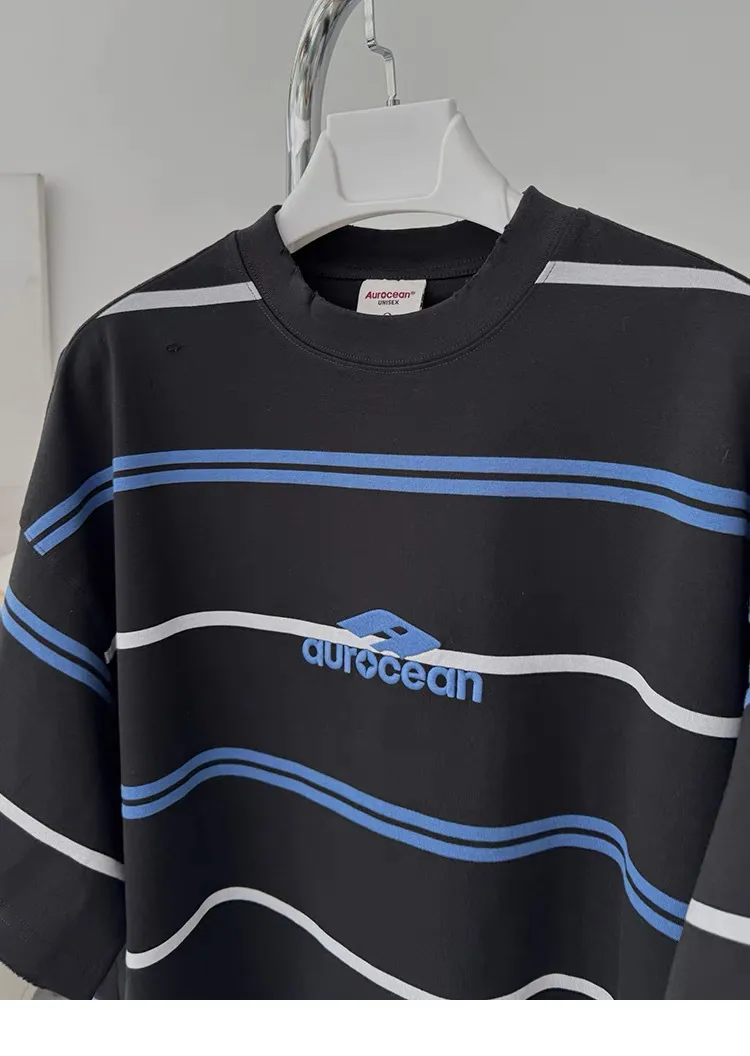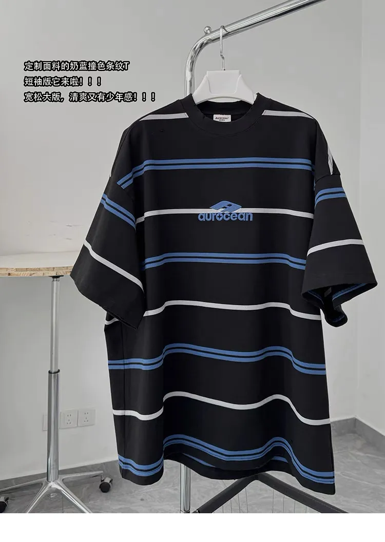 AUROCEAN 奶藍條紋 少年感 OVERSIZE 短袖(黑色)