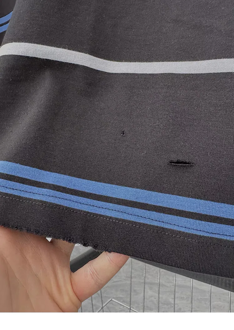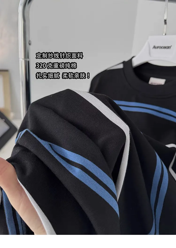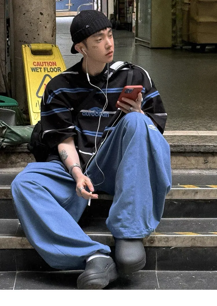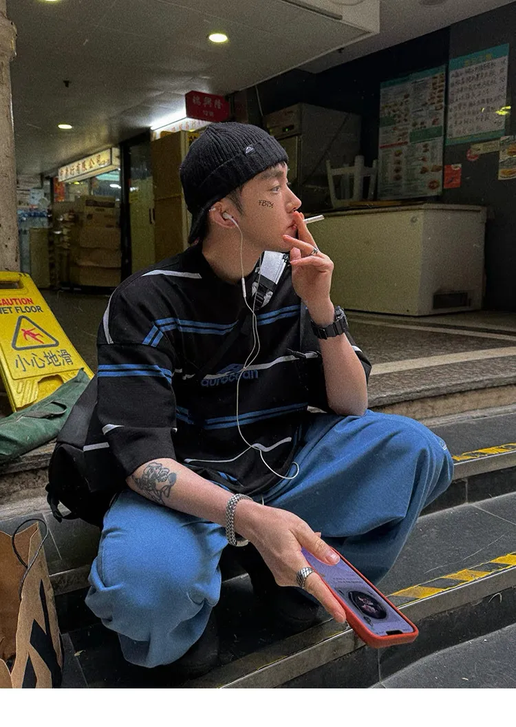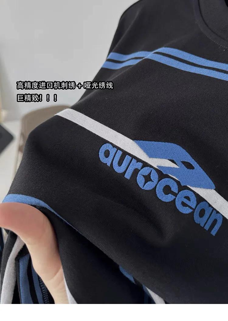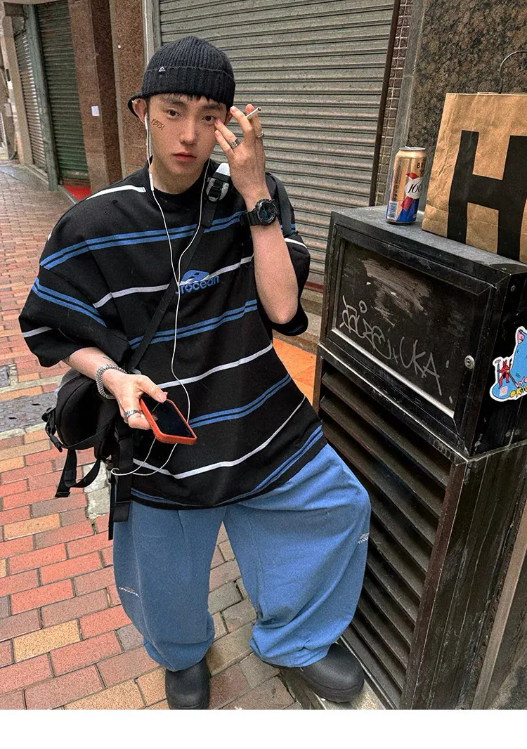 AUROCEAN 奶藍條紋 少年感 OVERSIZE 短袖(黑色)