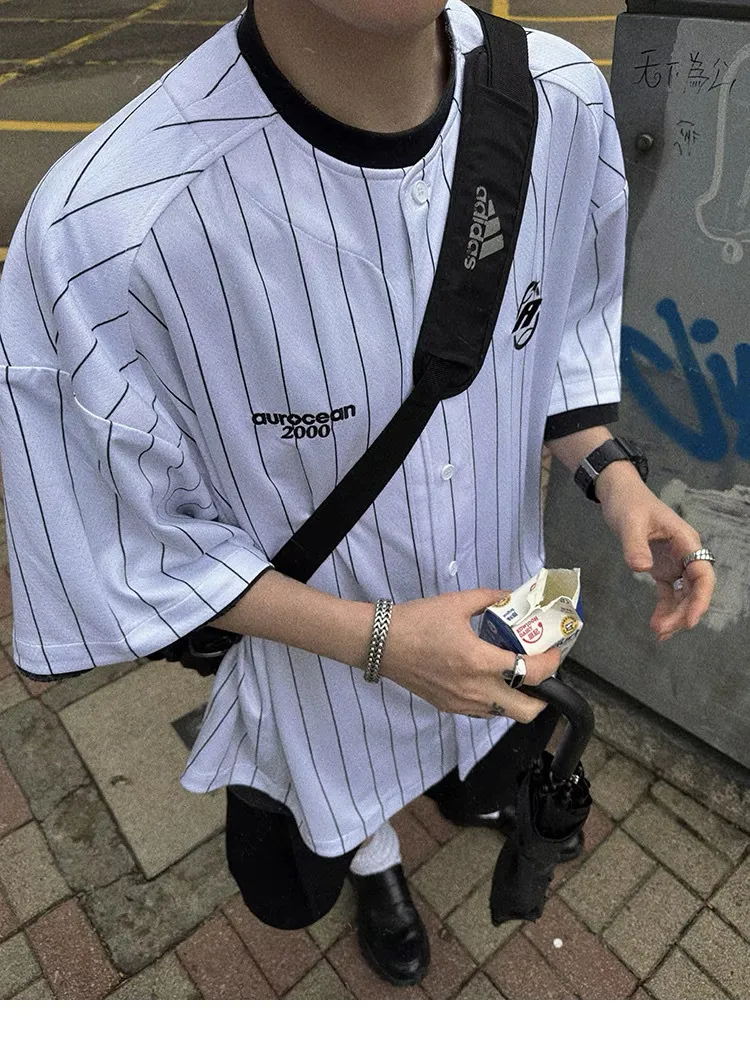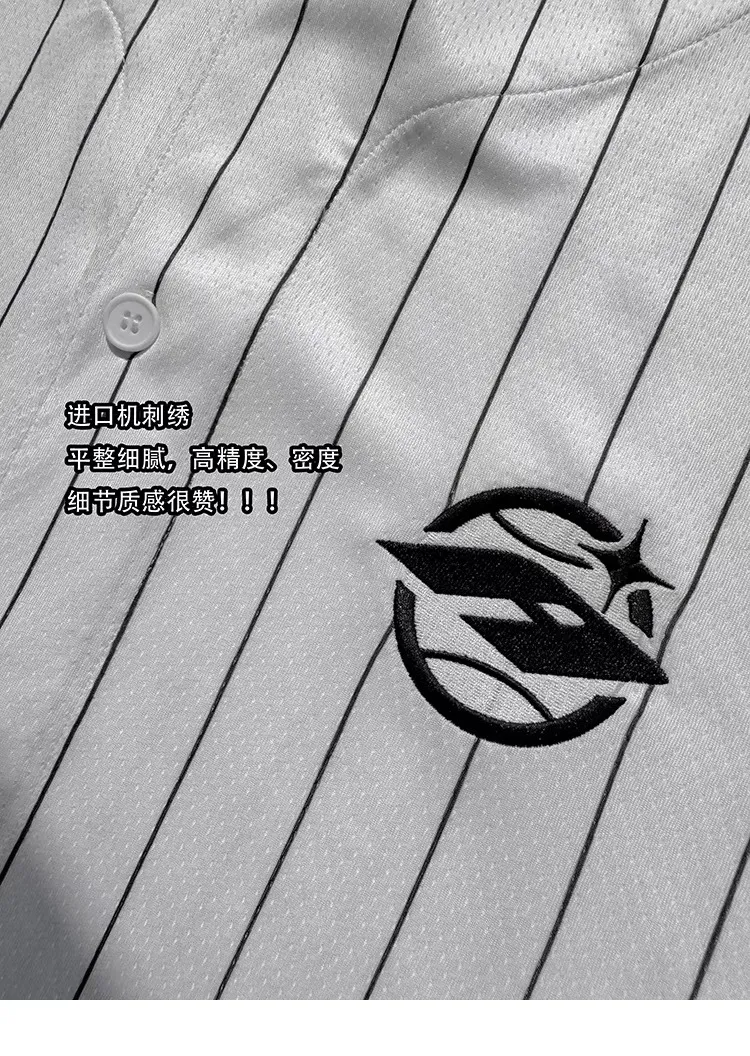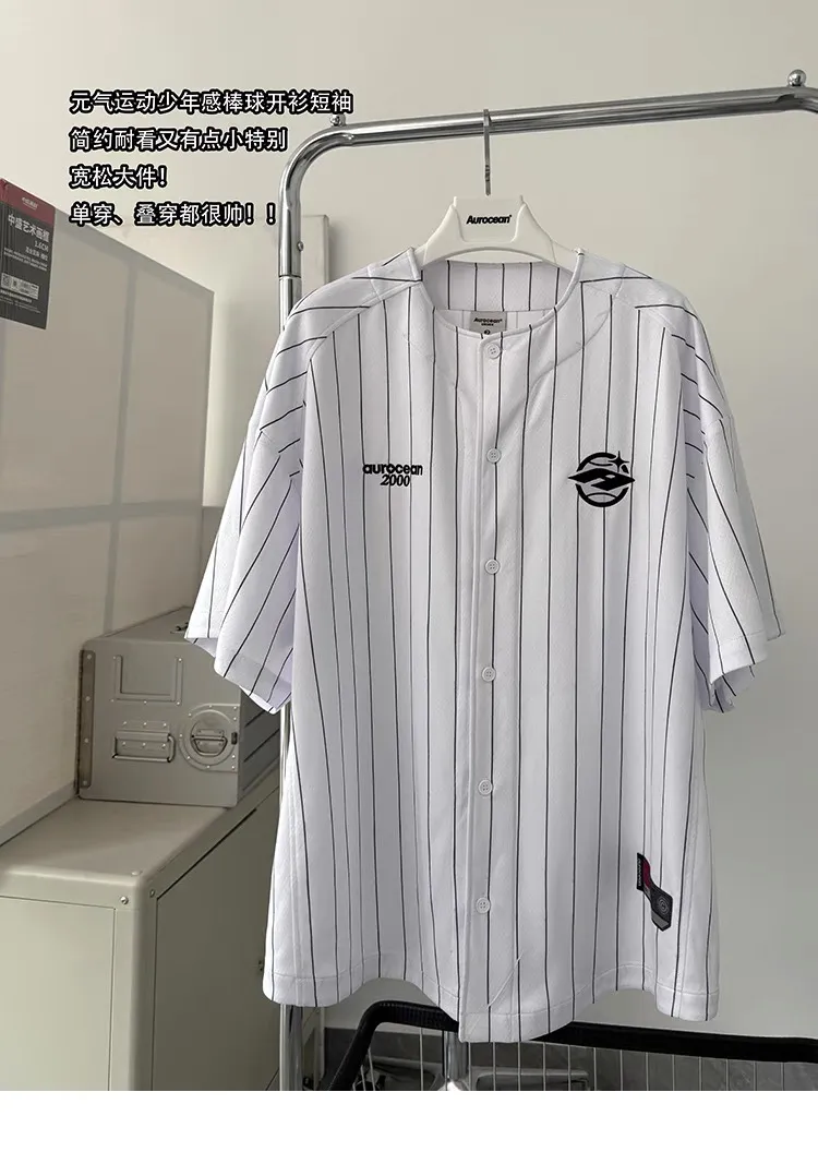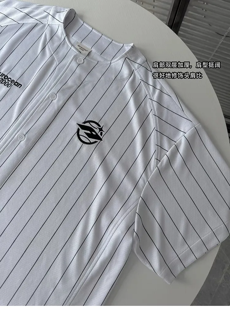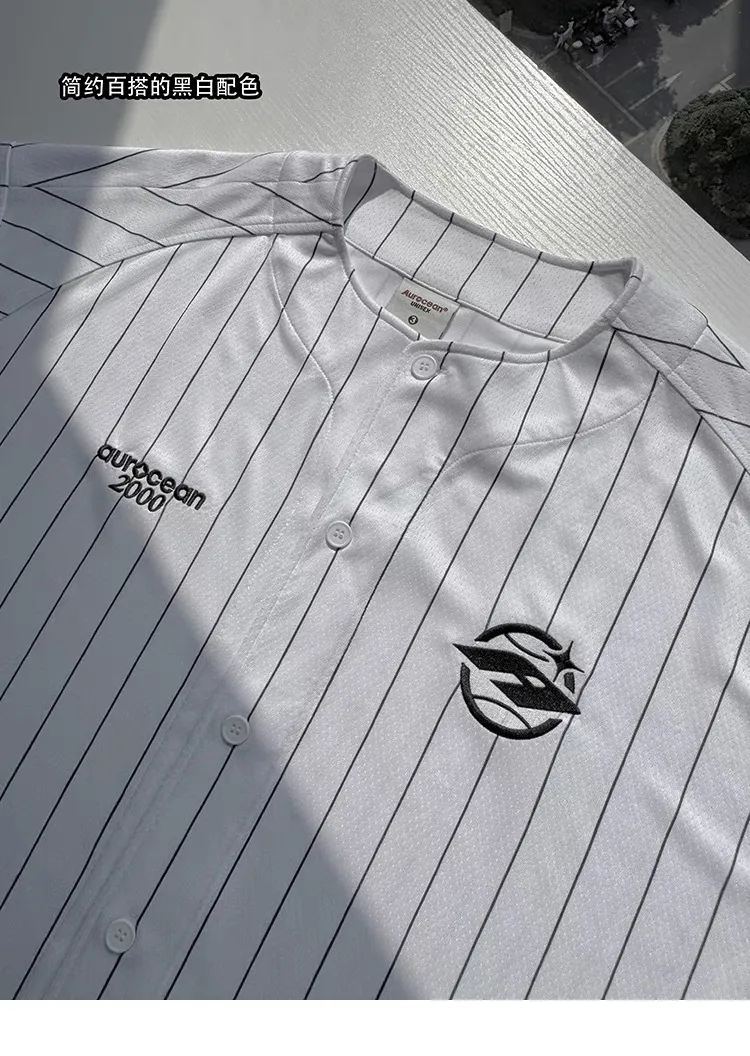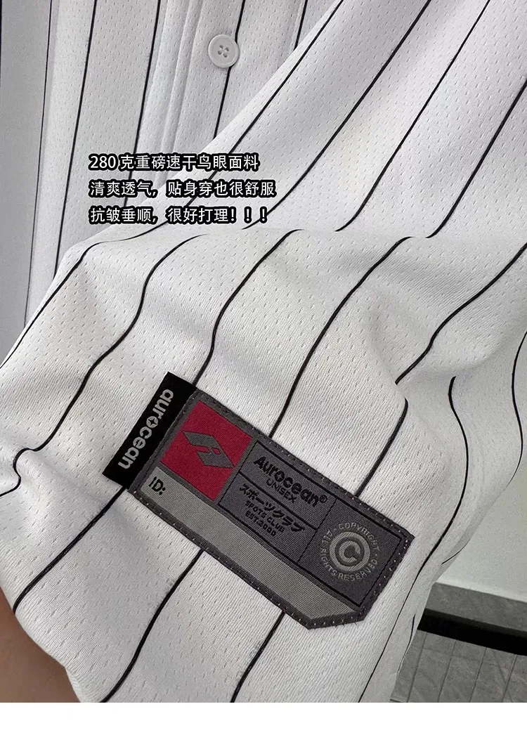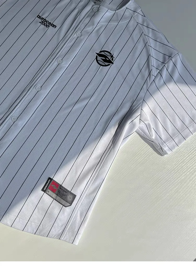 AUROCEAN 棒球徽章 條紋大版 速乾鳥眼 球衣 短袖(白色)