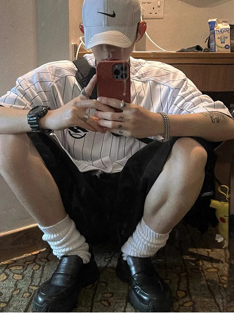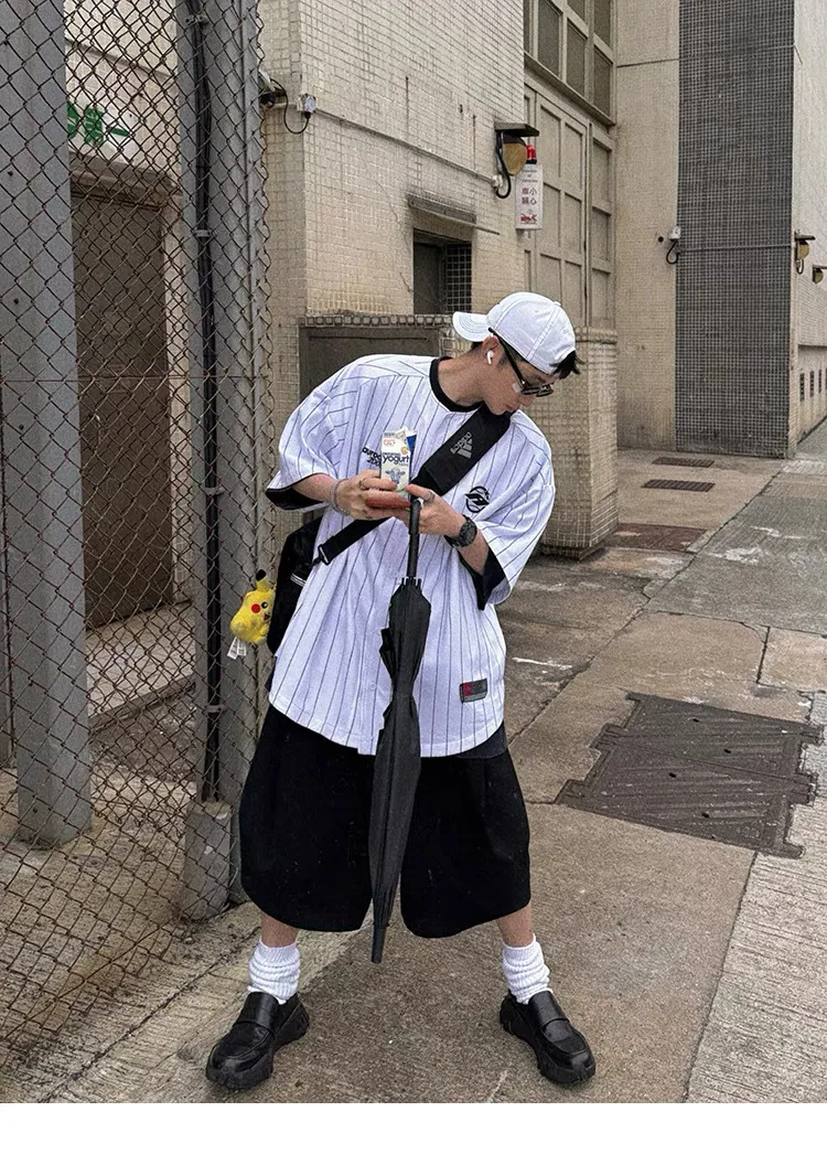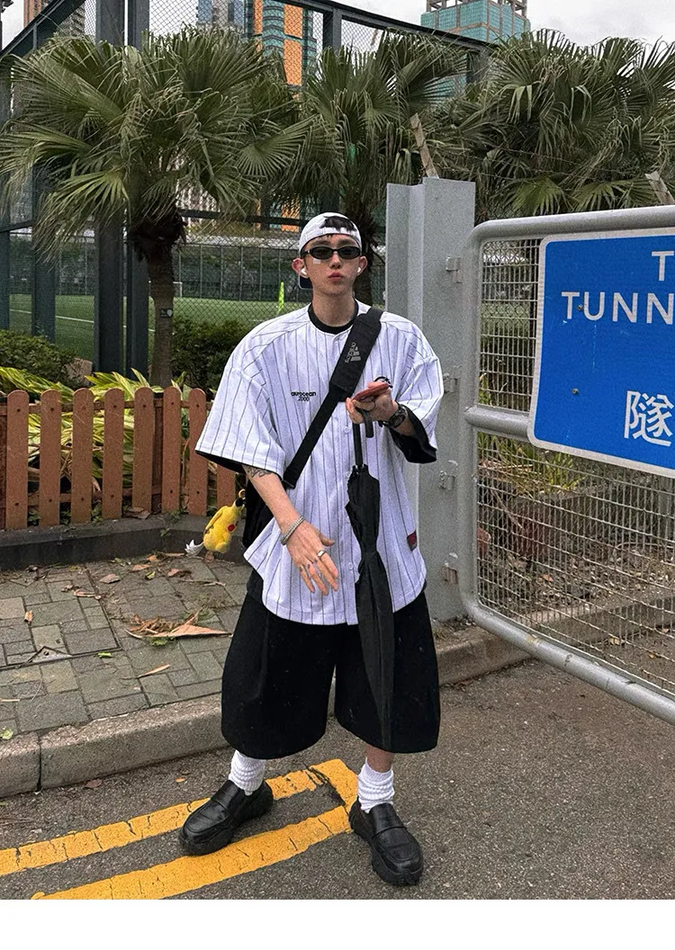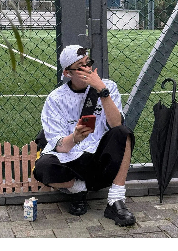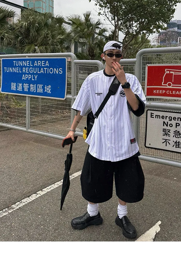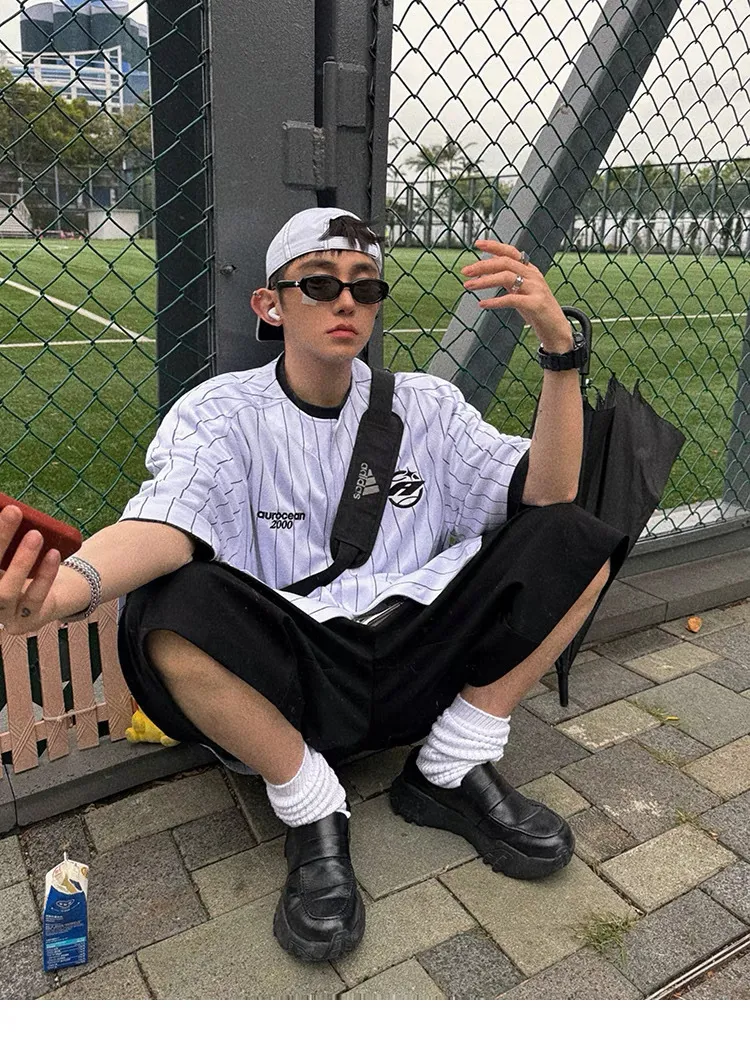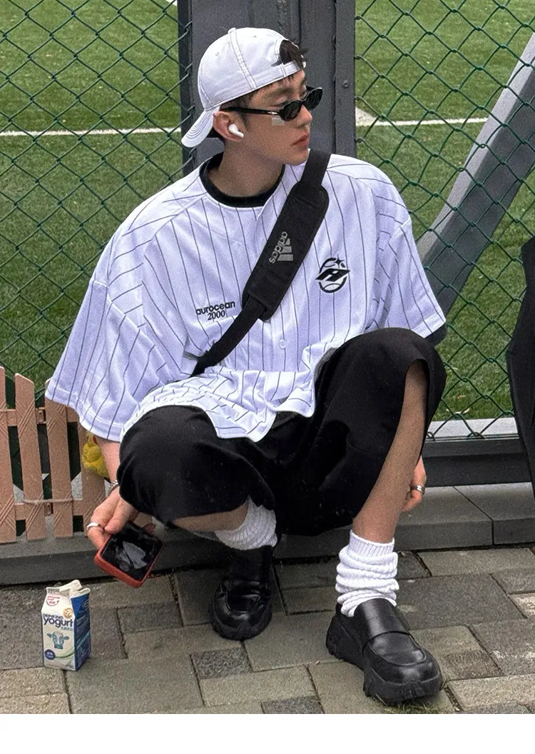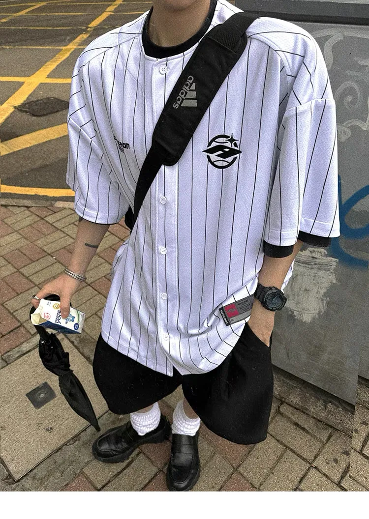 AUROCEAN 棒球徽章 條紋大版 速乾鳥眼 球衣 短袖(白色)