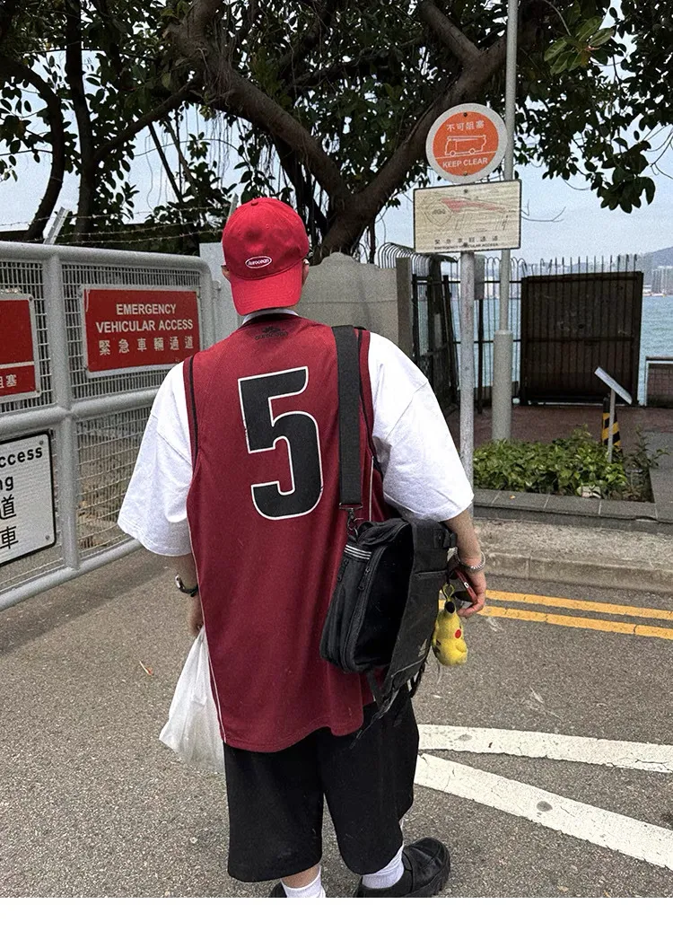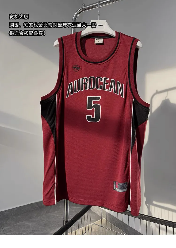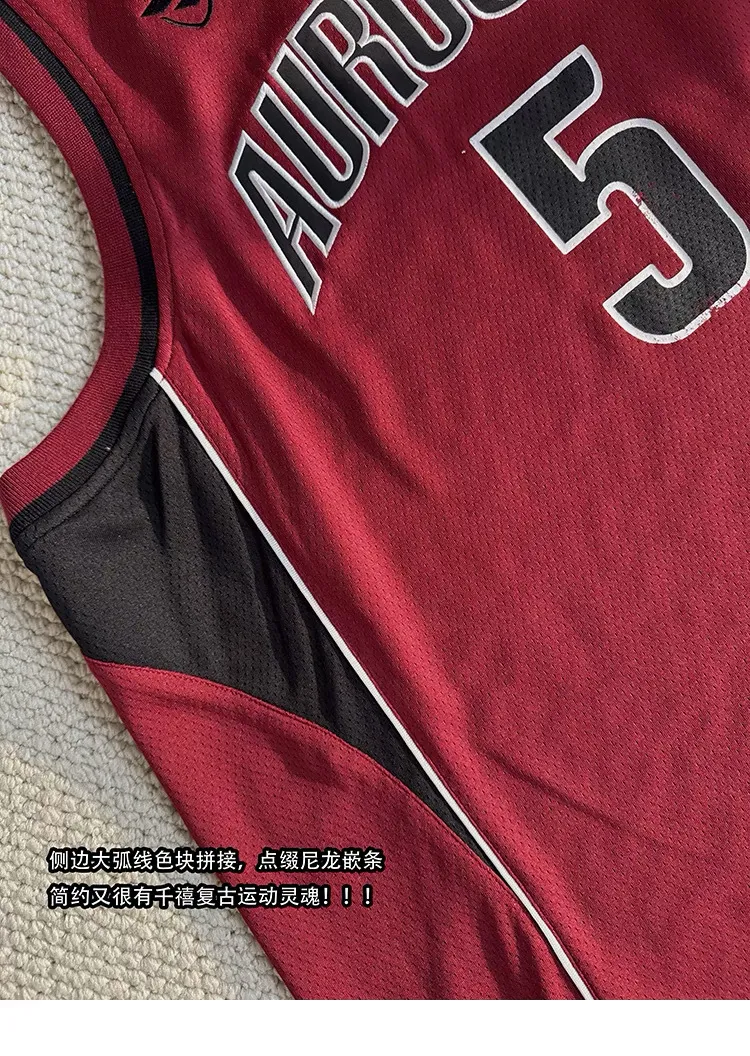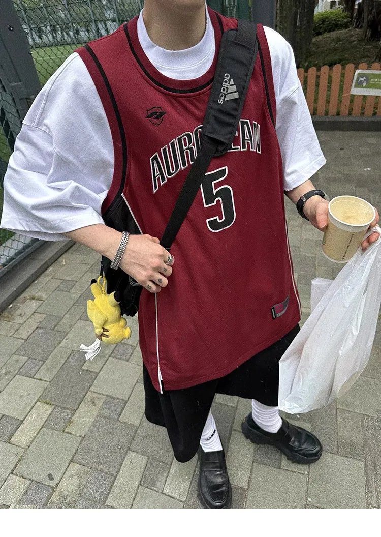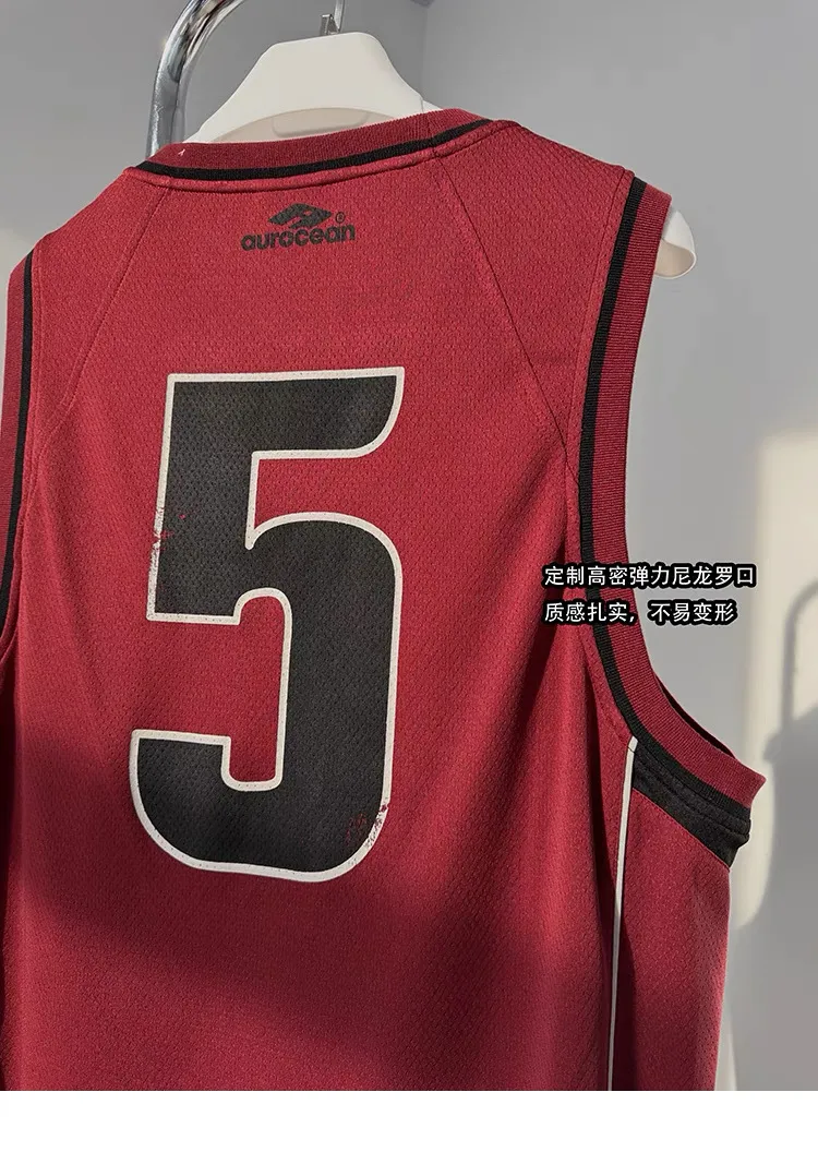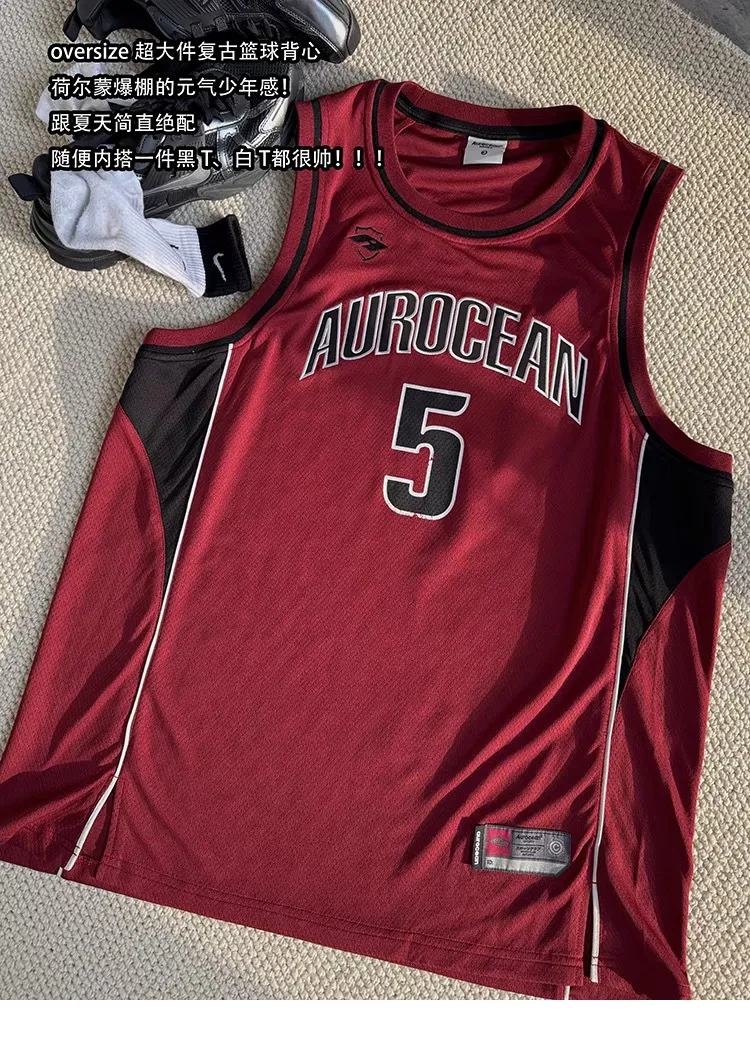 AUROCEAN 拼色復古 超大件 刺繡 球衣 背心(紅色)