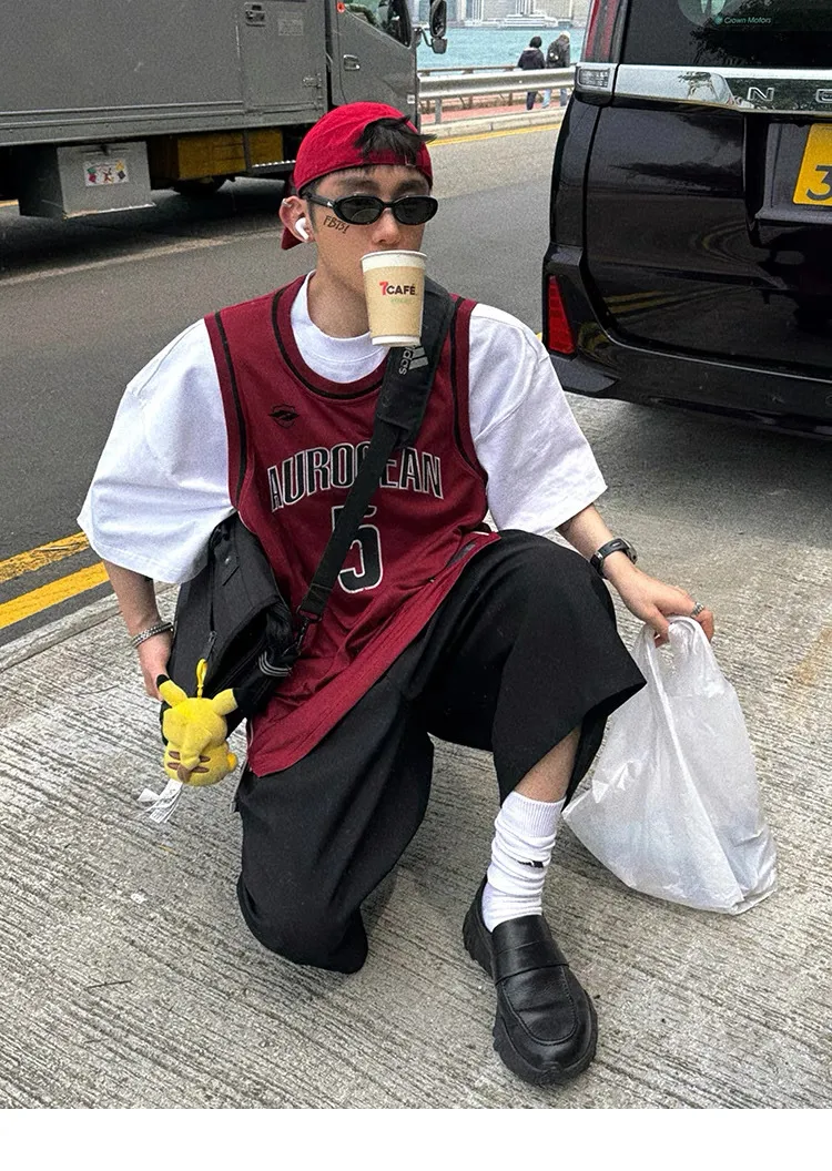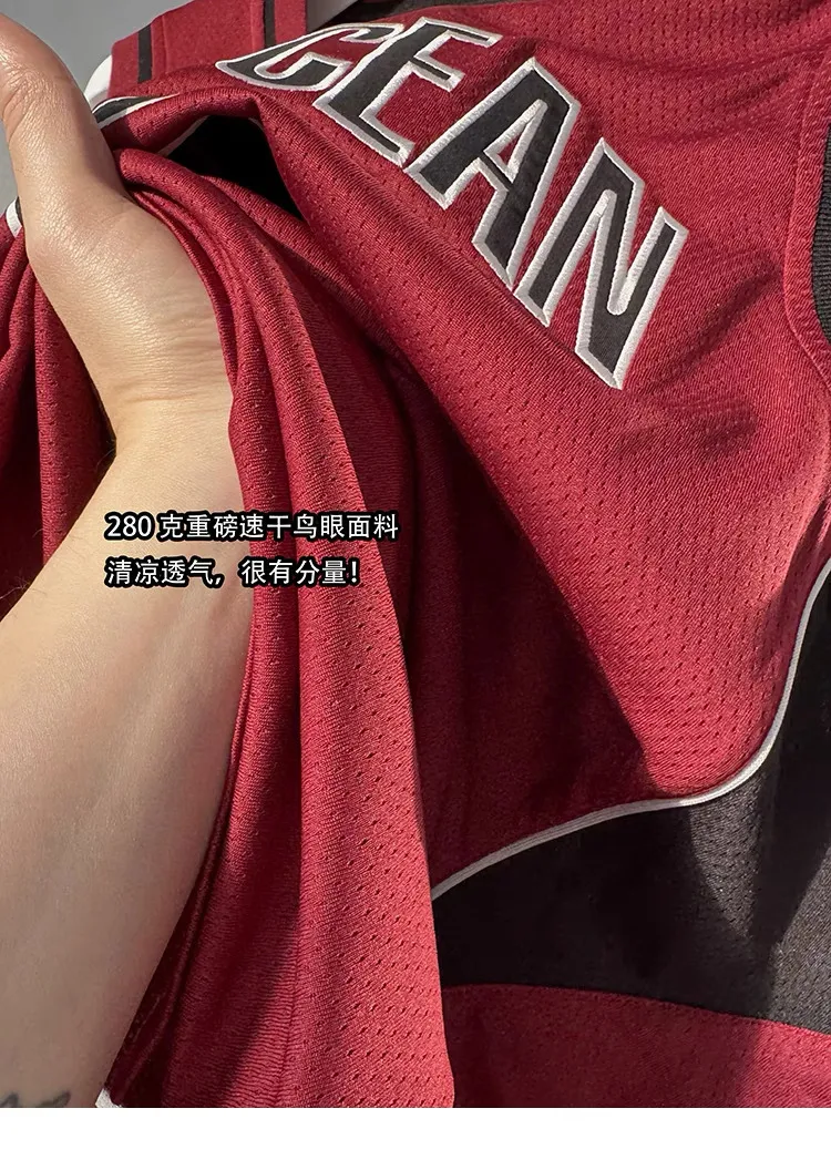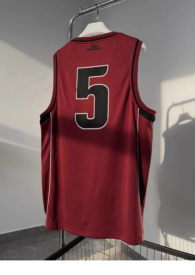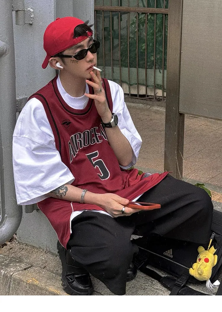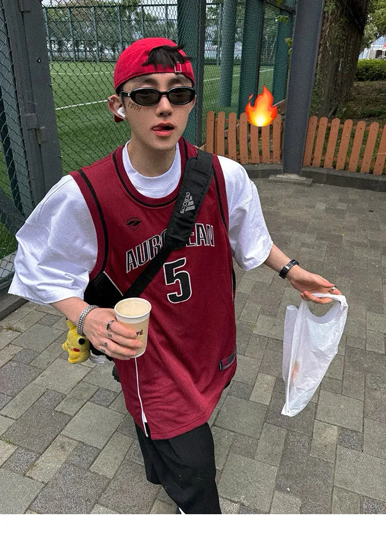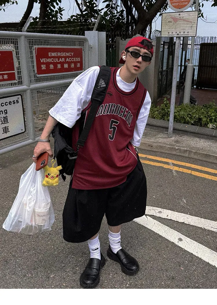 AUROCEAN 拼色復古 超大件 刺繡 球衣 背心(紅色)
