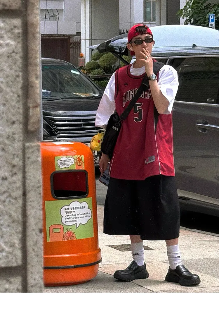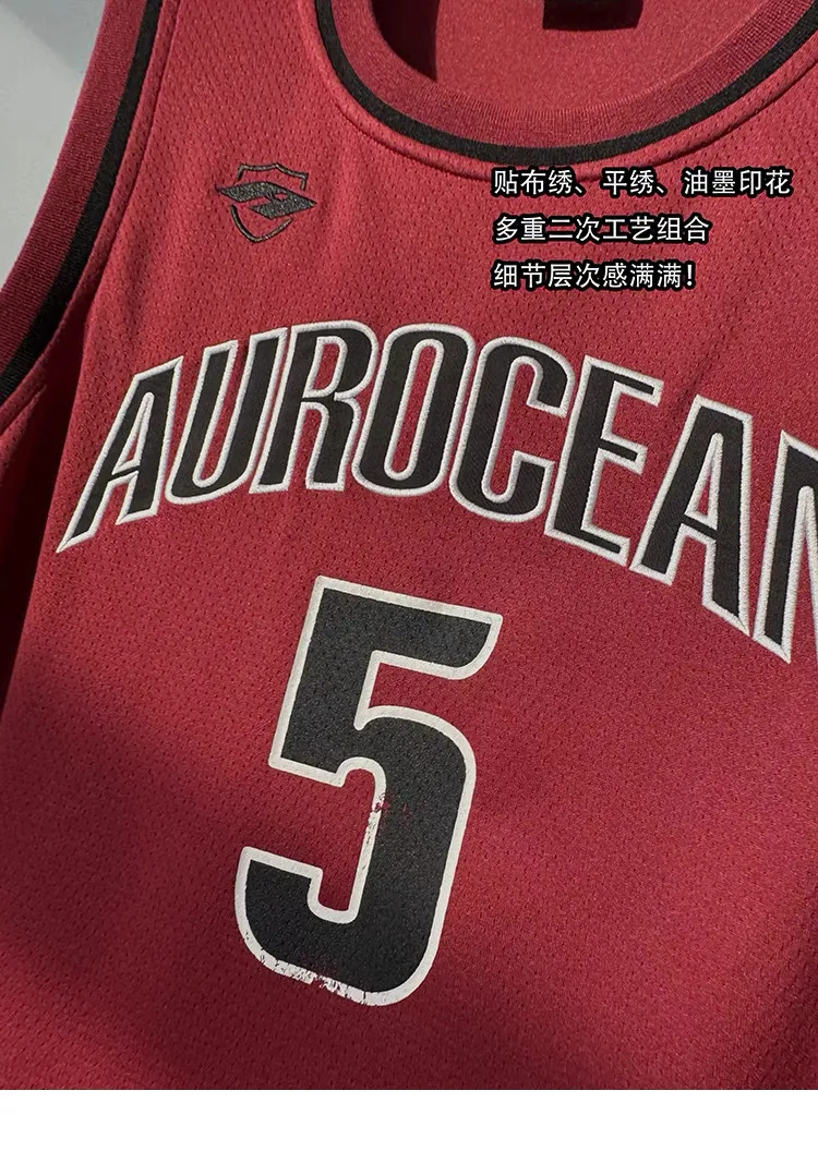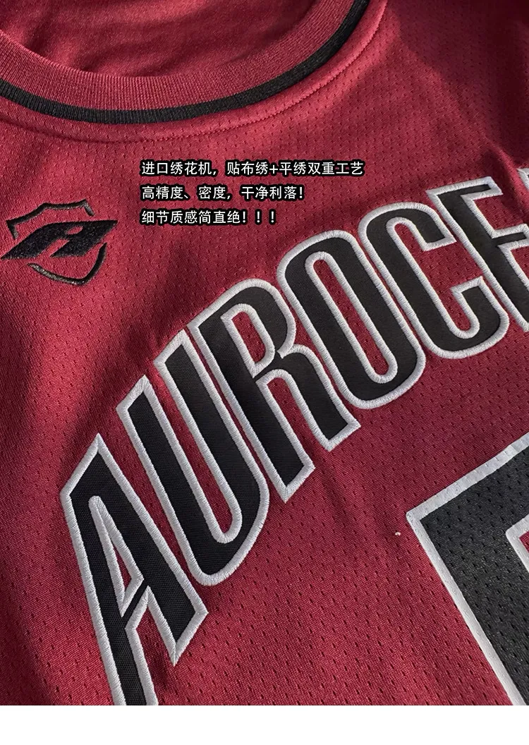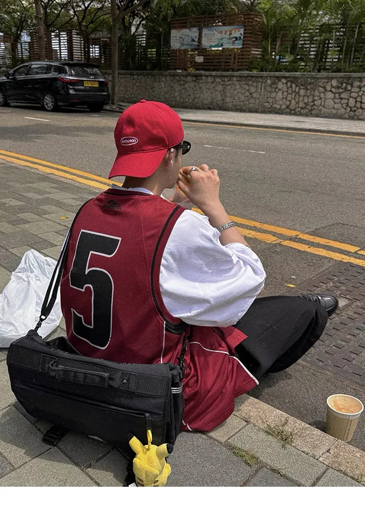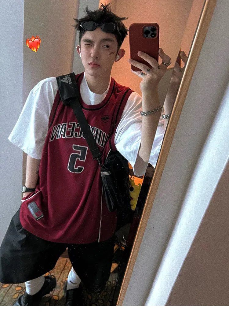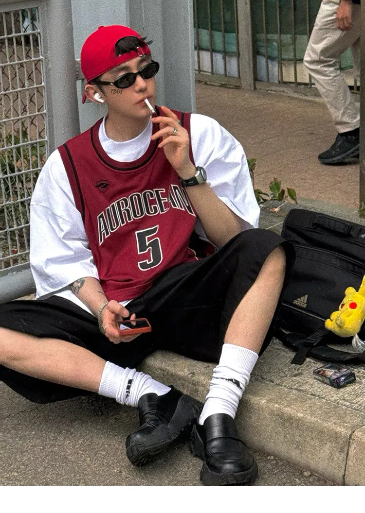 AUROCEAN 拼色復古 超大件 刺繡 球衣 背心(紅色)