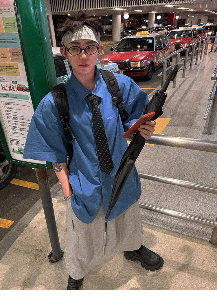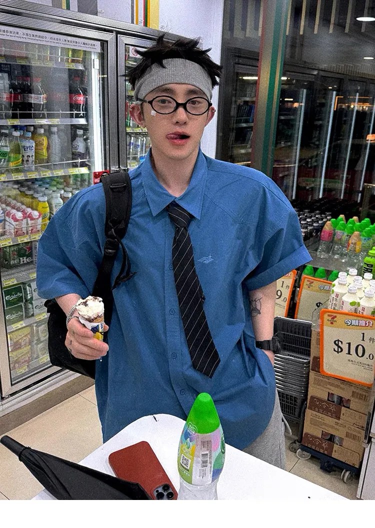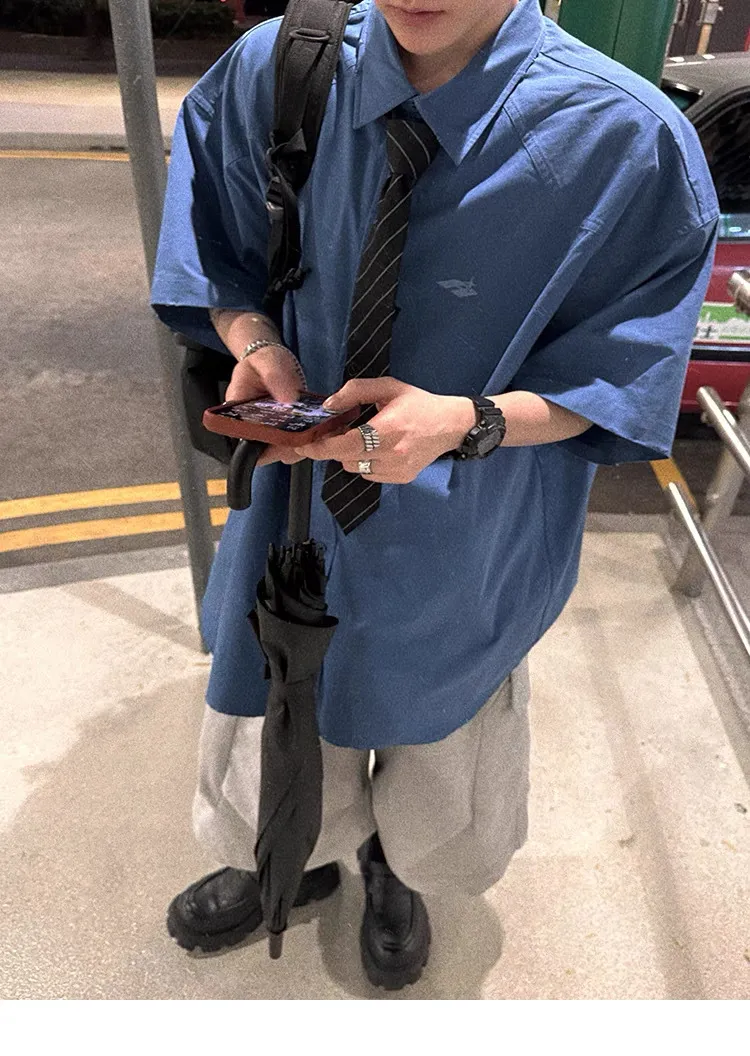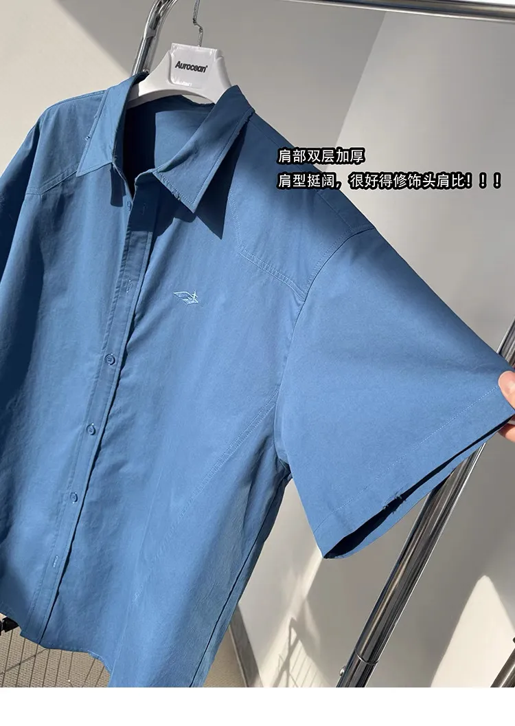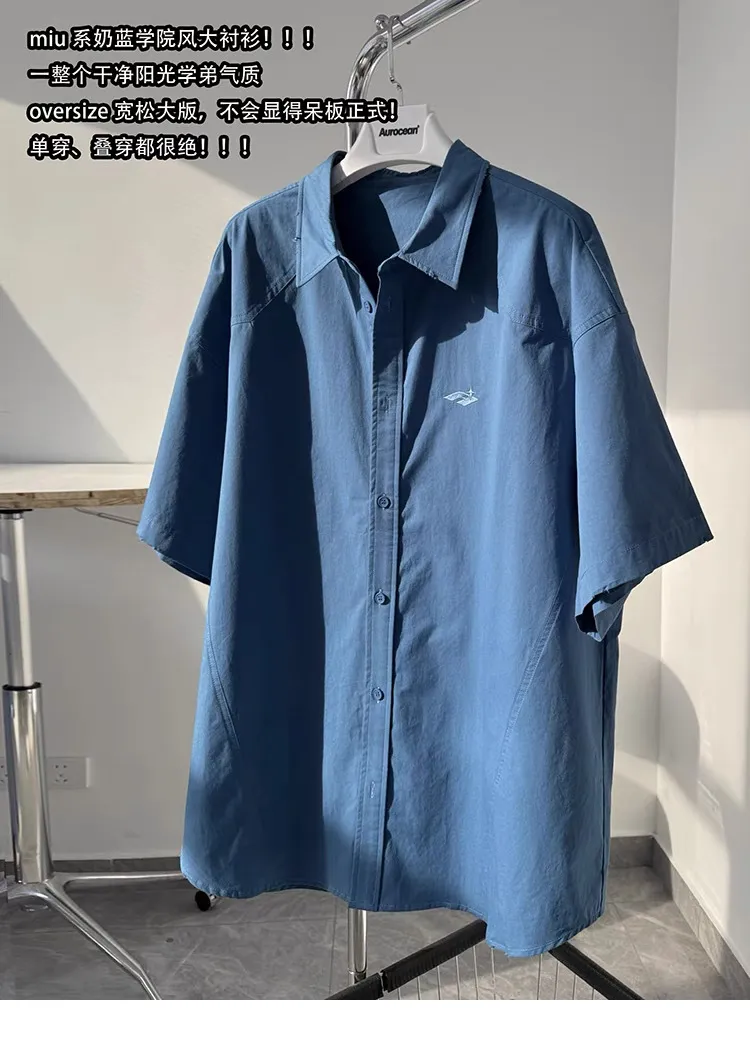 AUROCEAN 學院少年 寬肩廓形 做舊 襯衫(奶藍色)