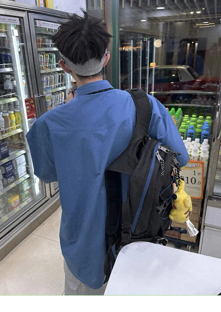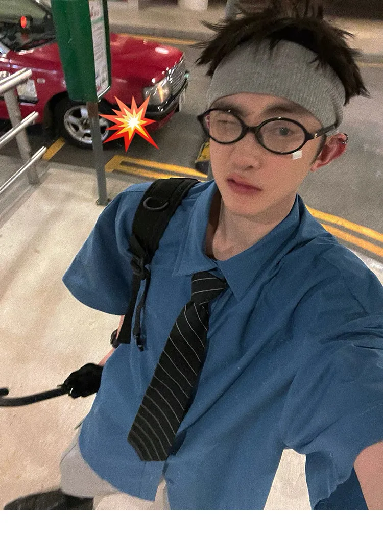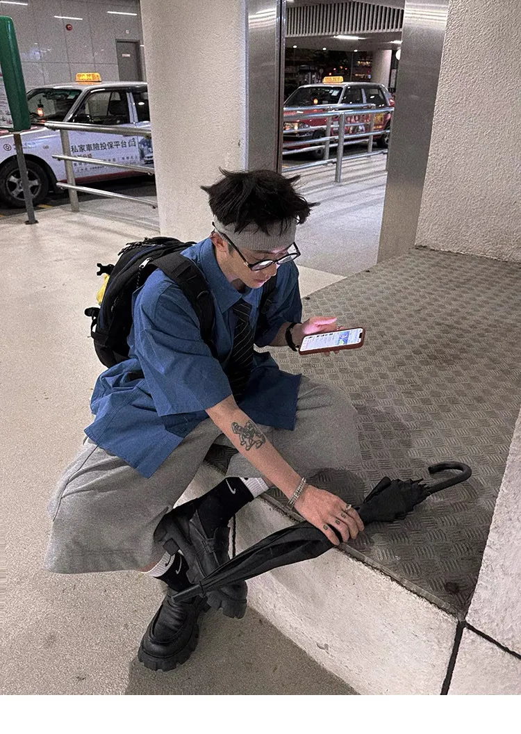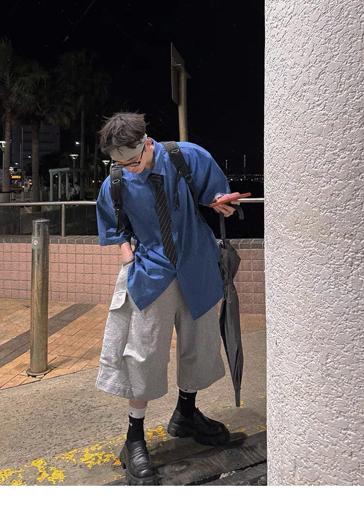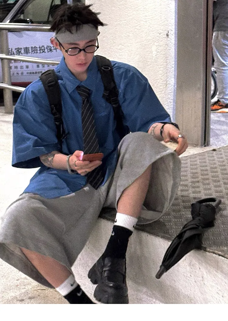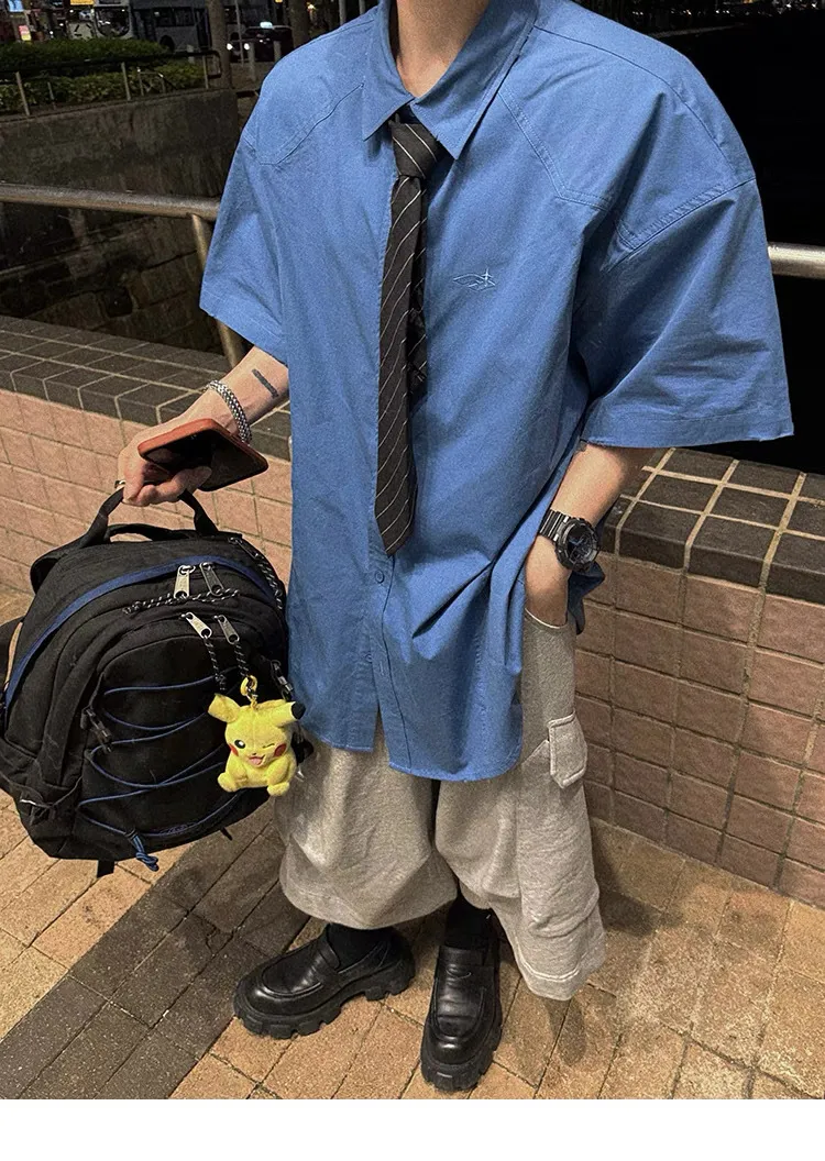 AUROCEAN 學院少年 寬肩廓形 做舊 襯衫(奶藍色)