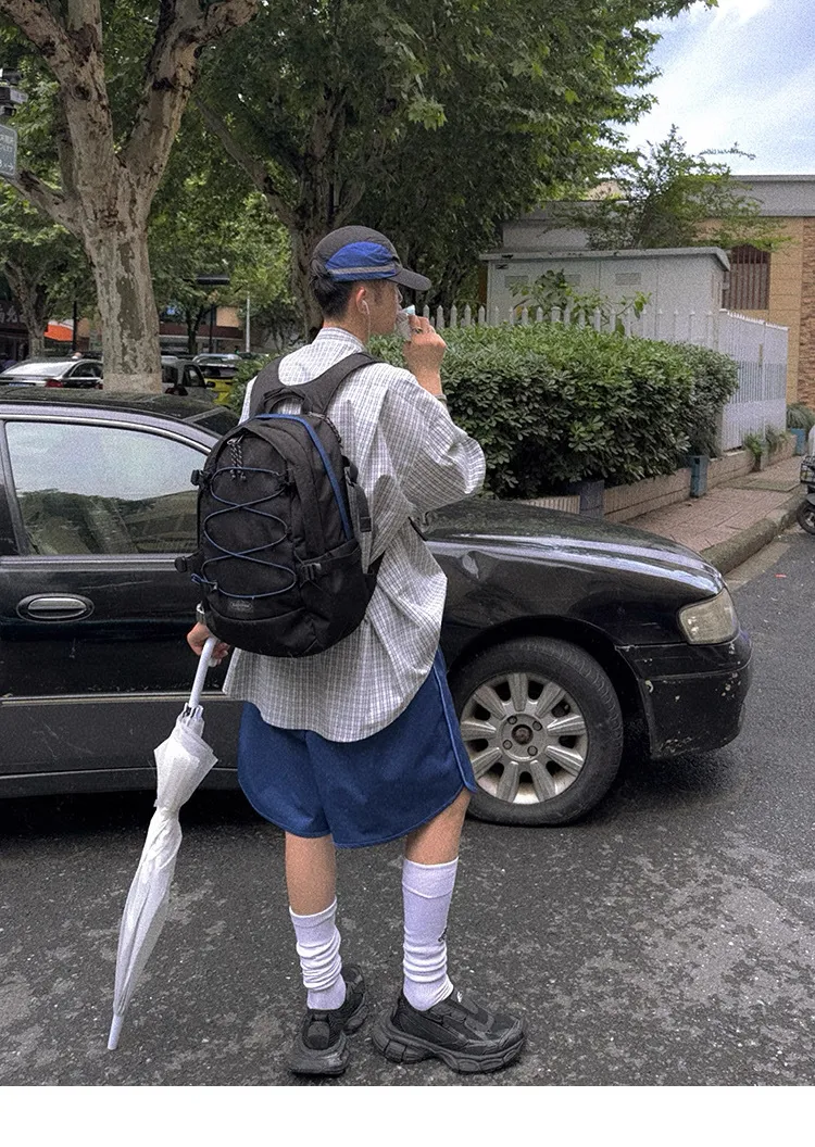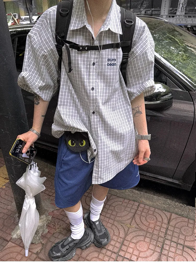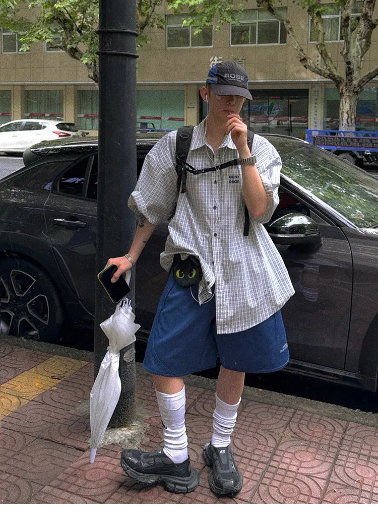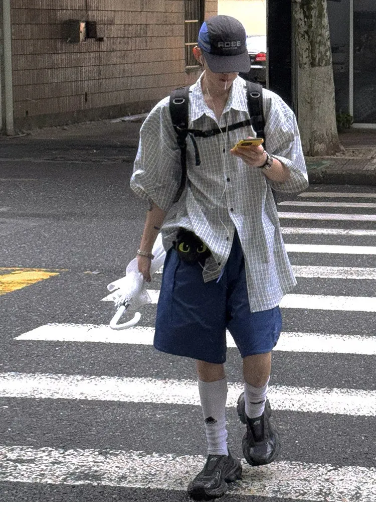 ARGUE 異材質拼接 連帽短袖 西裝褲 套裝(黑/灰)