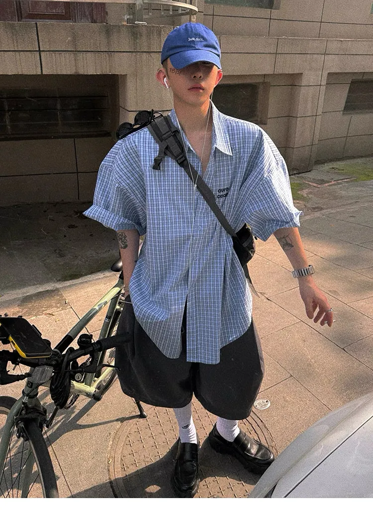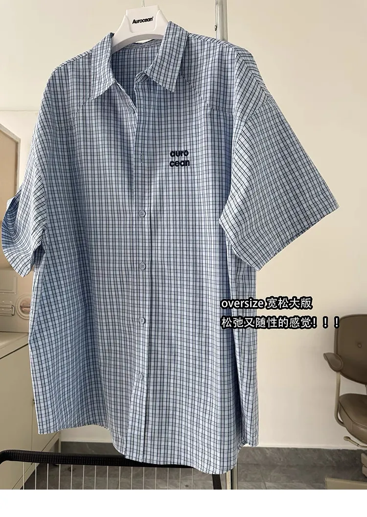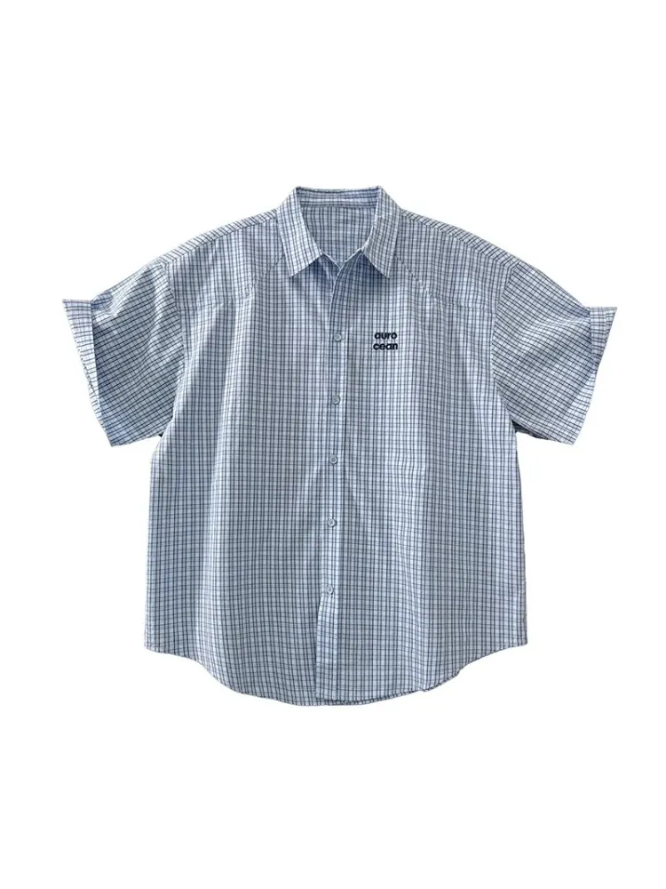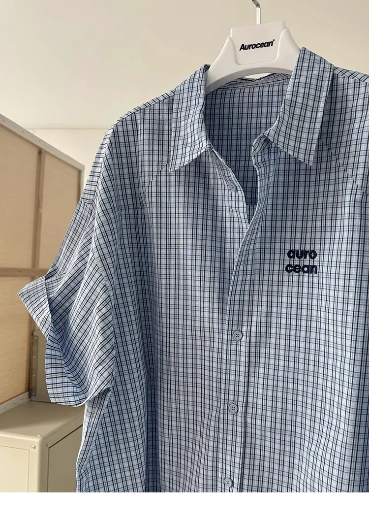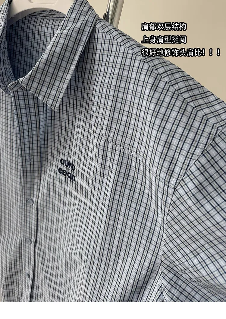 AUROCEAN 格紋肌理 撞色刺繡 寬肩 襯衫(奶藍)