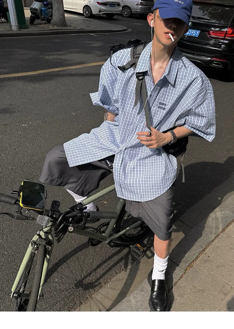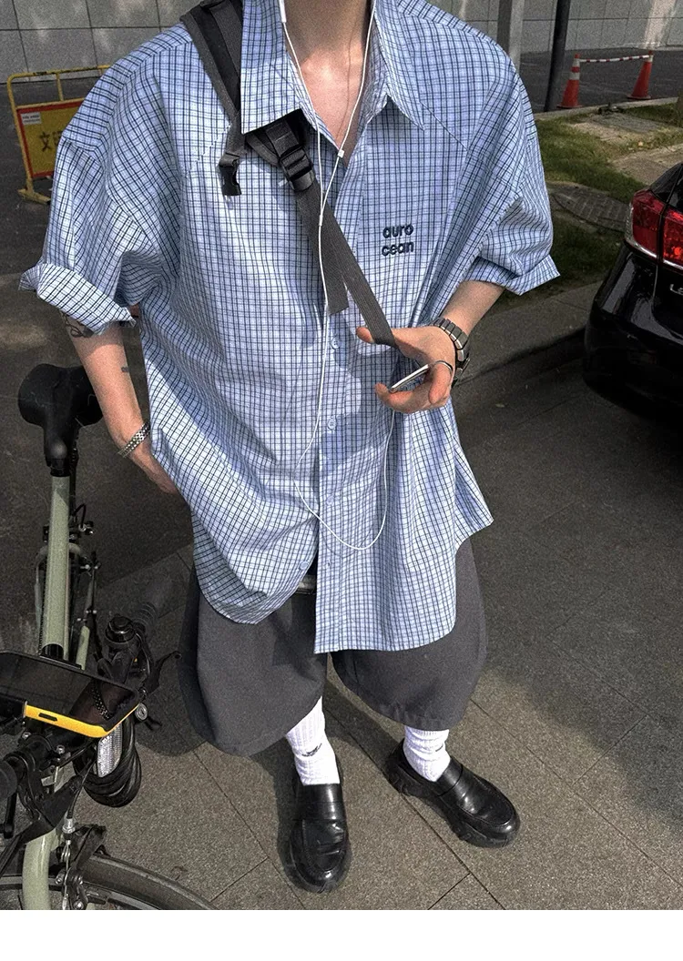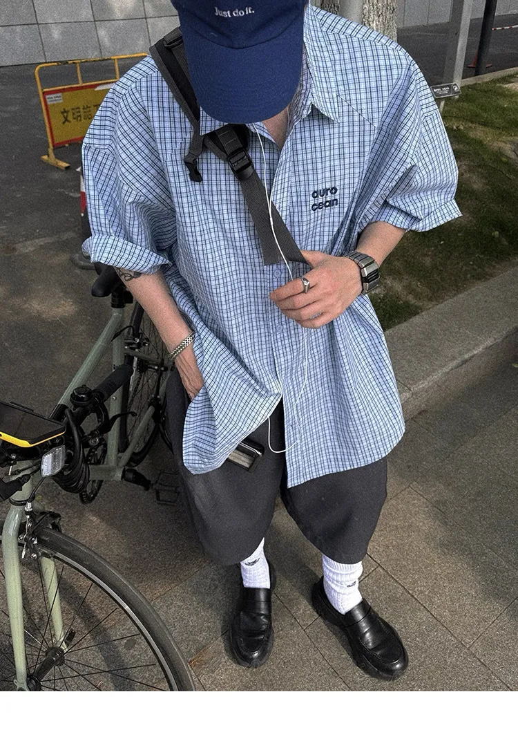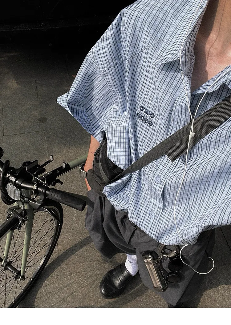 AUROCEAN 格紋肌理 撞色刺繡 寬肩 襯衫(奶藍)