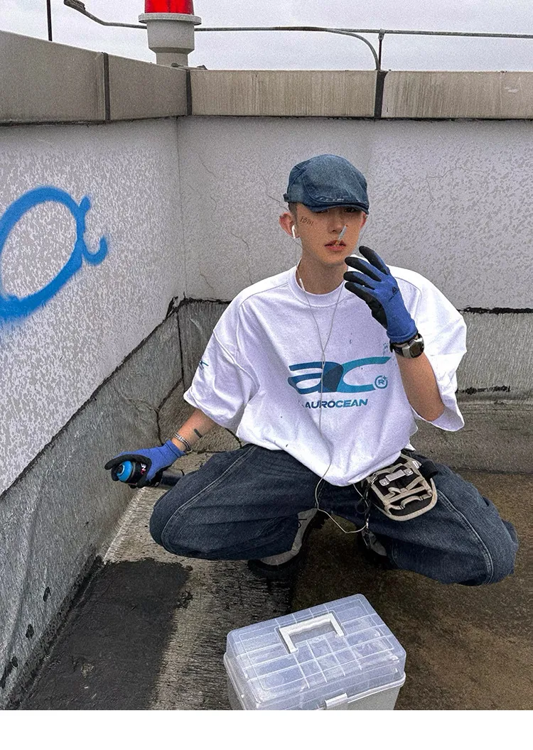 AUROCEAN 千禧少年 油墨印花 做舊破壞 短袖(灰白)