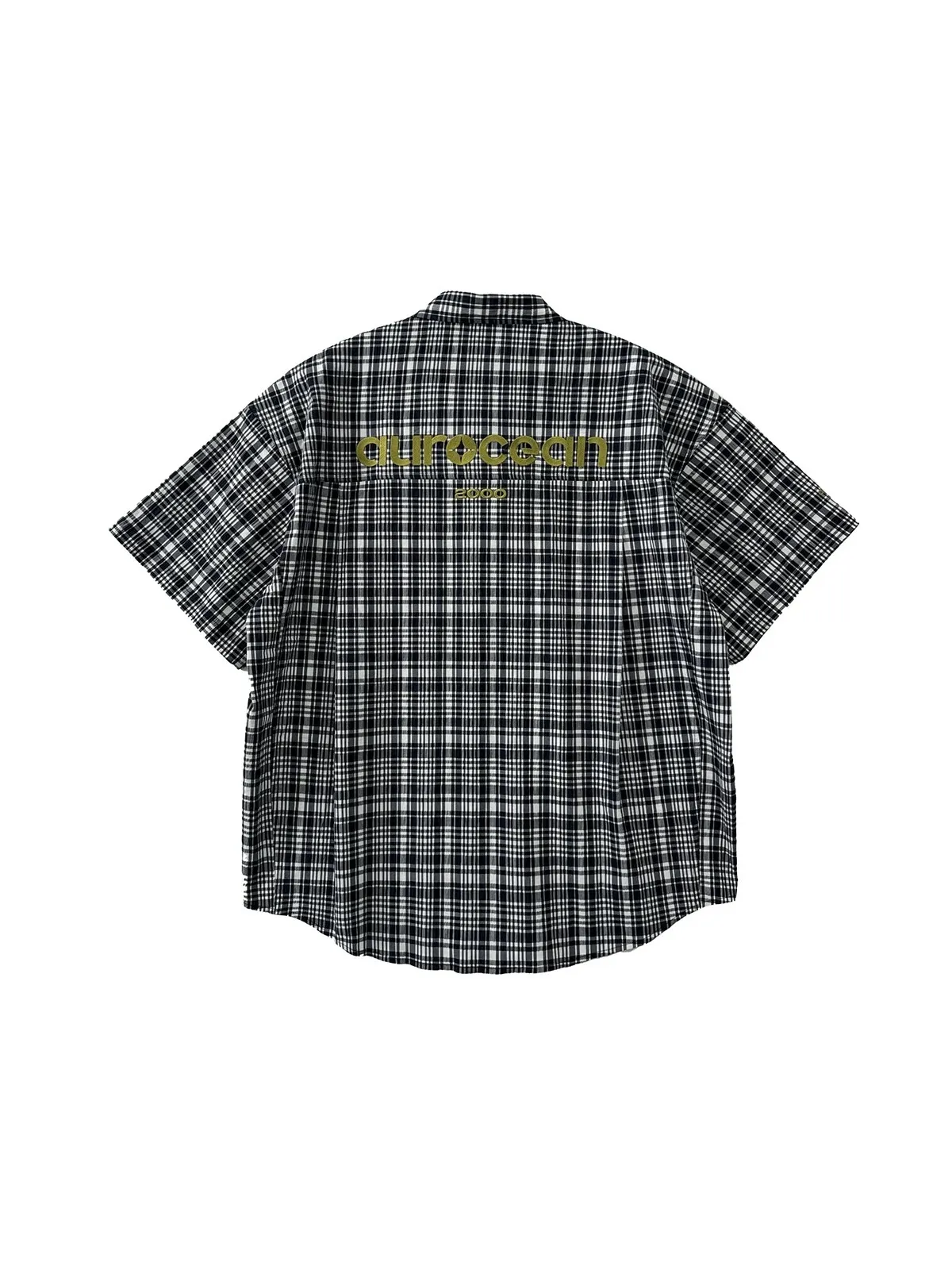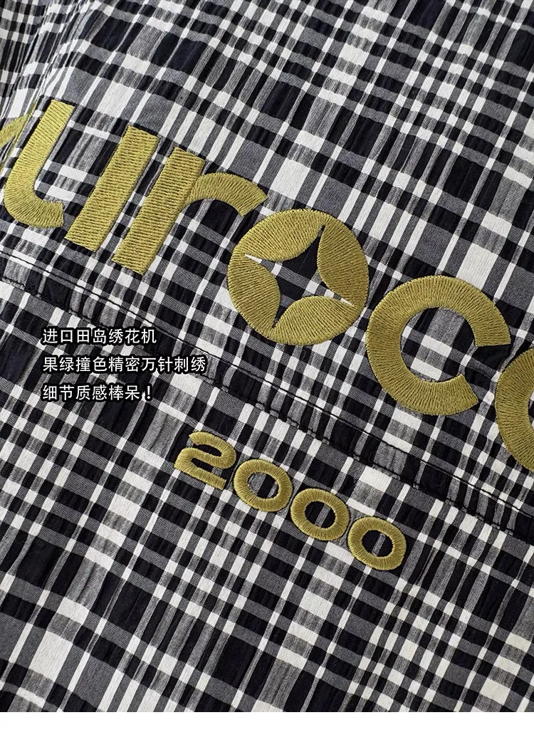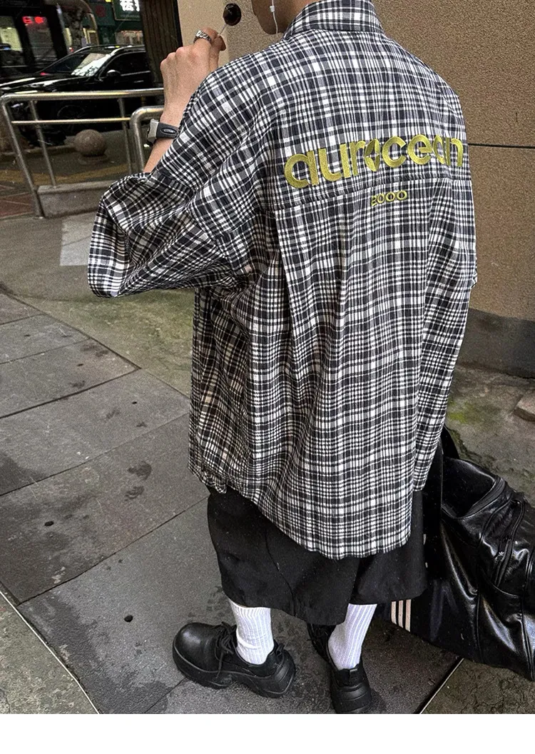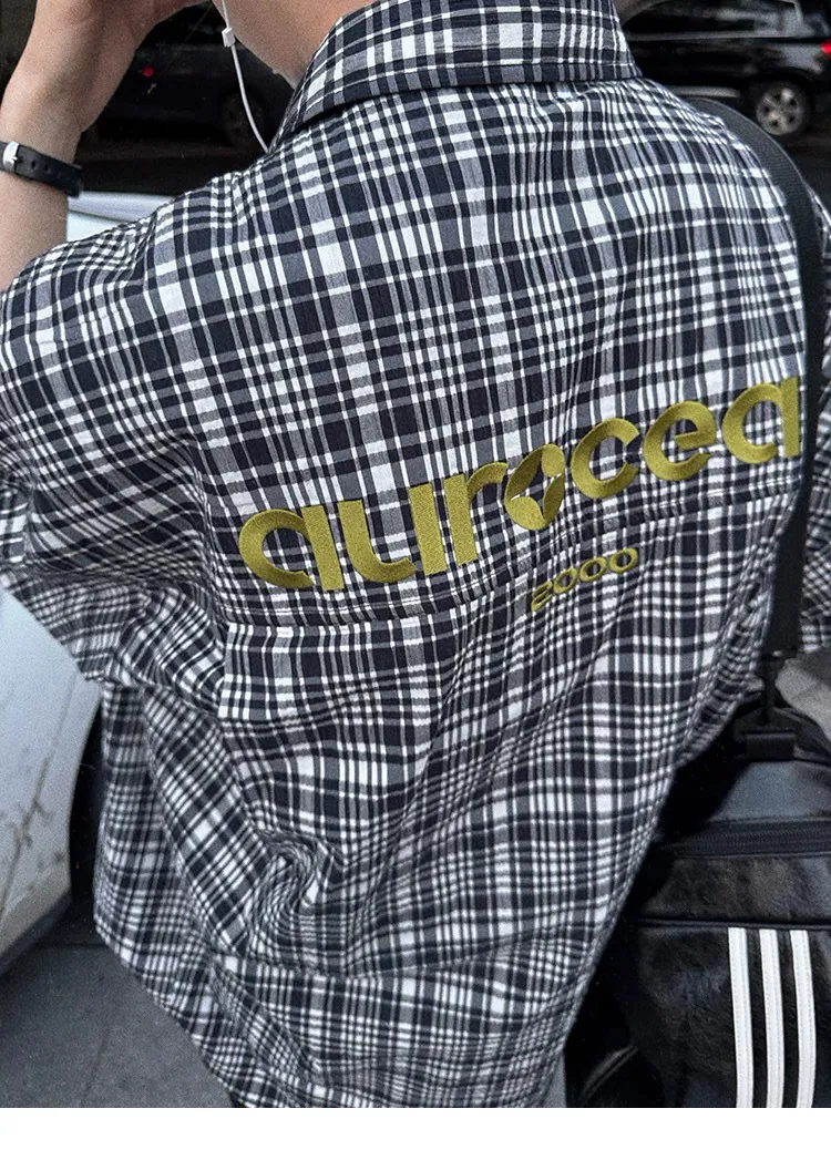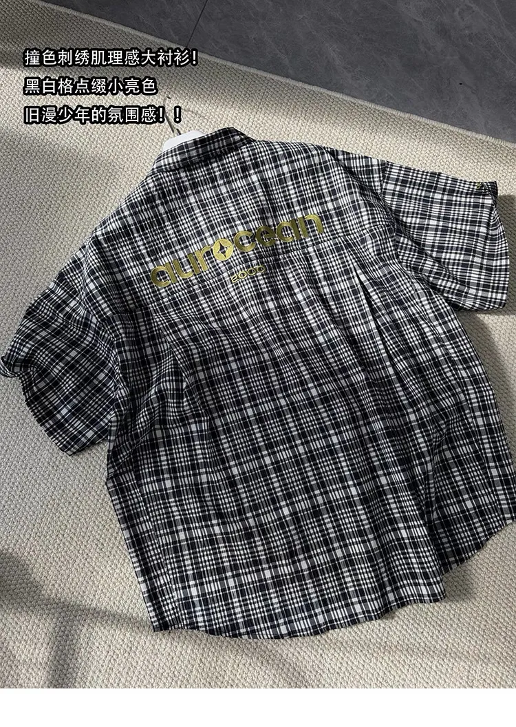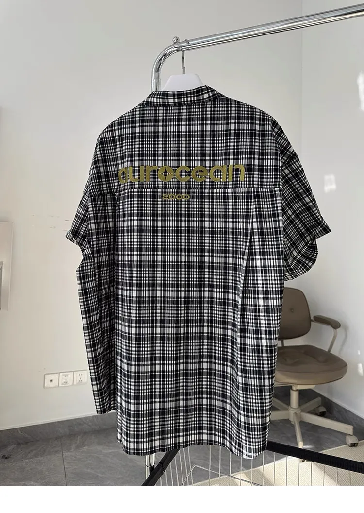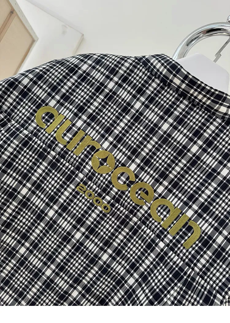 AUROCEAN 格紋肌理 撞色刺繡 寬肩 襯衫(黑色)